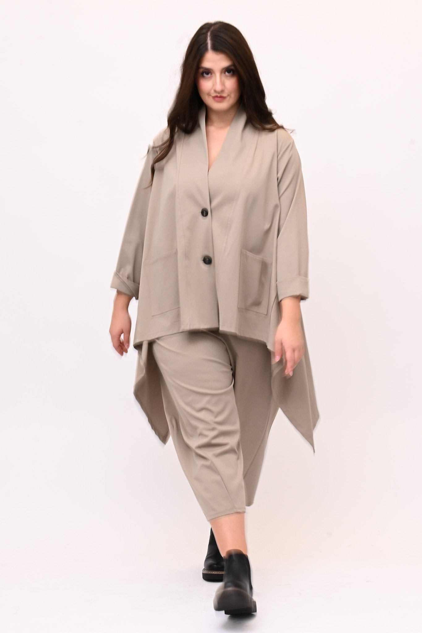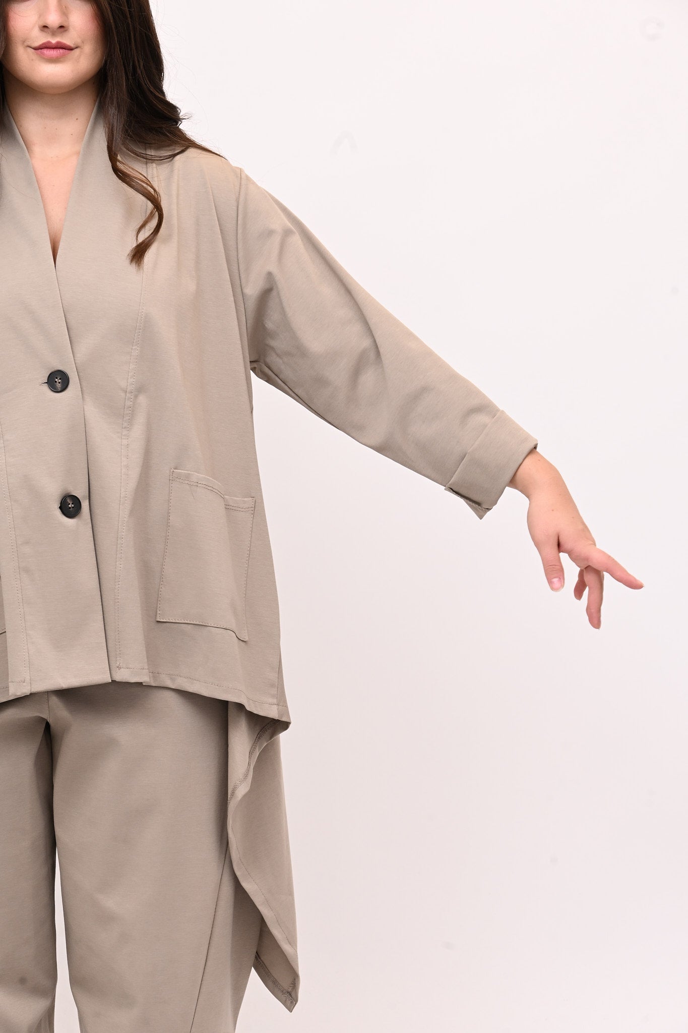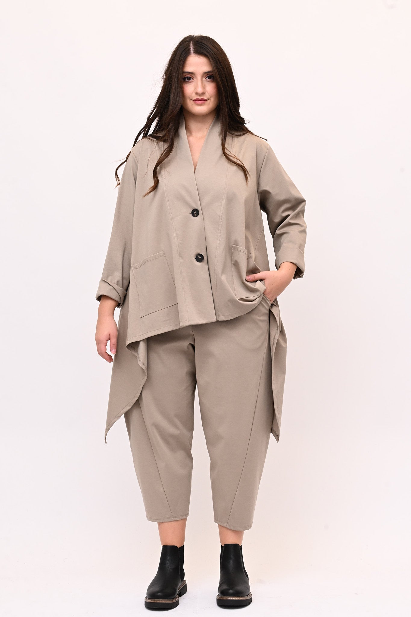Completo composto da: giacca modello frack senza rever, taglio svasato, più lunga dietro e pantalone modello crop con elastico in vita, pinces e tasche. Ideale per outfit pratici e sofisticati e look moderni che garantiscono comfort e una vestibilità perfetta.