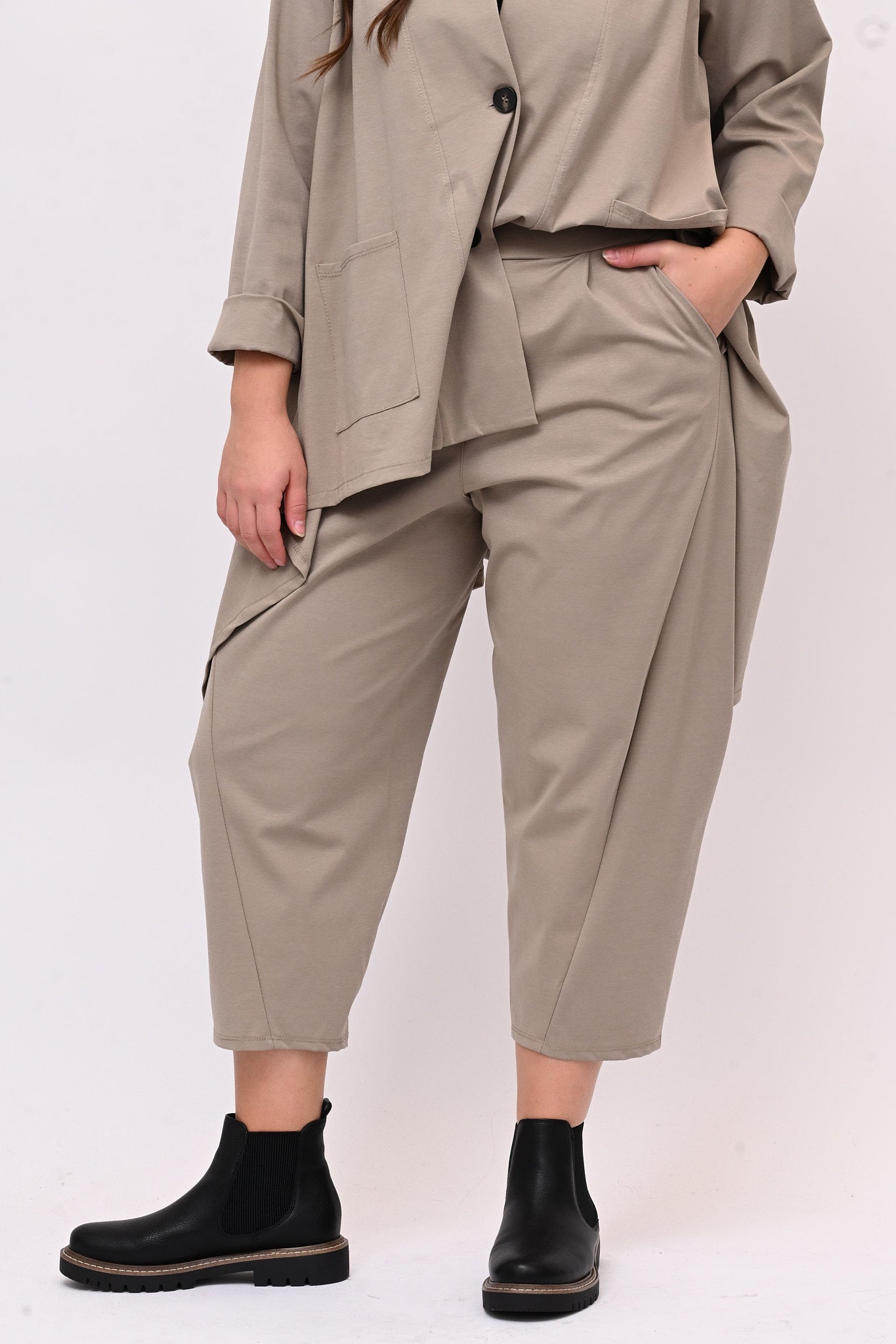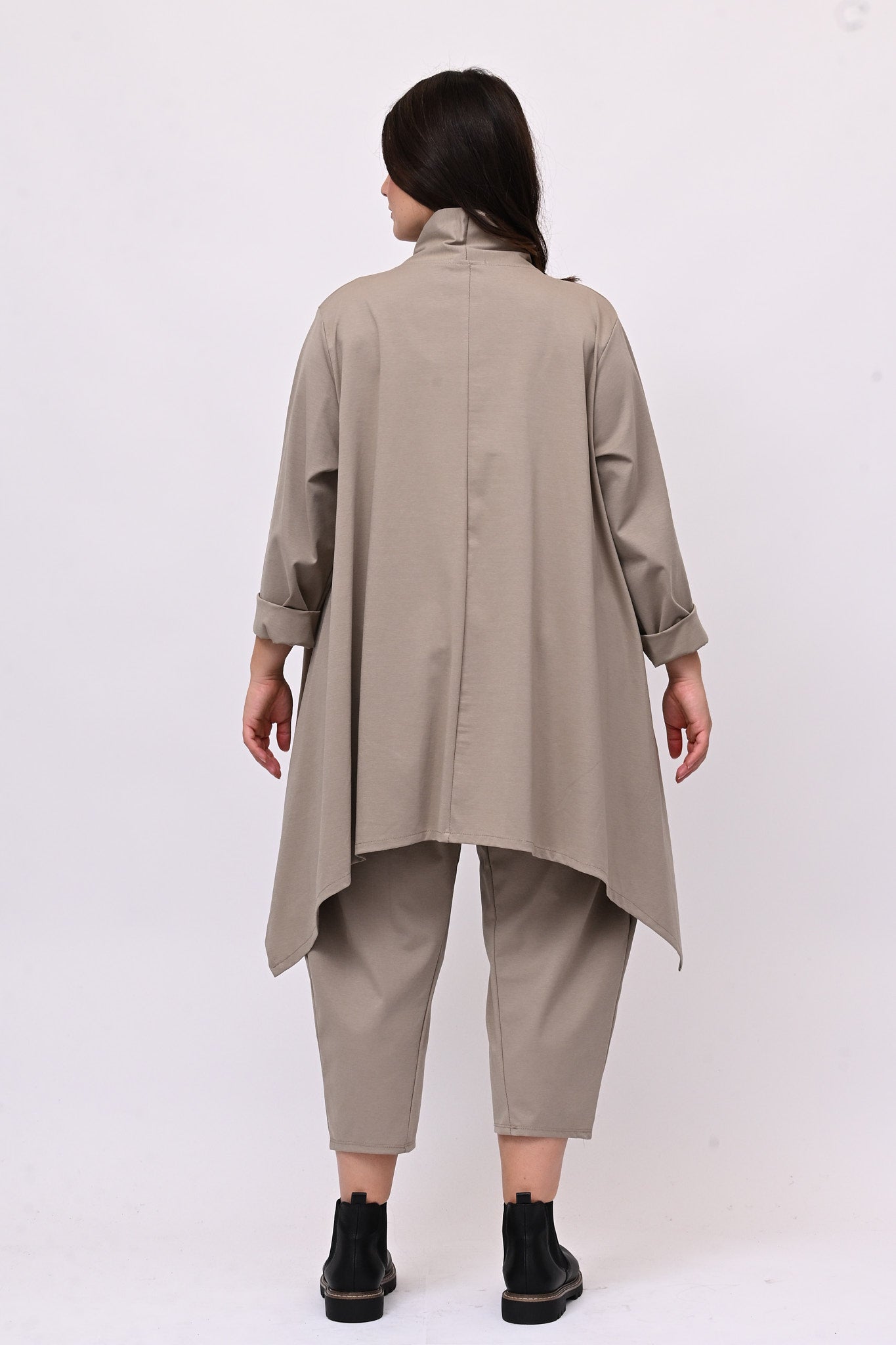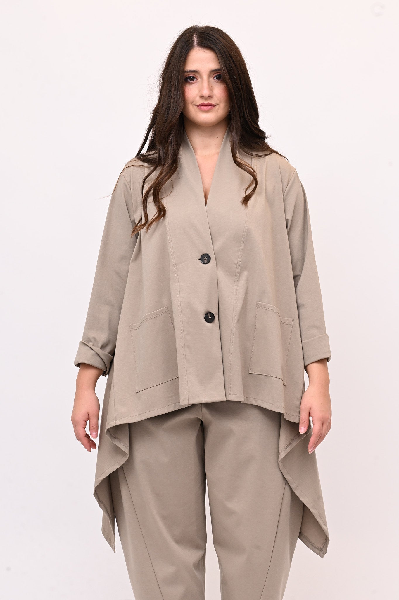 Completo composto da: giacca modello frack senza rever, taglio svasato, più lunga dietro e pantalone modello crop con elastico in vita, pinces e tasche. Ideale per outfit pratici e sofisticati e look moderni che garantiscono comfort e una vestibilità perfetta.