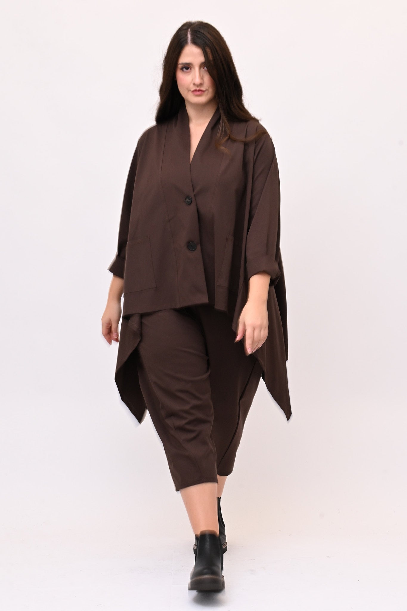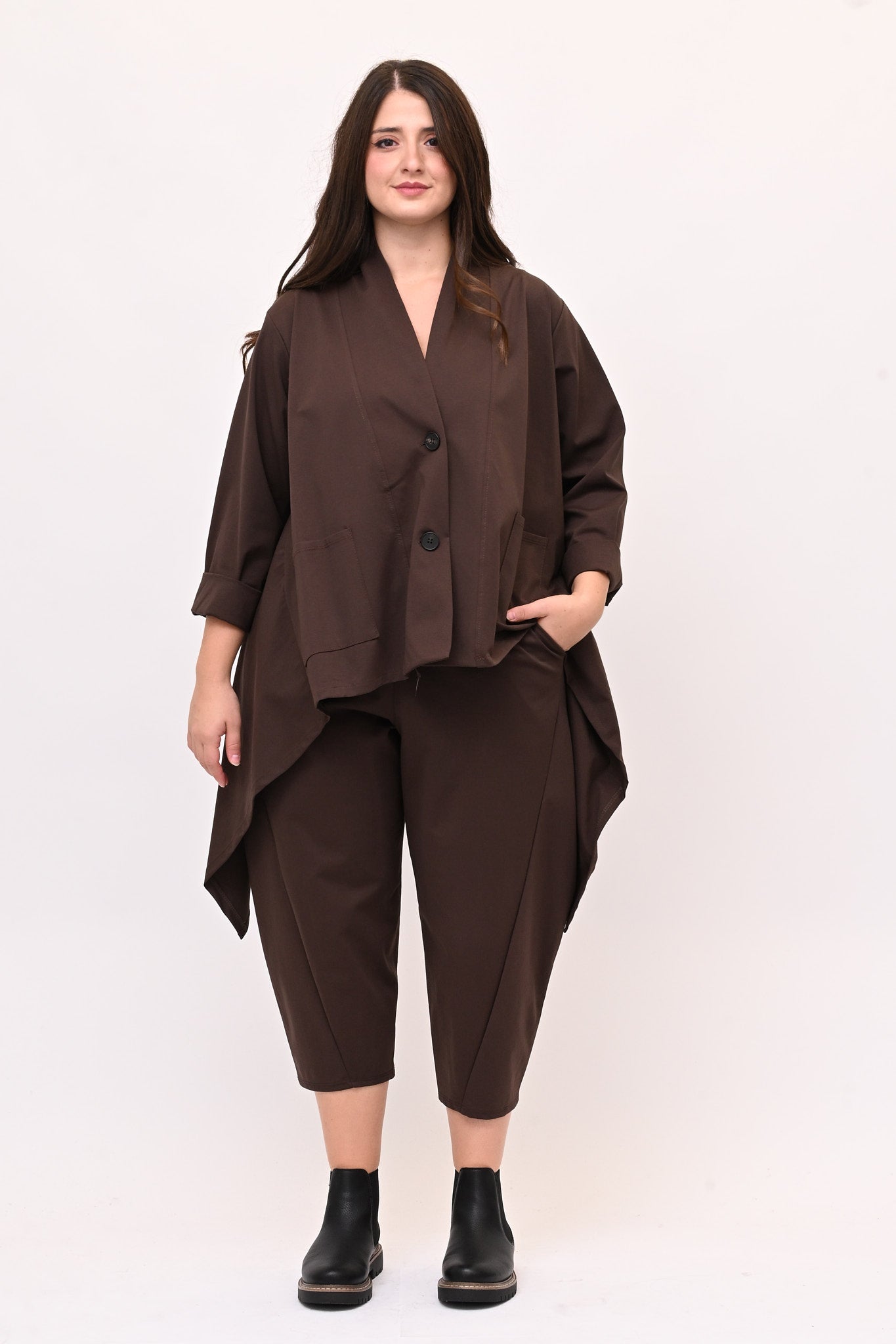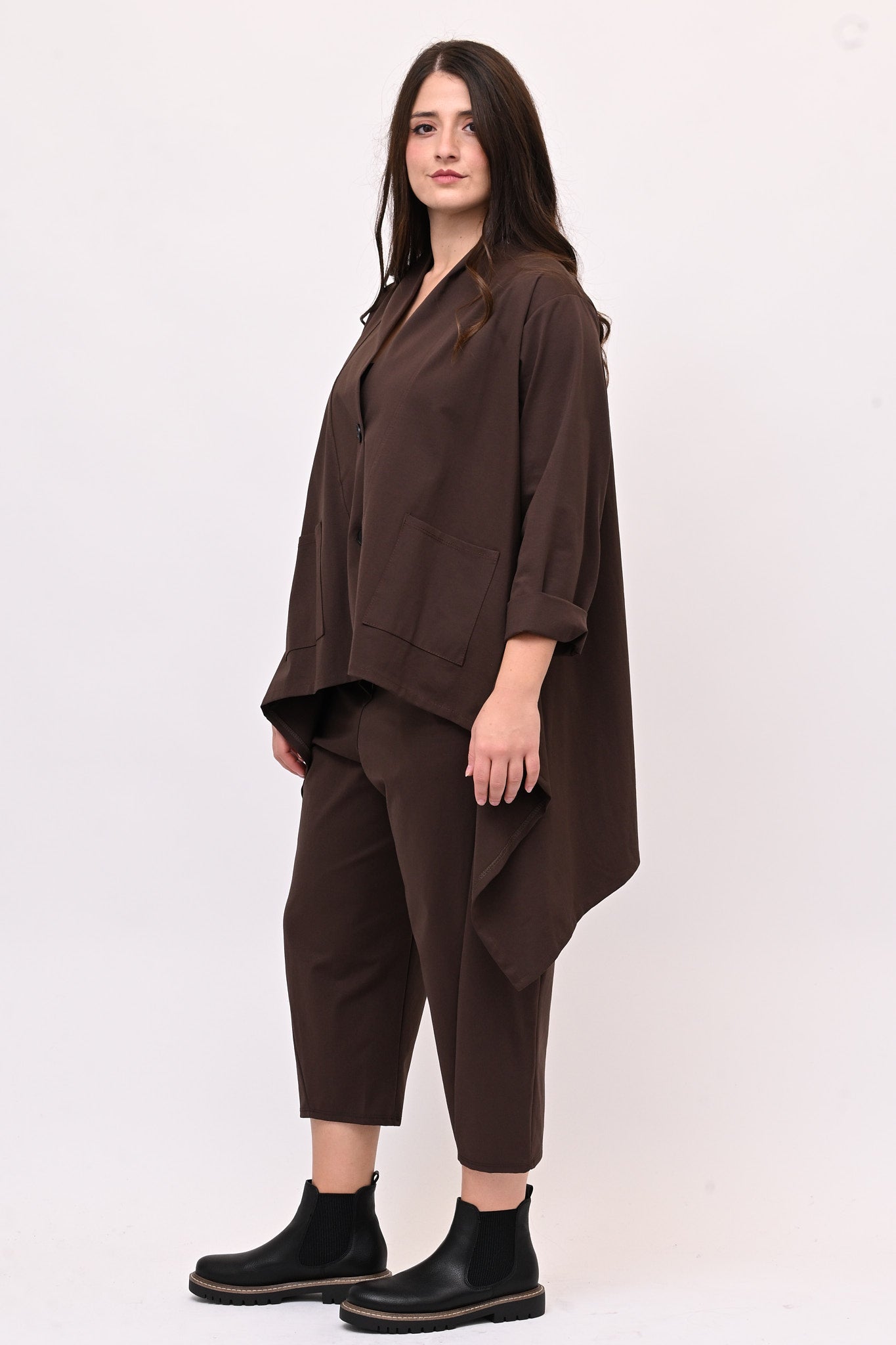 Completo composto da: giacca modello frack senza rever, taglio svasato, più lunga dietro e pantalone modello crop con elastico in vita, pinces e tasche. Ideale per outfit pratici e sofisticati e look moderni che garantiscono comfort e una vestibilità perfetta.