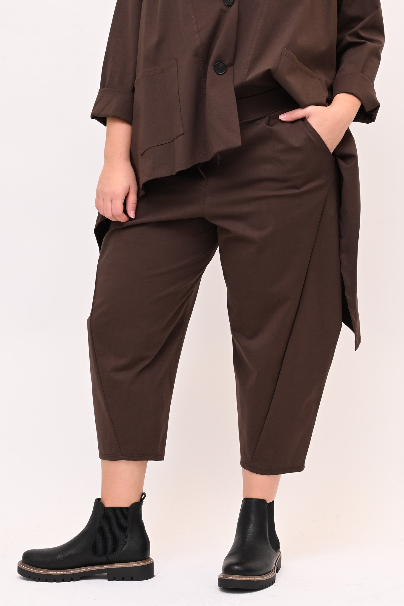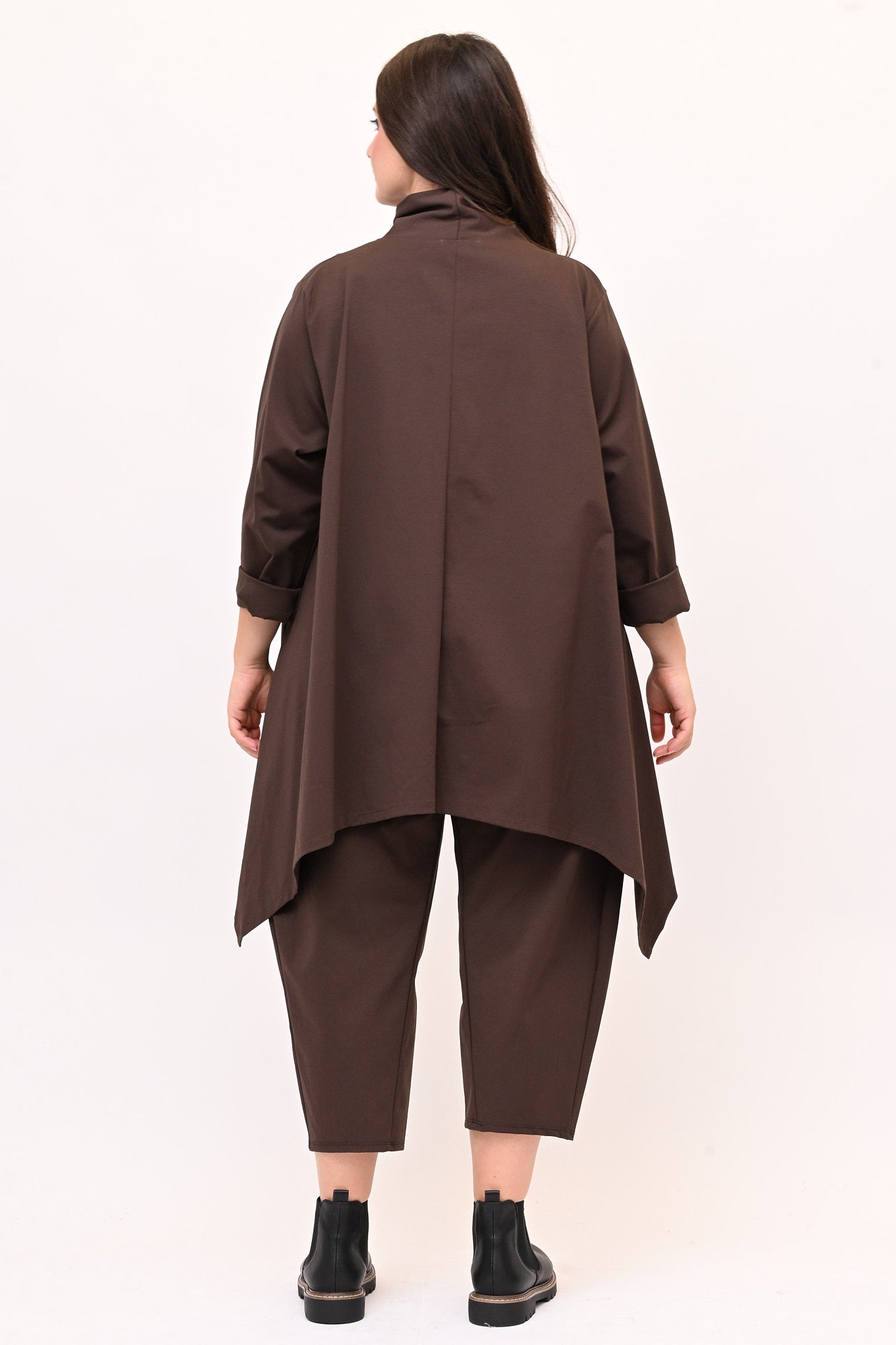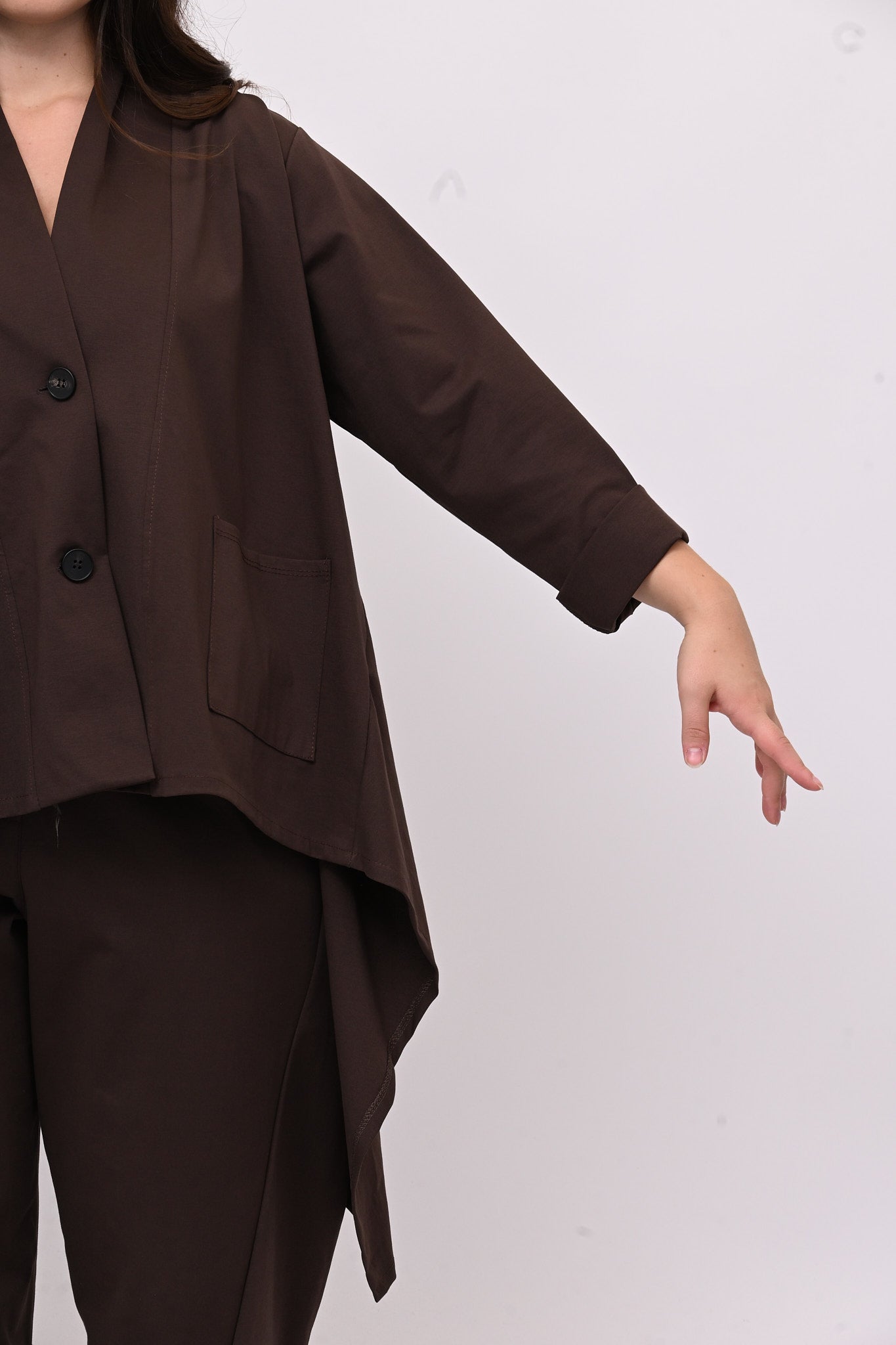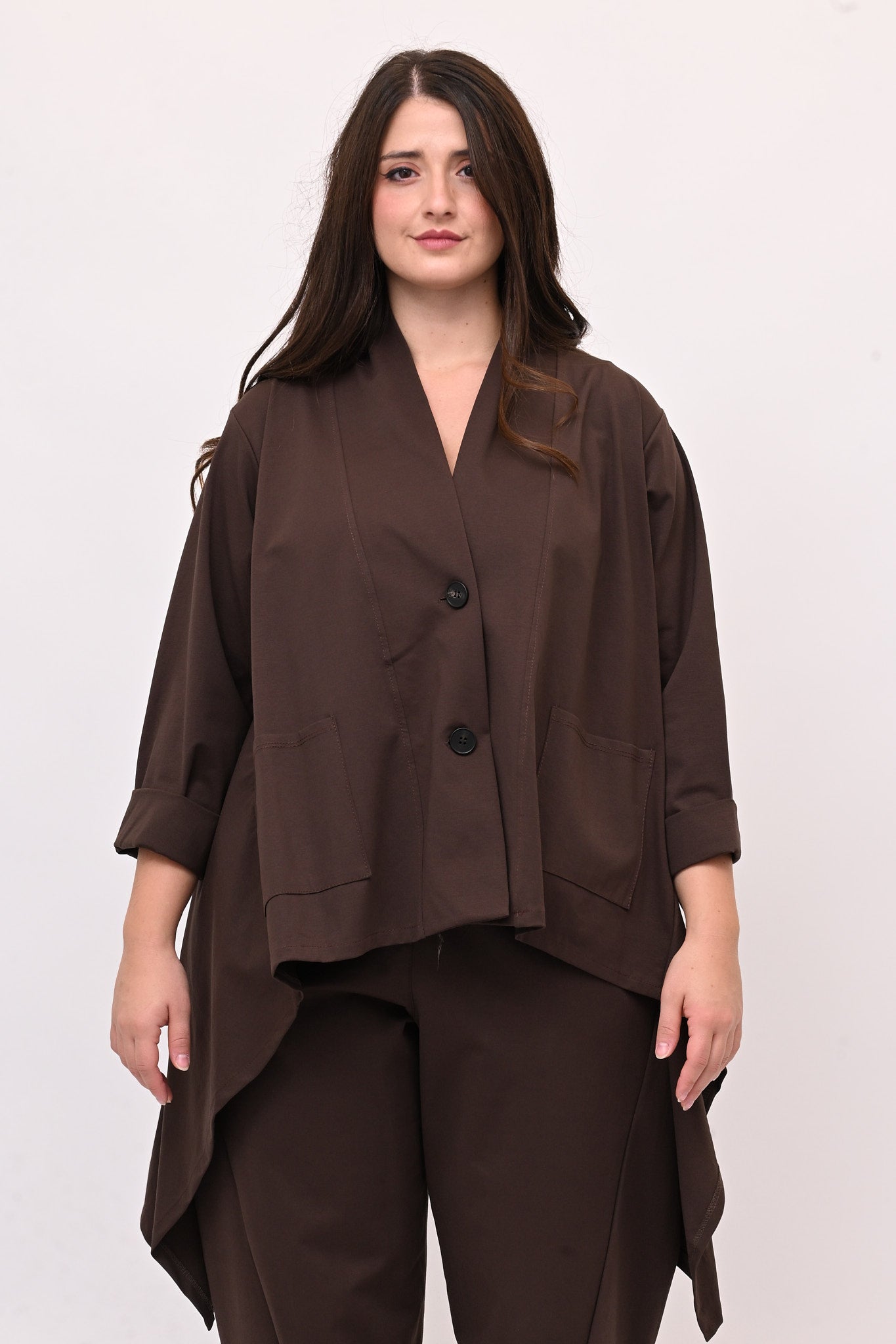 Completo composto da: giacca modello frack senza rever, taglio svasato, più lunga dietro e pantalone modello crop con elastico in vita, pinces e tasche. Ideale per outfit pratici e sofisticati e look moderni che garantiscono comfort e una vestibilità perfetta.