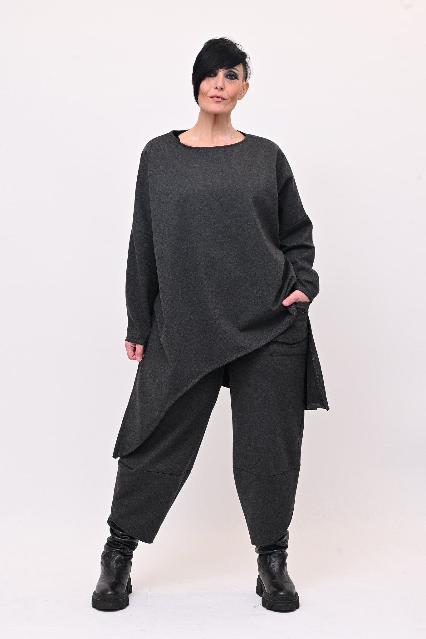 Completo in felpa dalla vestibilità over, composto da: maglia con fondo asimmetrico con punte laterali opposte che conferiscono movimento e originalità al capo, e pantalone crop con elastico in vita e tasche frontali. Pratico, caldo e avvolgente, è perfetto per chi ricerca un look contemporaneo e confortevole.