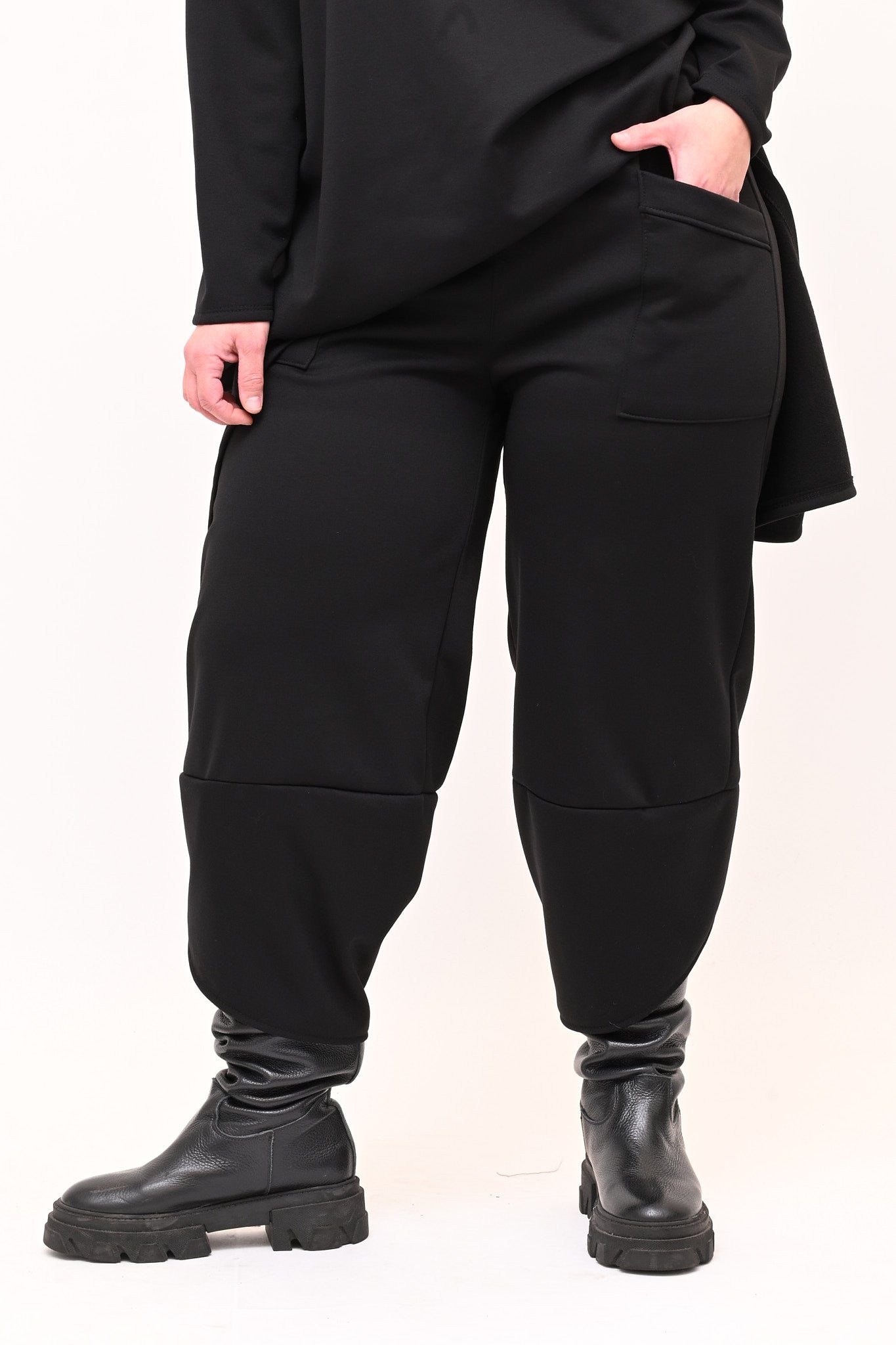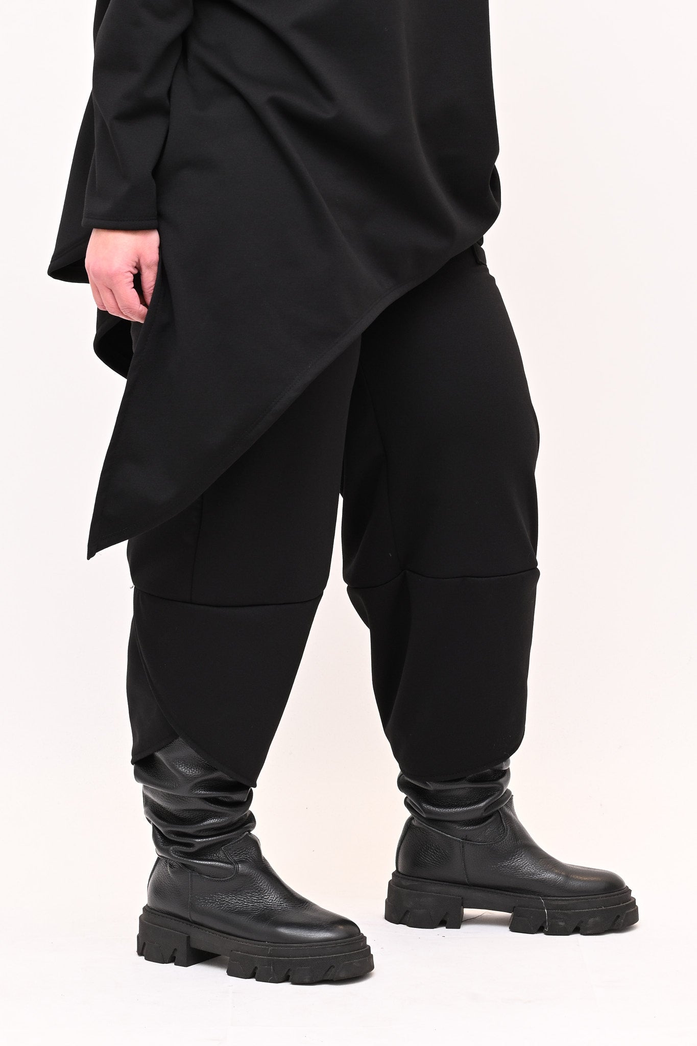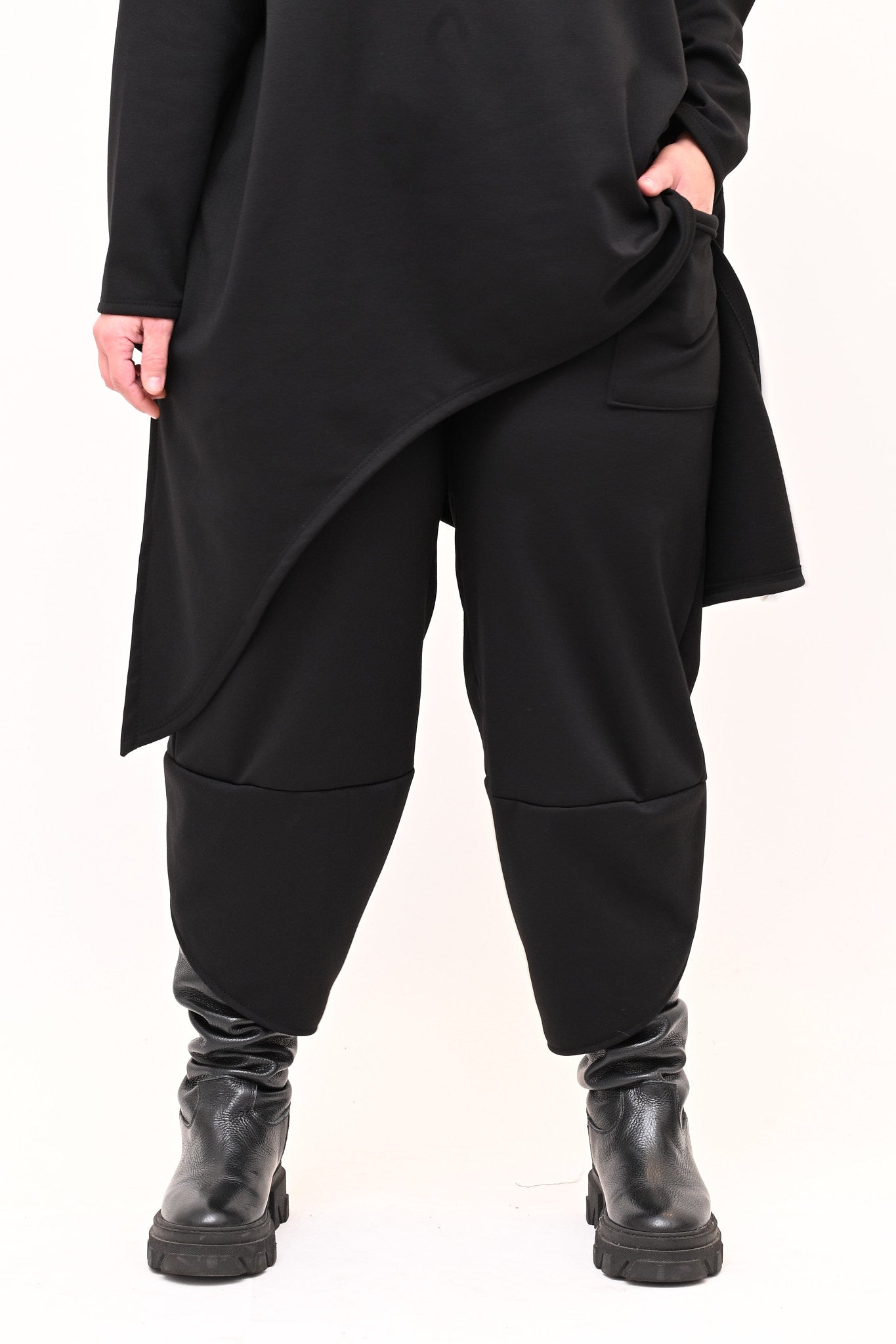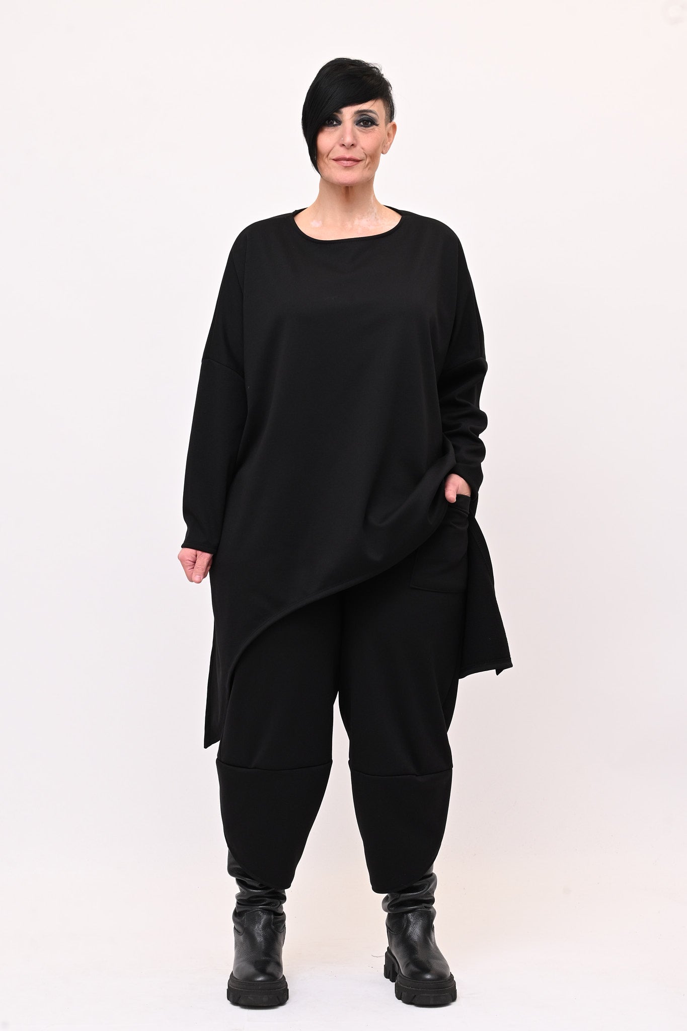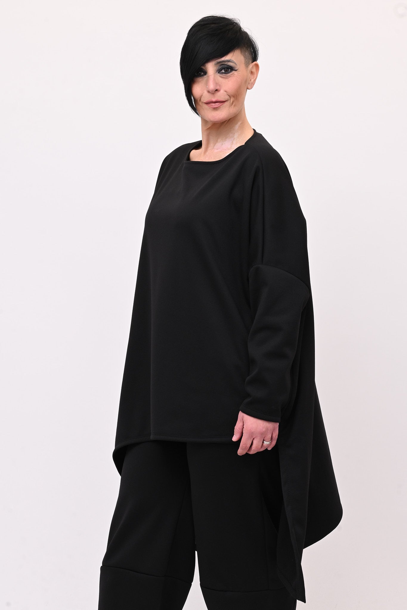 Completo in felpa dalla vestibilità over, composto da: maglia con fondo asimmetrico con punte laterali opposte che conferiscono movimento e originalità al capo, e pantalone crop con elastico in vita e tasche frontali. Pratico, caldo e avvolgente, è perfetto per chi ricerca un look contemporaneo e confortevole.