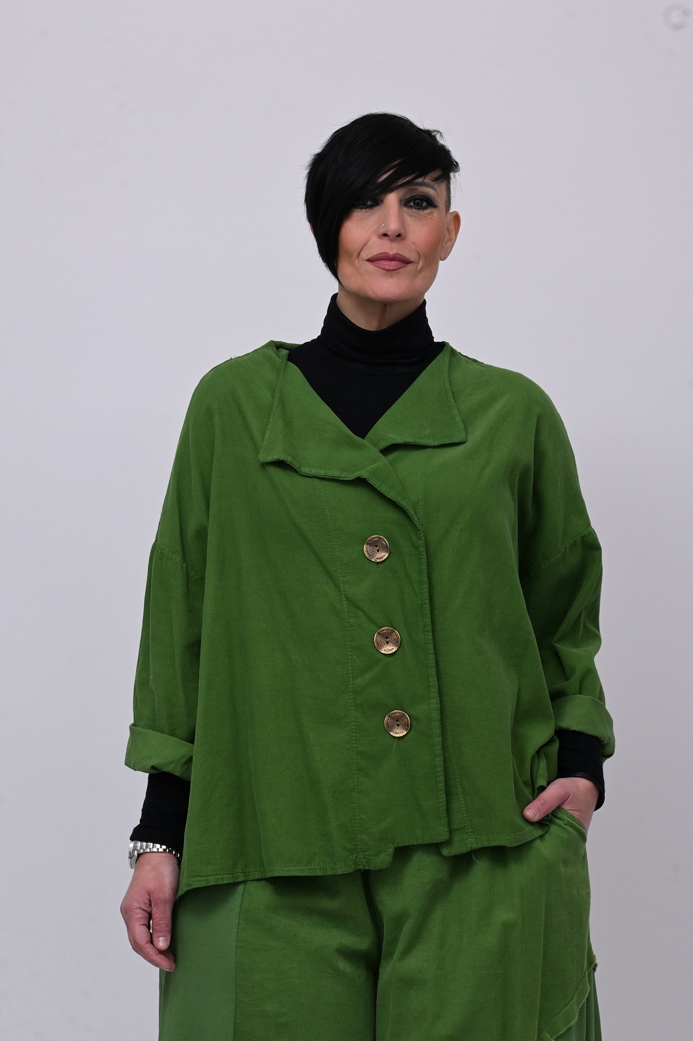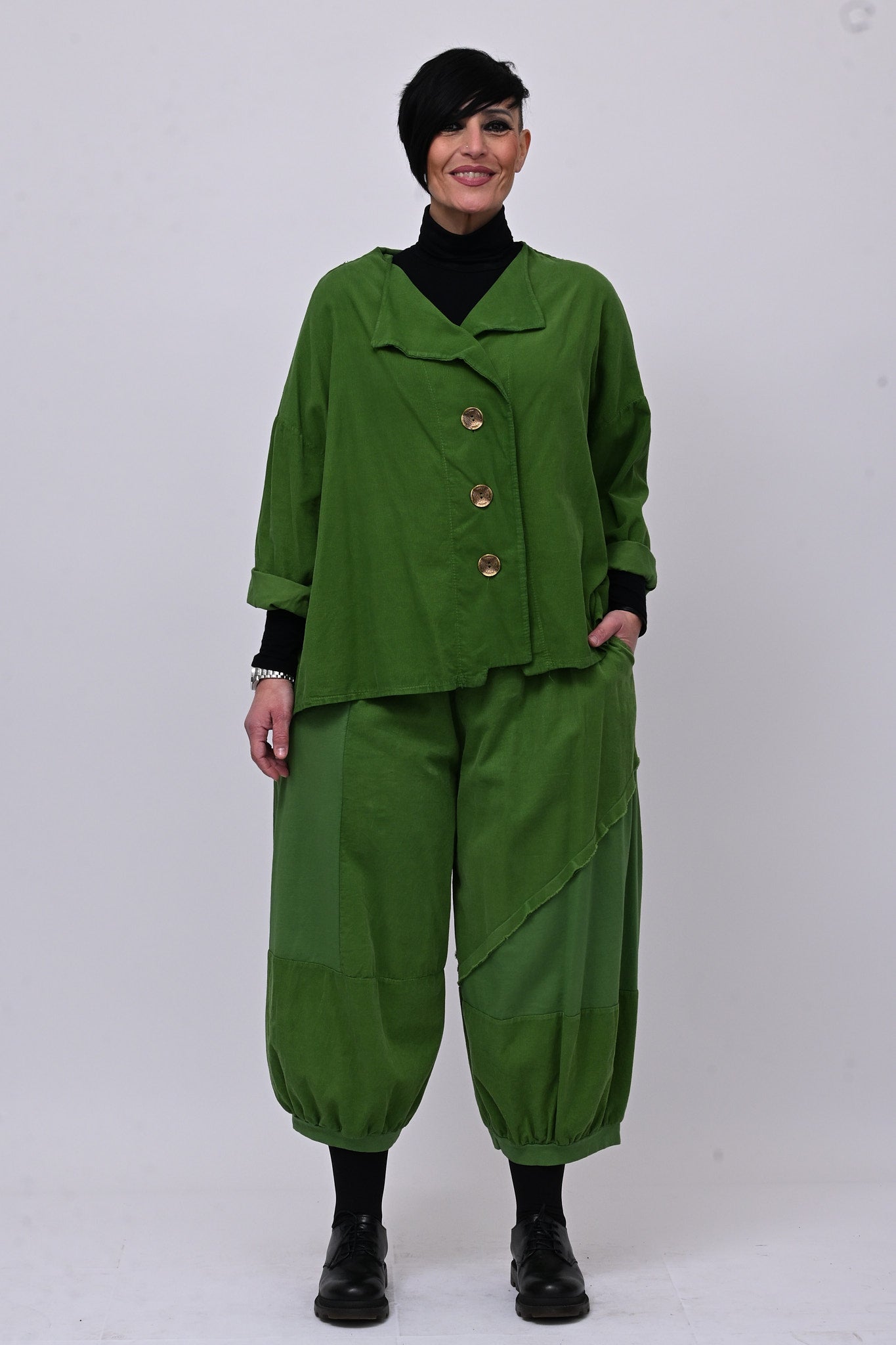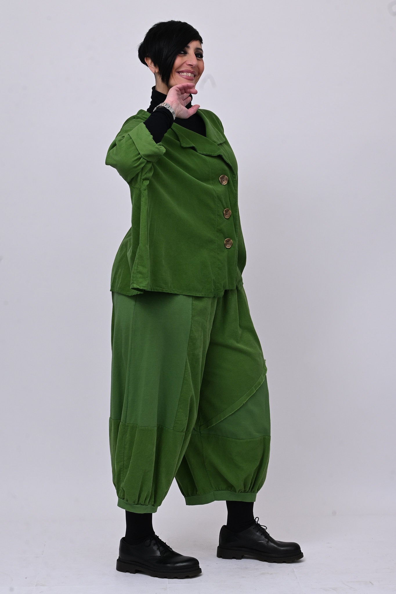 Completo in velluto a costine millerighe, composto da: giacca con colletto sciallato, spalla scesa e grandi bottoni dorati. Il pantalone è modello crop, con elastico in vita, tasche laterali, giochi di cuciture e inserti di tessuto in cotone felpato tono su tono. Comfort e libertà di movimento in un abbinamento versatile, perfetto per chi ricerca stile contemporaneo dal design sporty chic.
