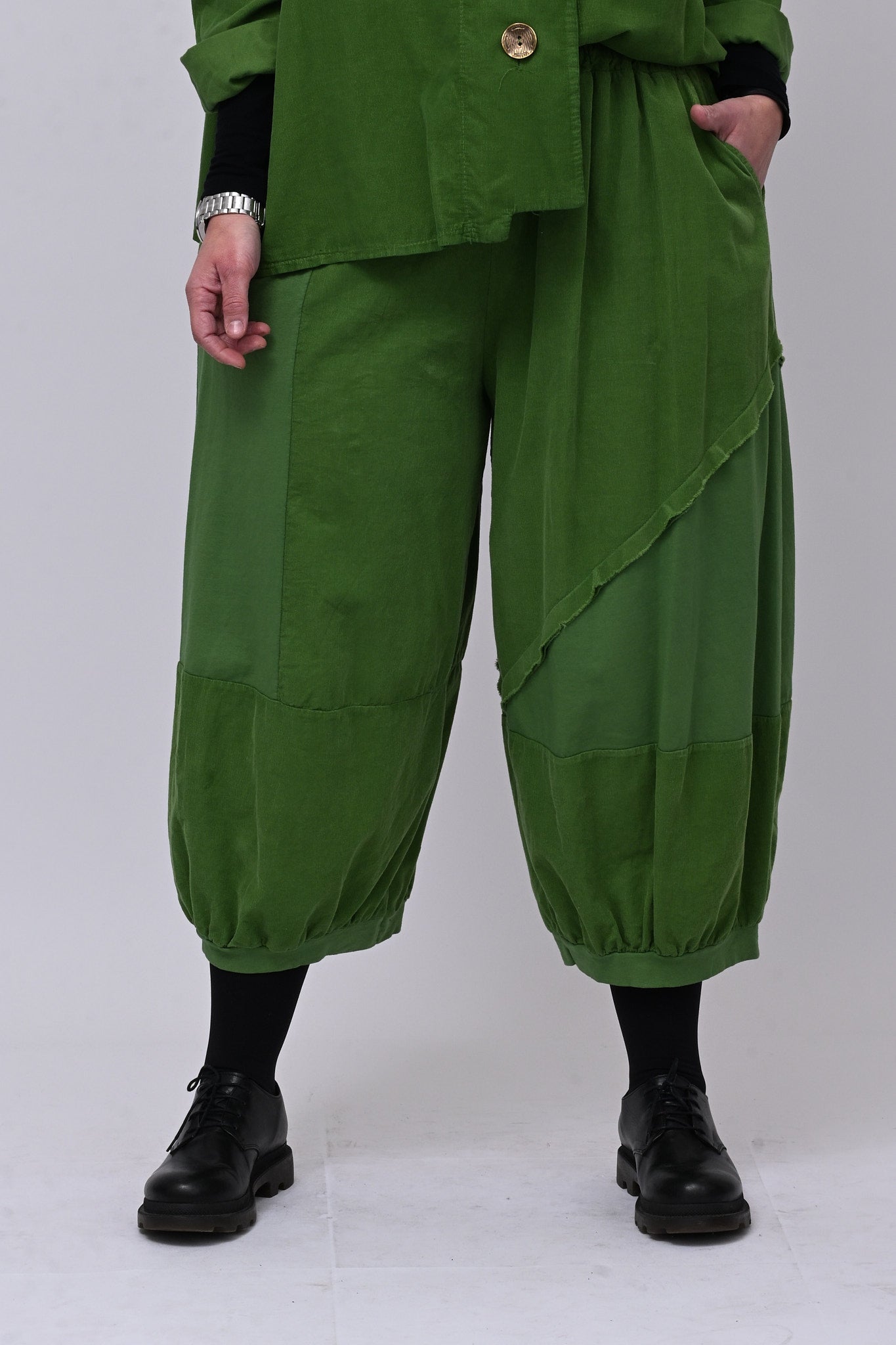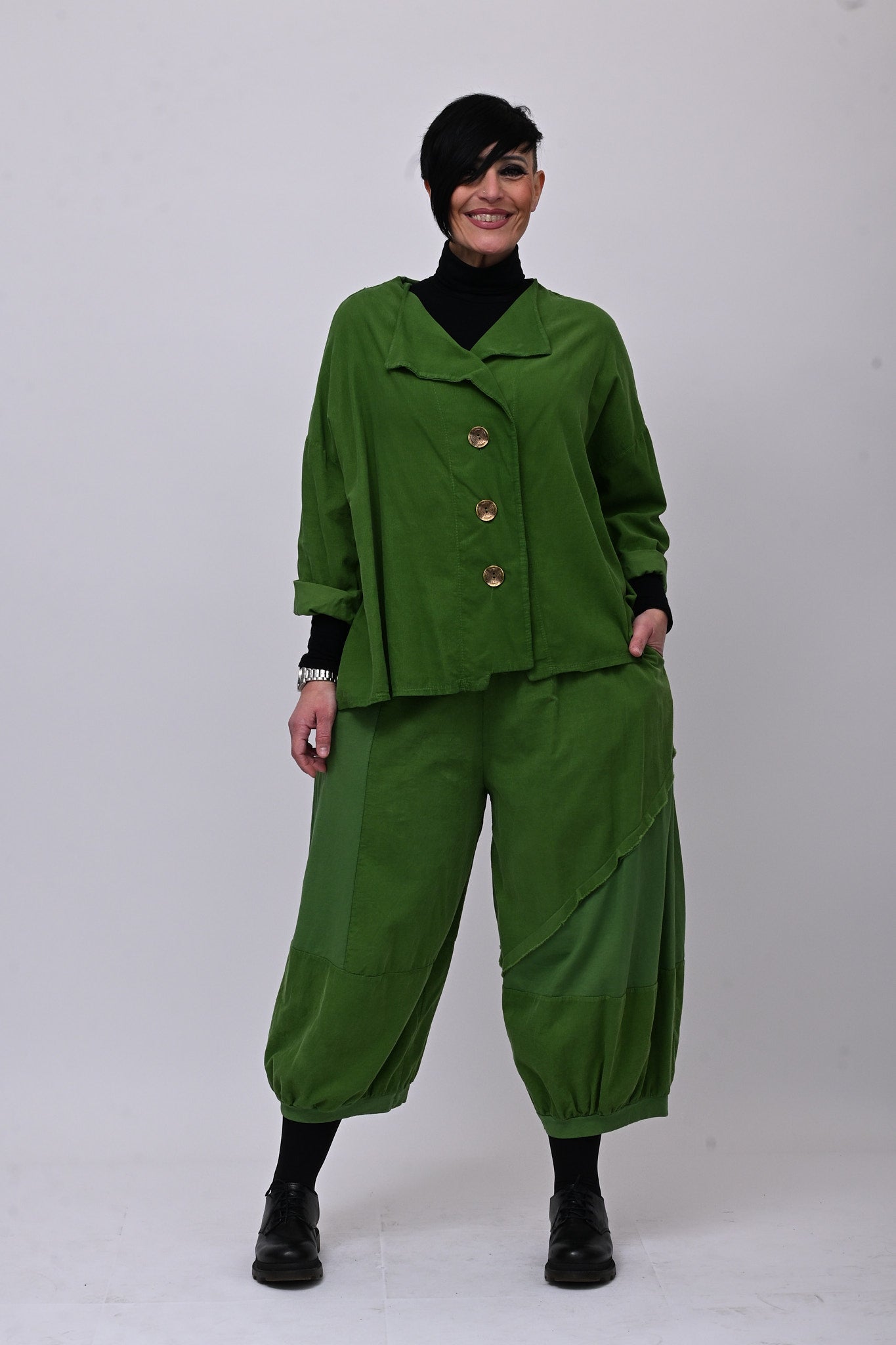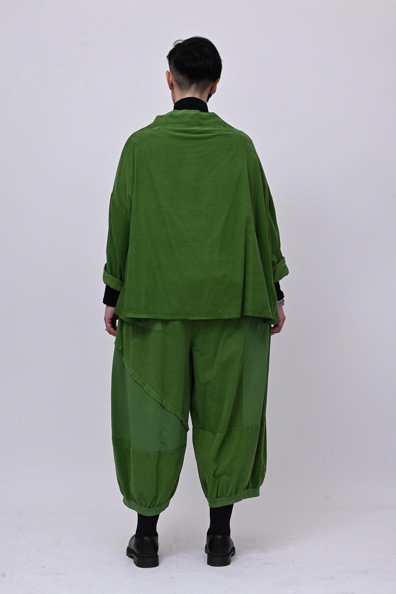 Completo in velluto a costine millerighe, composto da: giacca con colletto sciallato, spalla scesa e grandi bottoni dorati. Il pantalone è modello crop, con elastico in vita, tasche laterali, giochi di cuciture e inserti di tessuto in cotone felpato tono su tono. Comfort e libertà di movimento in un abbinamento versatile, perfetto per chi ricerca stile contemporaneo dal design sporty chic.