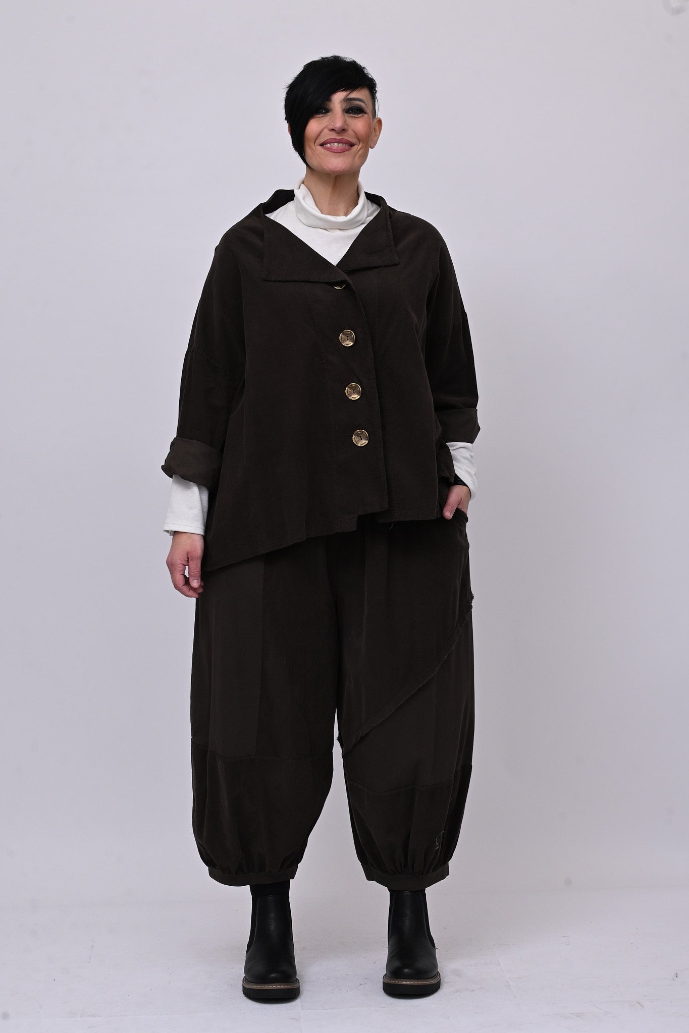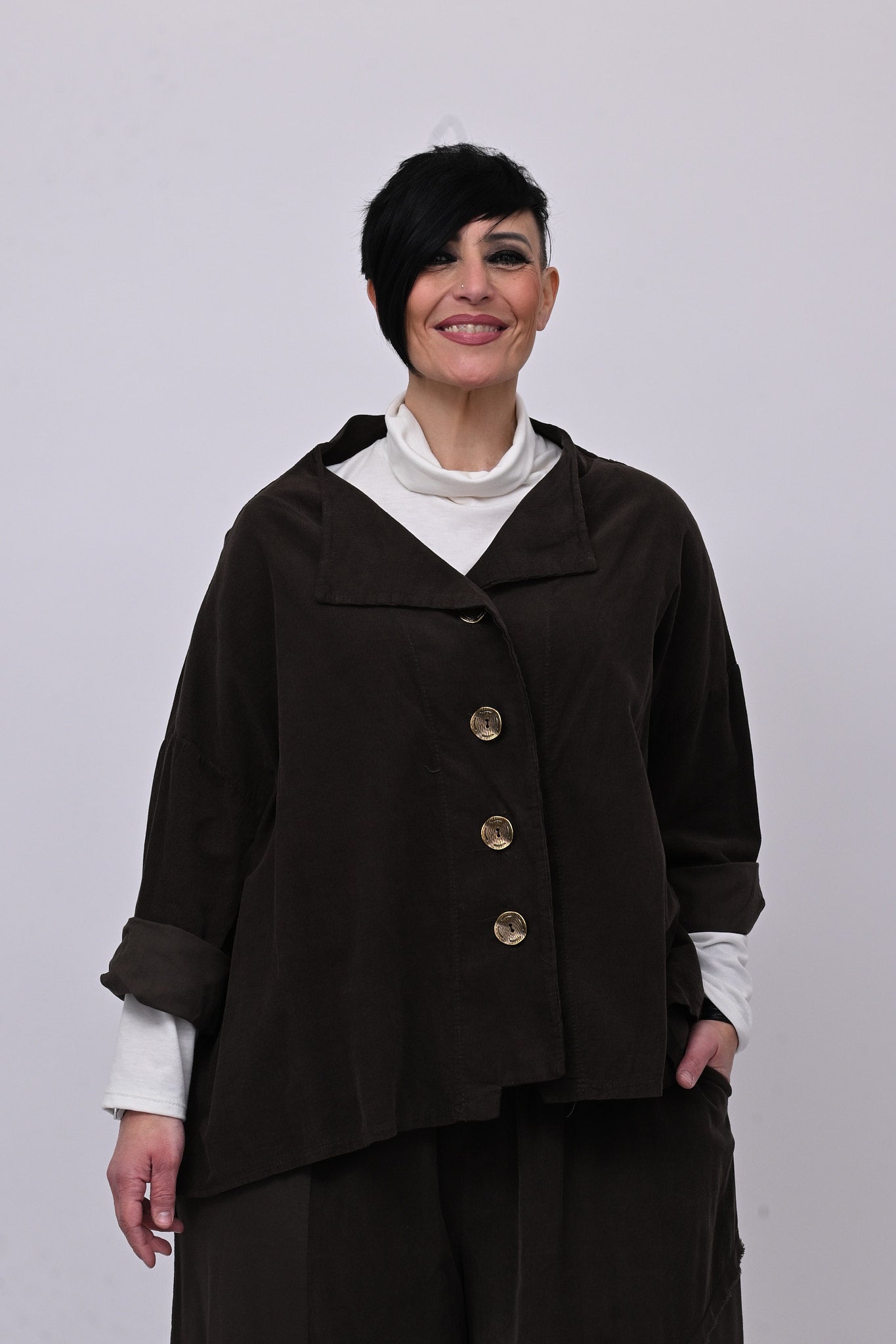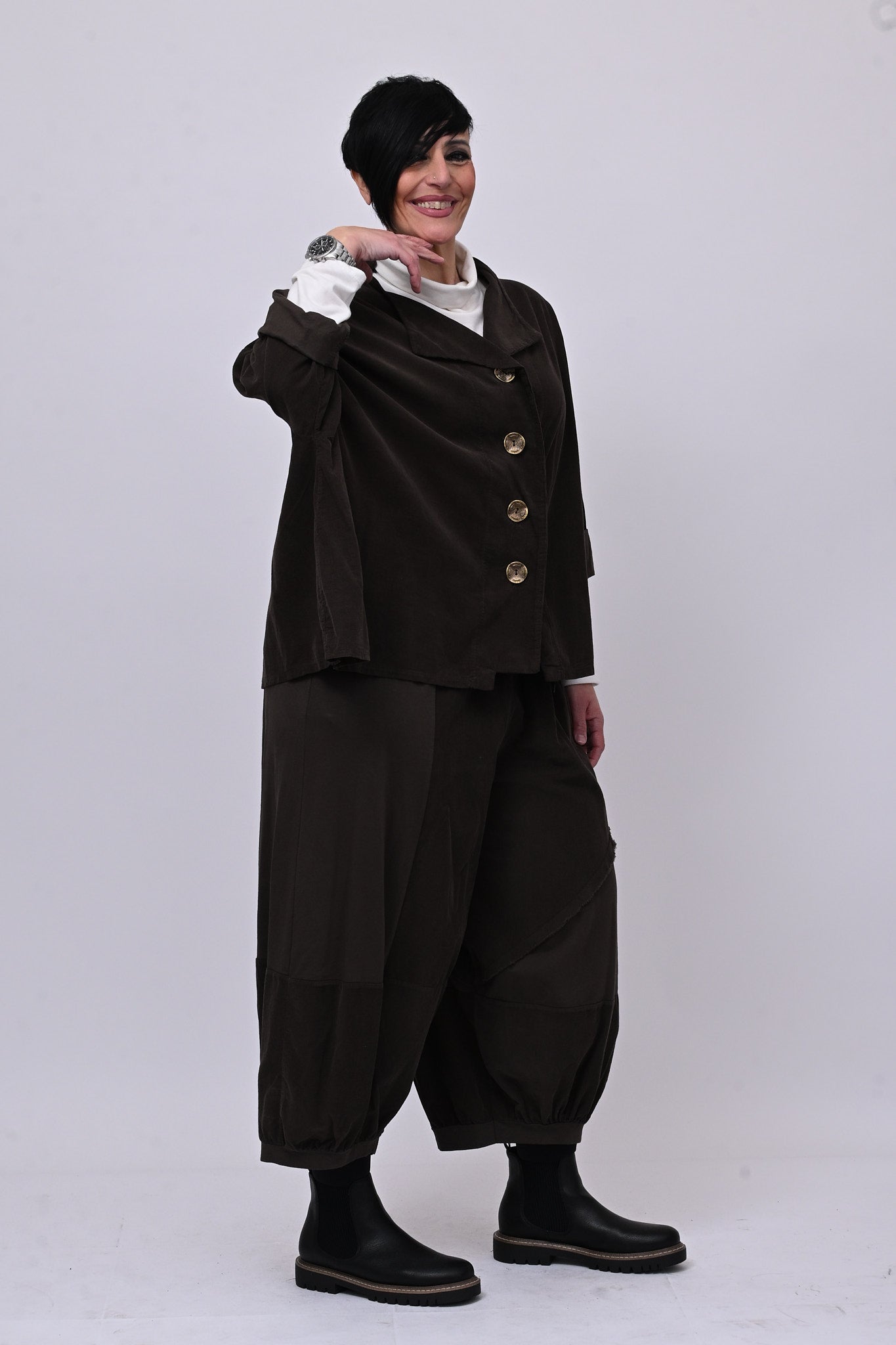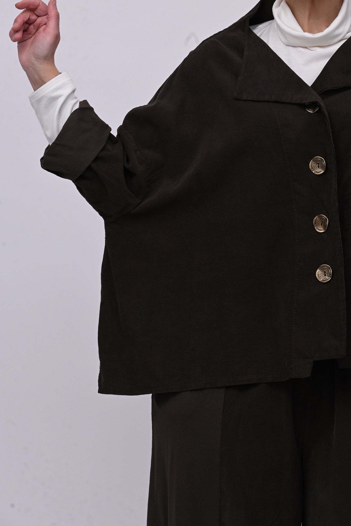 Completo in velluto a costine millerighe, composto da: giacca con colletto sciallato, spalla scesa e grandi bottoni dorati. Il pantalone è modello crop, con elastico in vita, tasche laterali, giochi di cuciture e inserti di tessuto in cotone felpato tono su tono. Comfort e libertà di movimento in un abbinamento versatile, perfetto per chi ricerca stile contemporaneo dal design sporty chic.