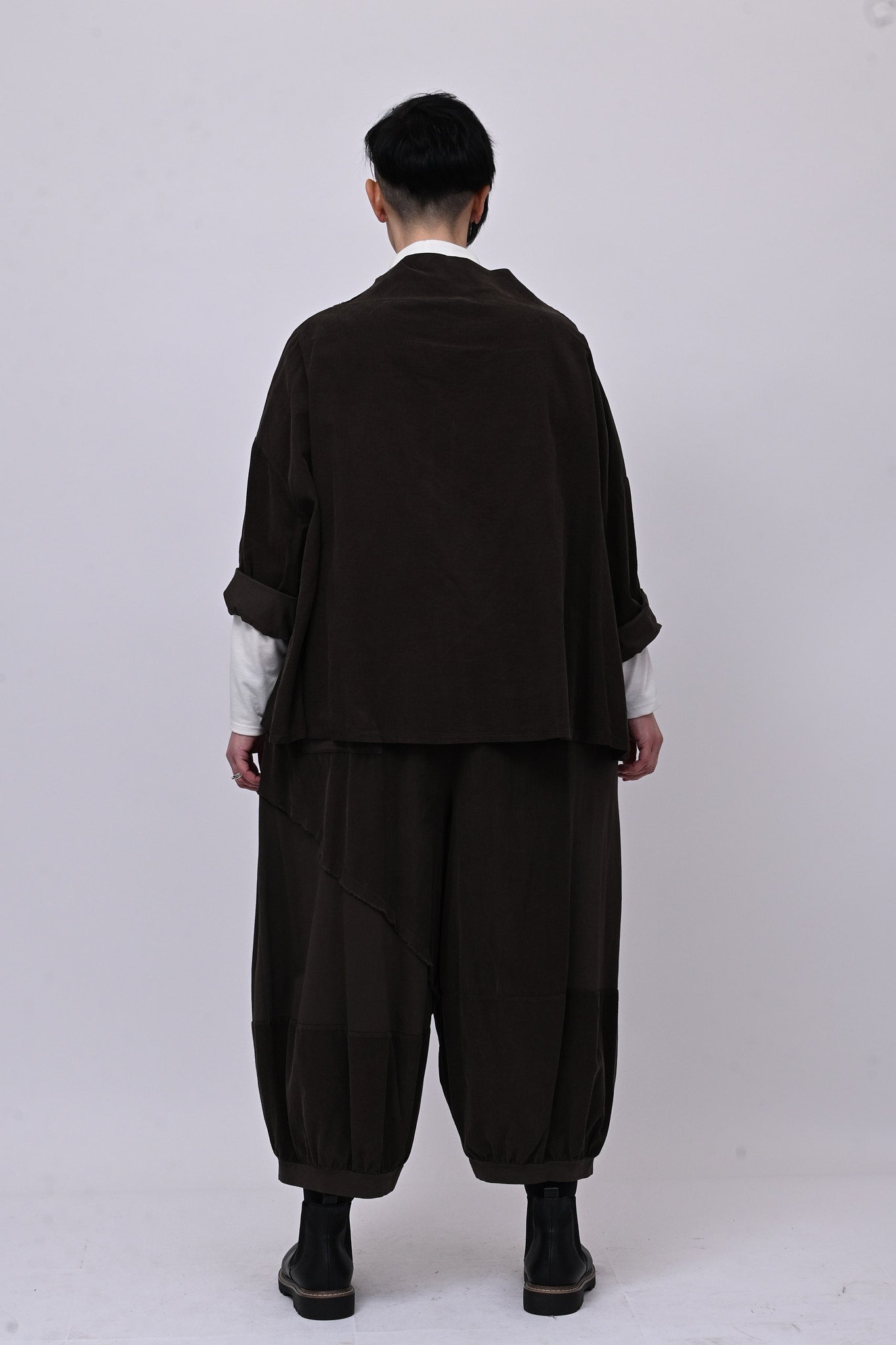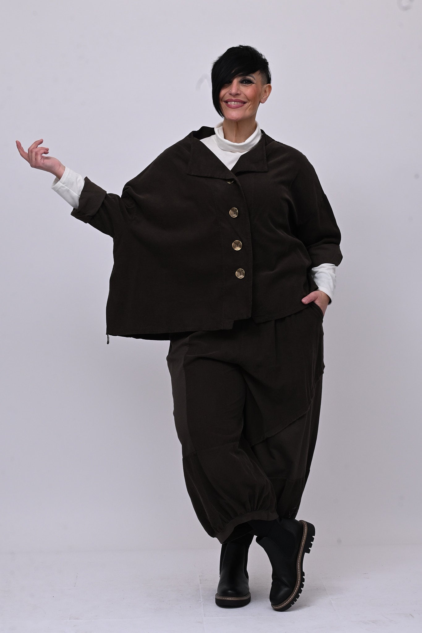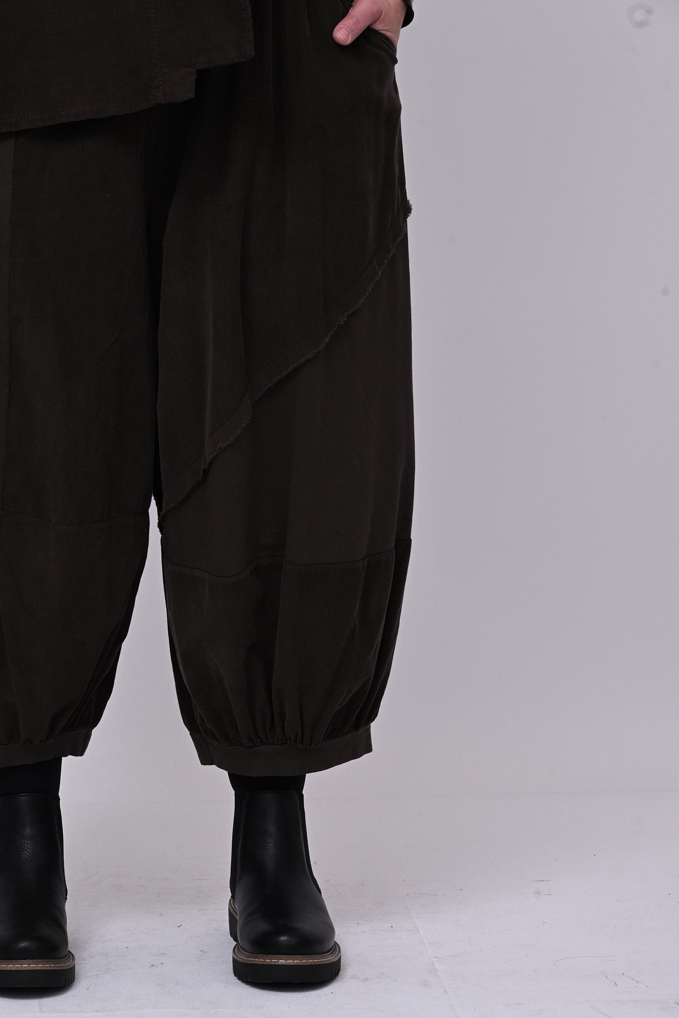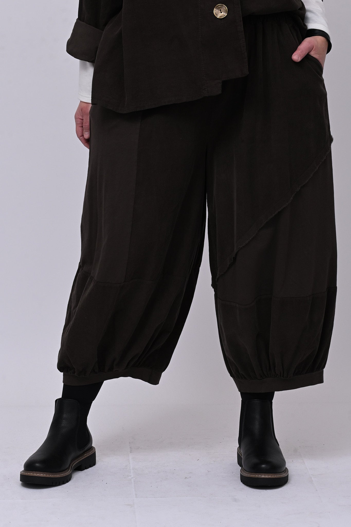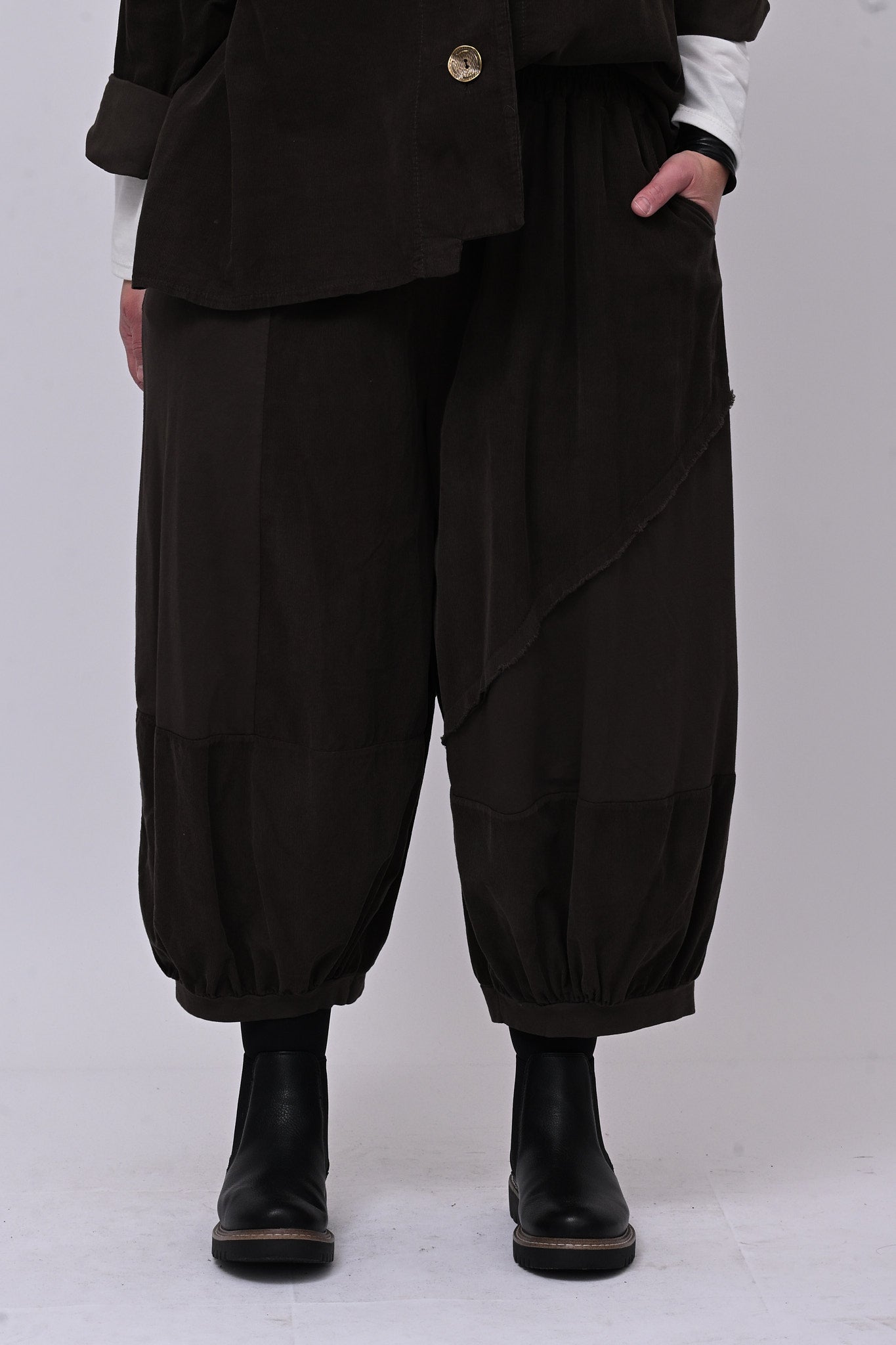 Completo in velluto a costine millerighe, composto da: giacca con colletto sciallato, spalla scesa e grandi bottoni dorati. Il pantalone è modello crop, con elastico in vita, tasche laterali, giochi di cuciture e inserti di tessuto in cotone felpato tono su tono. Comfort e libertà di movimento in un abbinamento versatile, perfetto per chi ricerca stile contemporaneo dal design sporty chic.