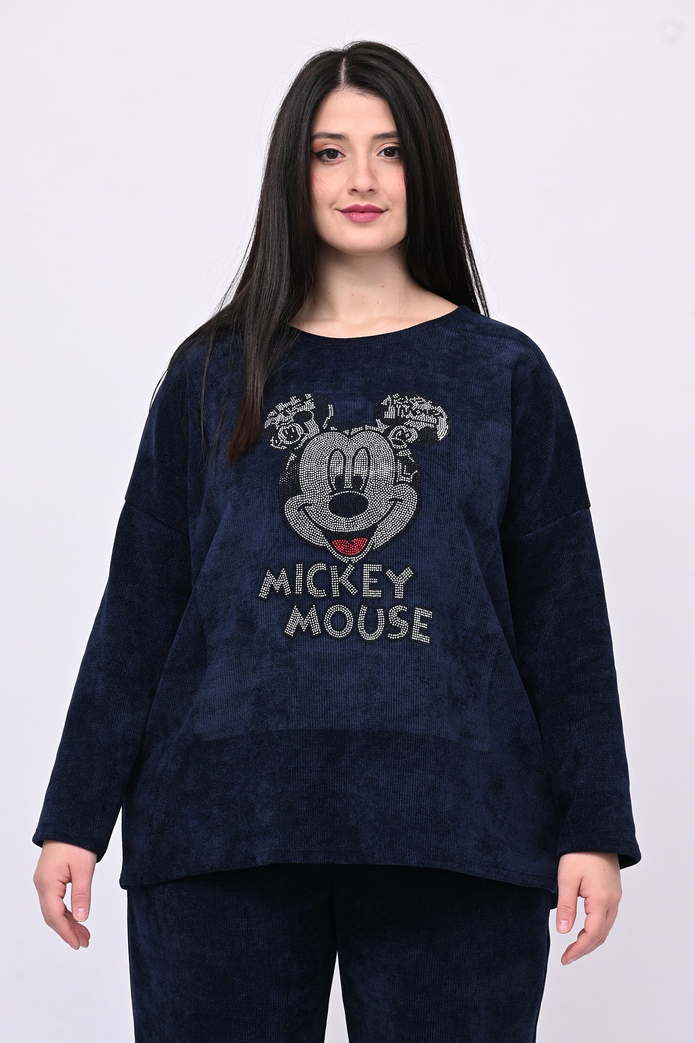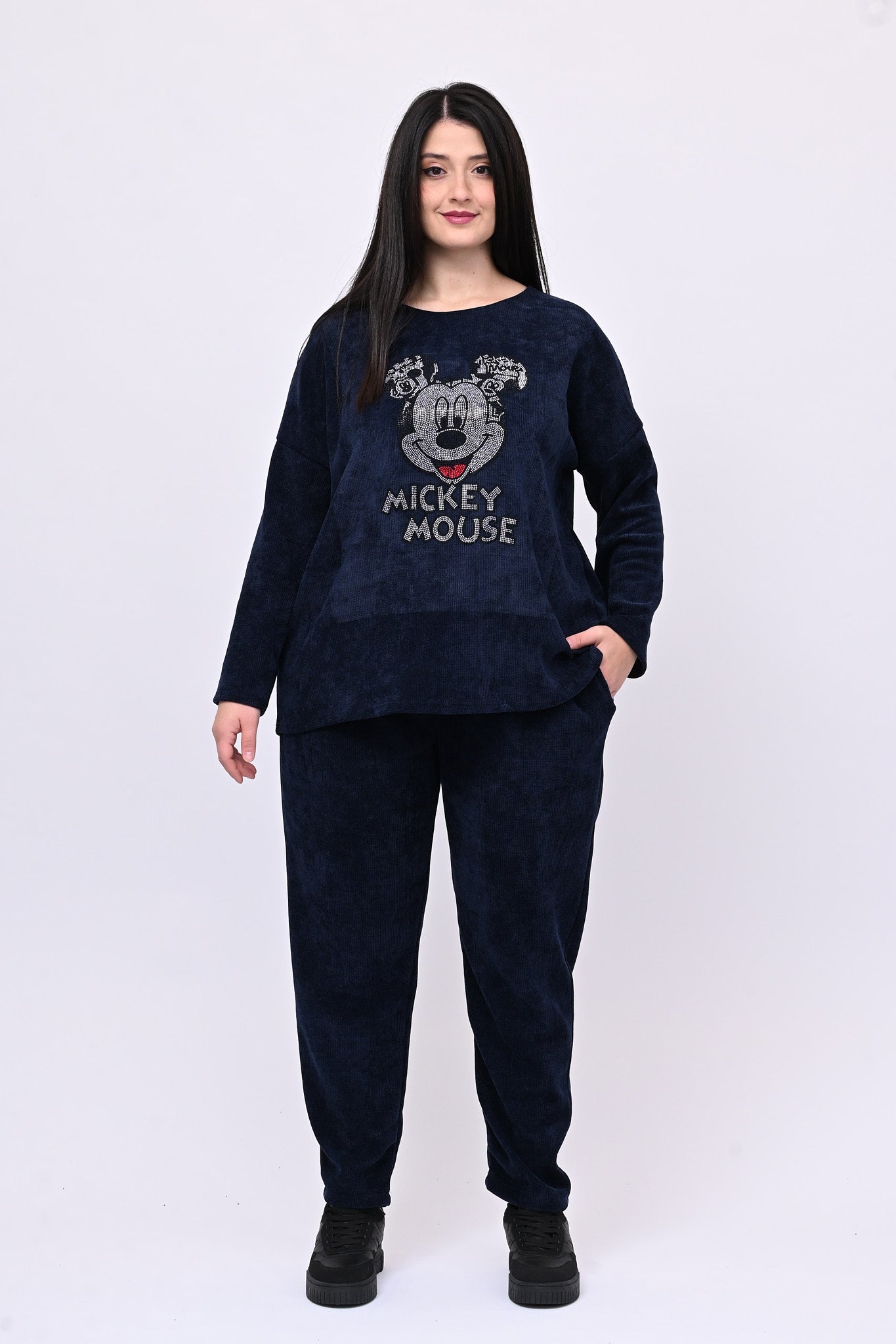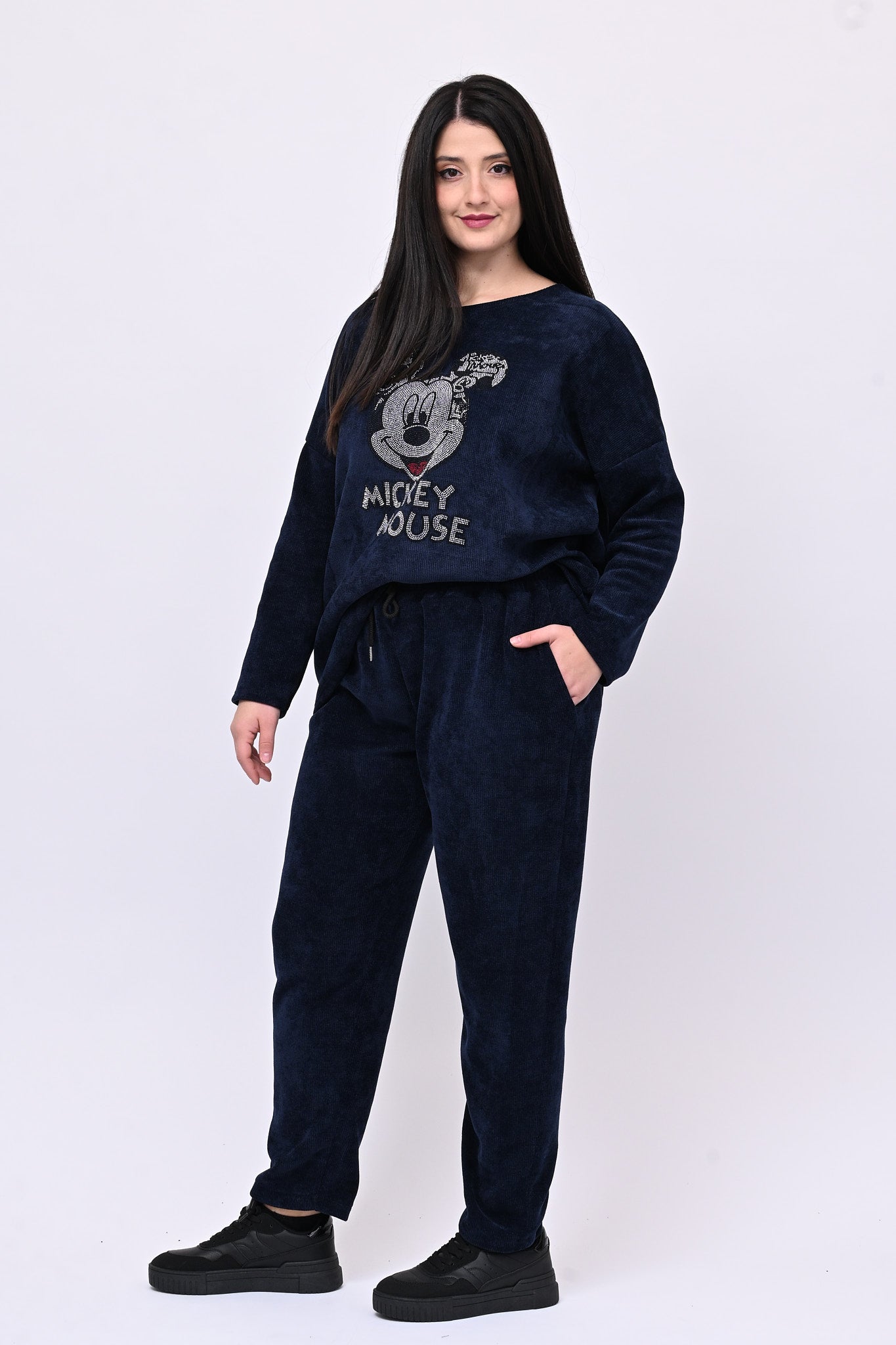 Tuta in ciniglia composta da: felpa girocollo con stampa brillantinata di Mickey Mouse e pantaloni con elastico in vita, laccetto regolabile e tasche laterali. Perfetta per chi cerca un outfit versatile e sporty chic, senza rinunciare alla comodità.