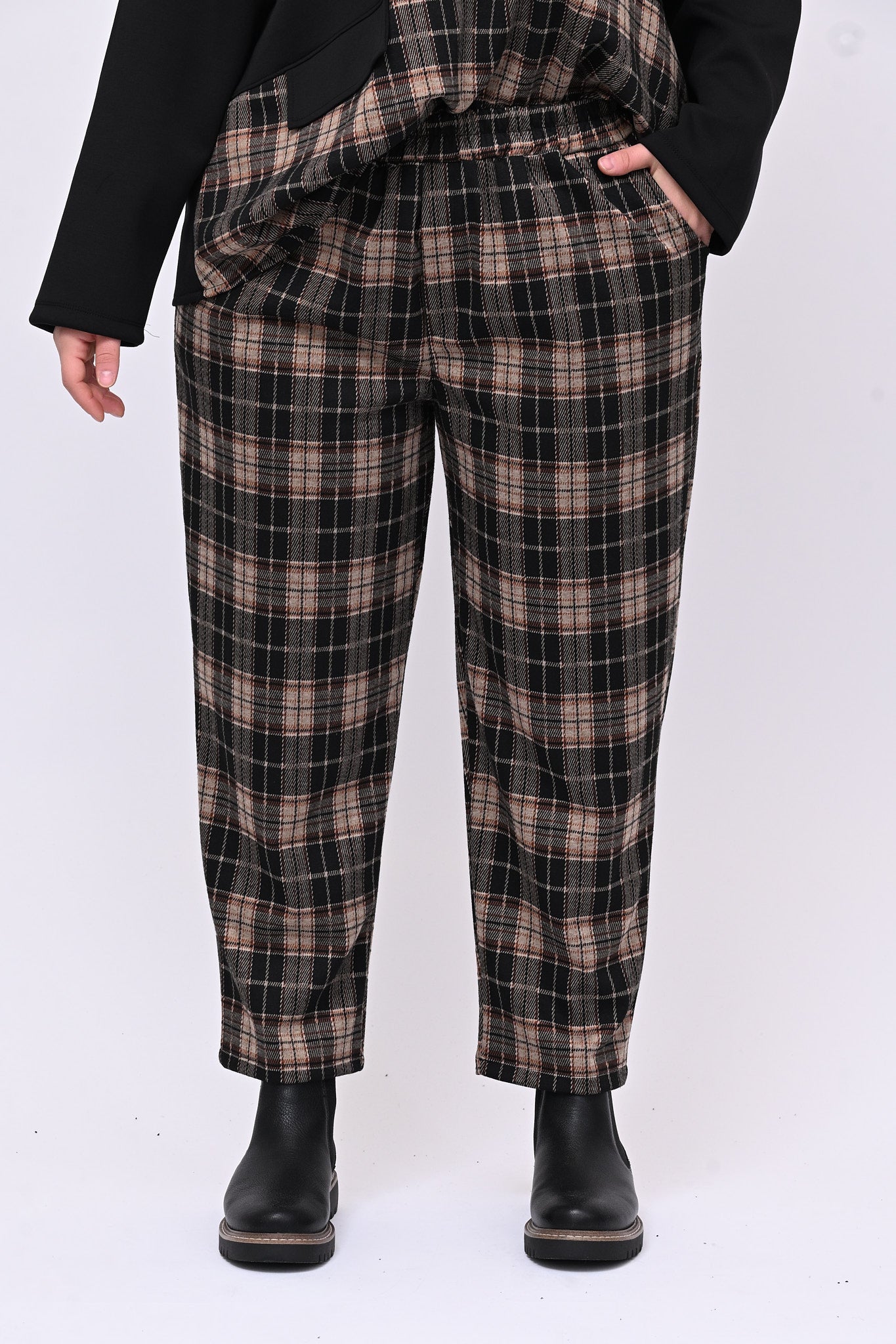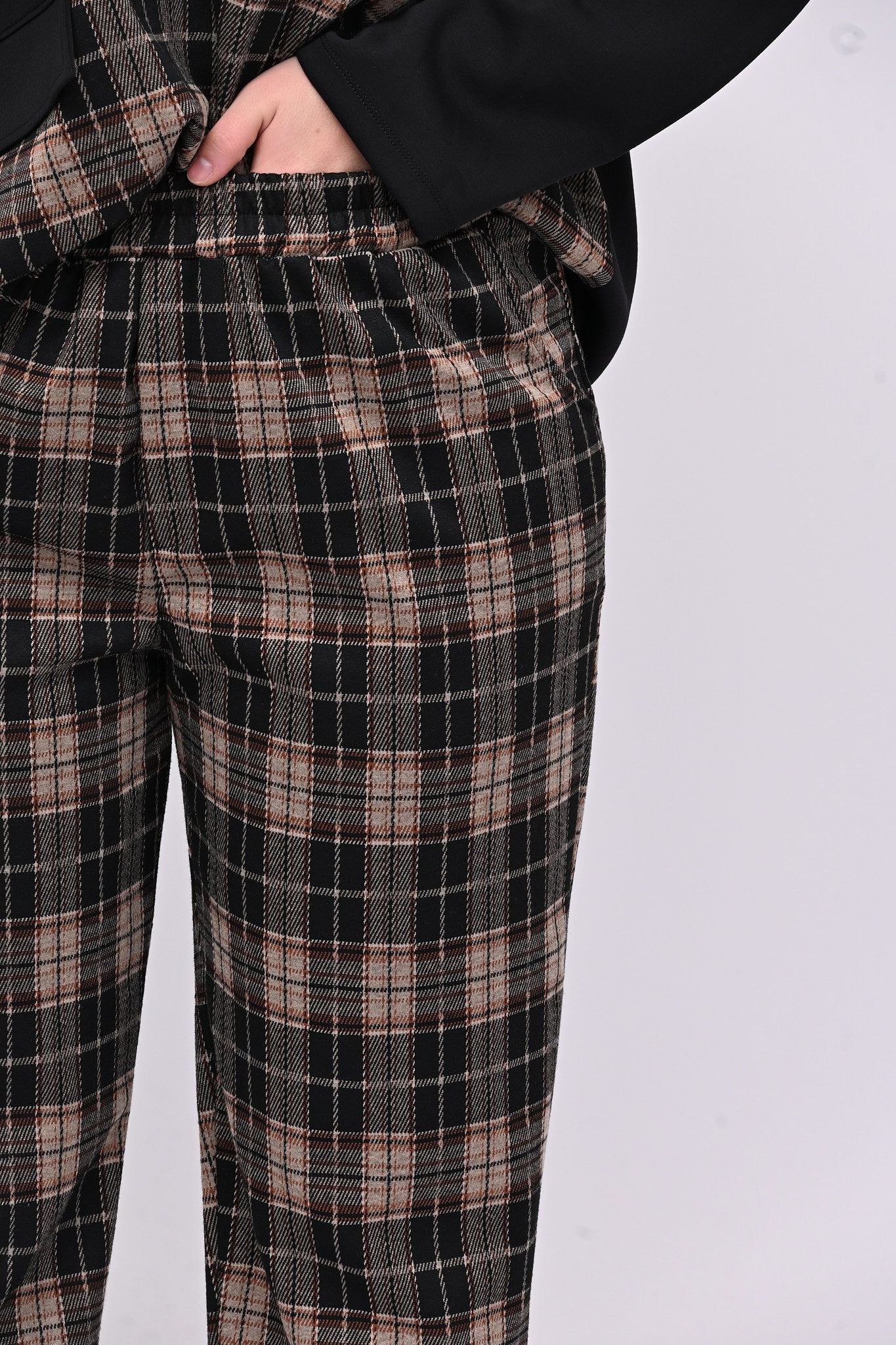 Completo in neoprene e flanella a fantasia tartan, composto da: blusa girocollo asimmetrica con punta laterale a pantaloni alla caviglia con elastico in vita e tasche laterali. L'abbinamento dei due tessuti crea un look di carattere, originale e pratico, perfetto per outfit sporty-chic, contemporanei e versatili.