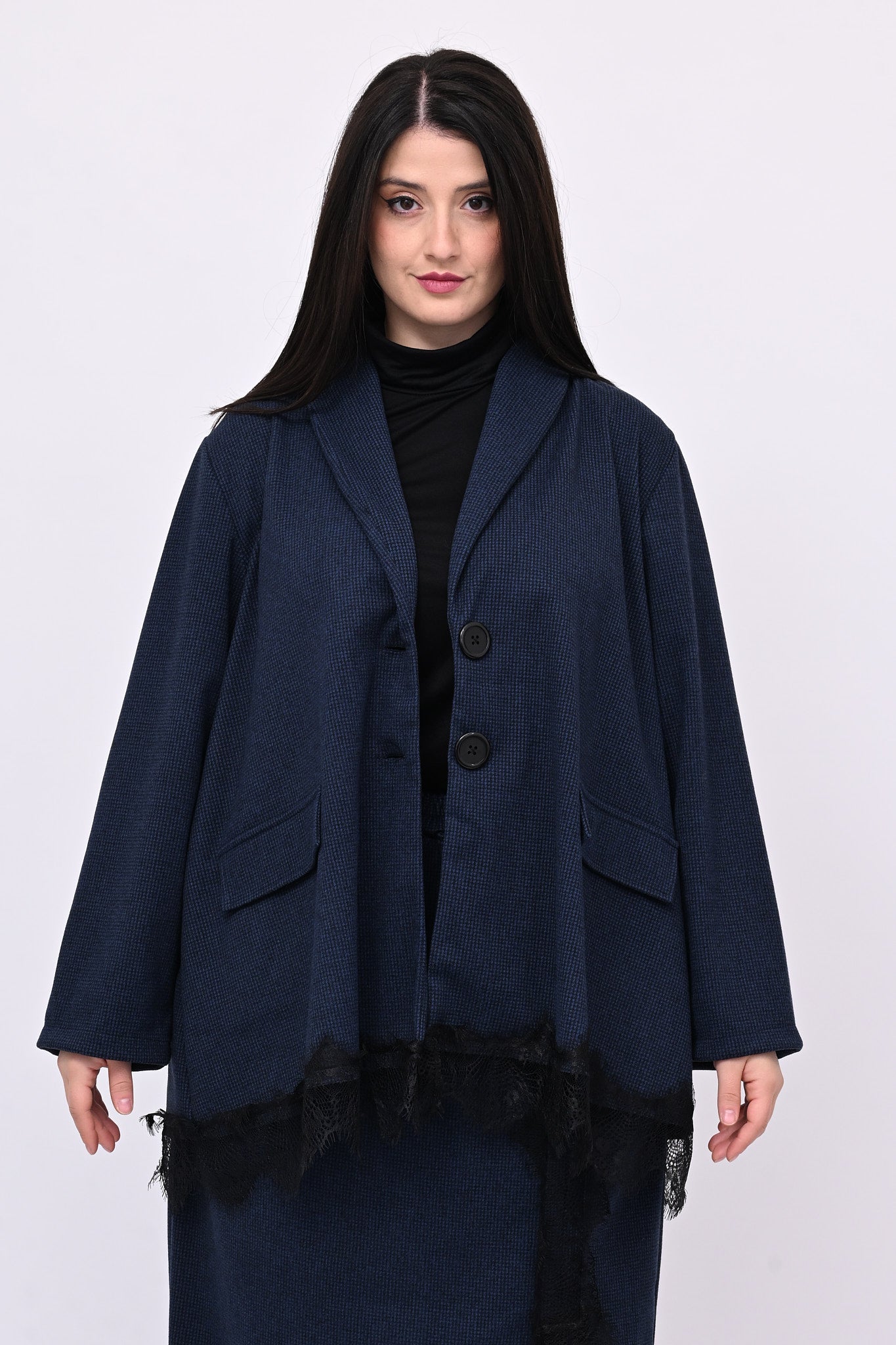 Tailleir in piedepull misto lana composto da: giacca modello over con bottoni frontali e tasche finte, e gonna longuette dritta con spacco. Gli inserti in pizzo nero sui bordi aggiungono un tocco di raffinatezza, creando un contrasto sofisticato. Perfetto per chi ricerca uno stile easy chic, femminile e moderno.