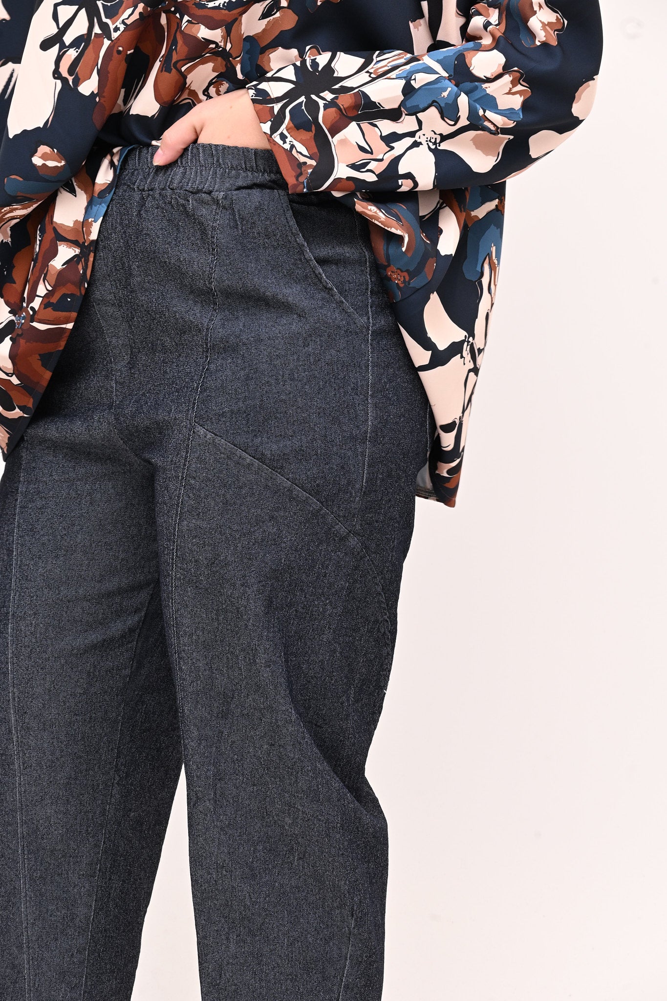 Jeans elasticizzato, modello baggy, con elastico in vita, tasche a vista sul davanti e a toppa nel retro. La vestibilità rilassata lo rende ideale per outfit giornalieri e trendy.