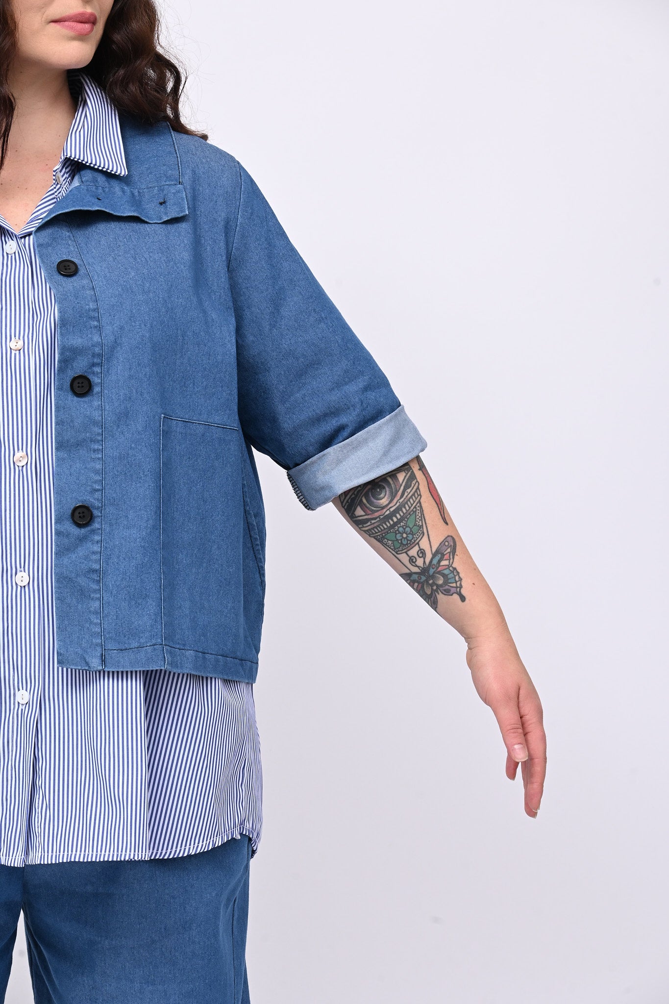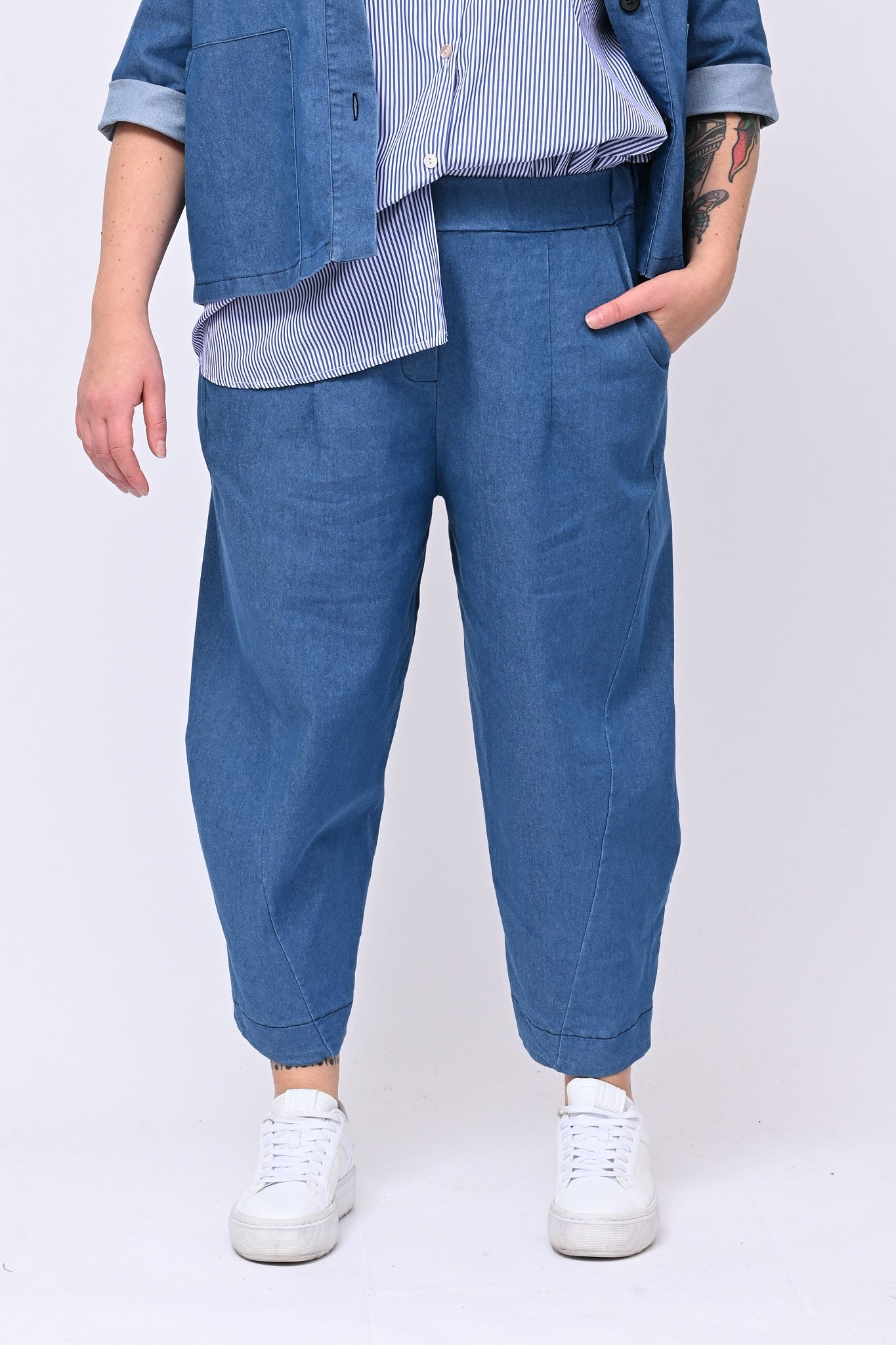 Completo in denim elasticizzato che unisce stile sportivo e versatilità moderna. La giacca crop ha bottoni frontali, colletto, maniche 3/4 e pinces posteriori. Il pantalone modello carota, con elastico in vita e tasche laterali, completa il look con comfort e movimento. Perfetto per chi ricerca un outfit contemporaneo e sporty chic.