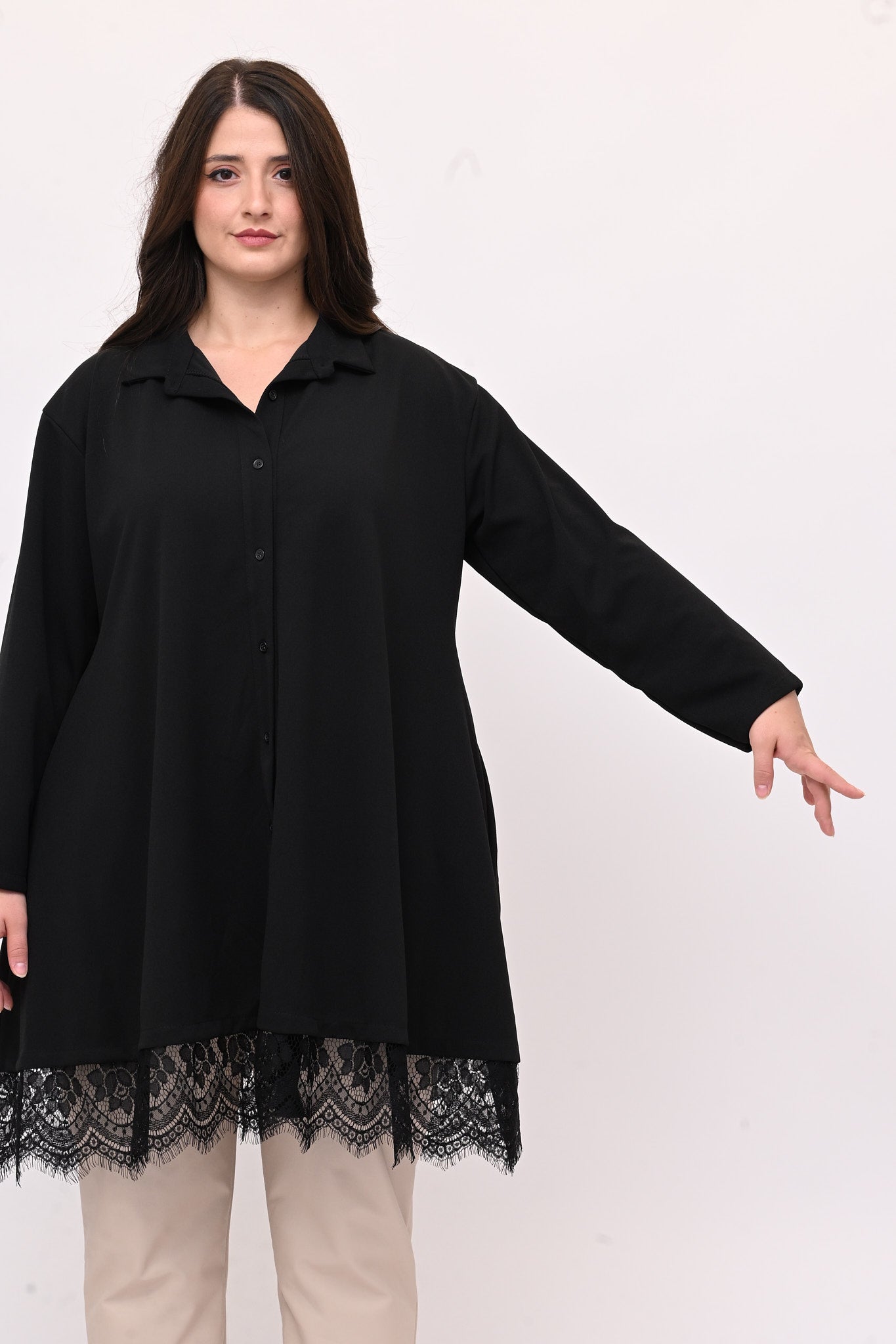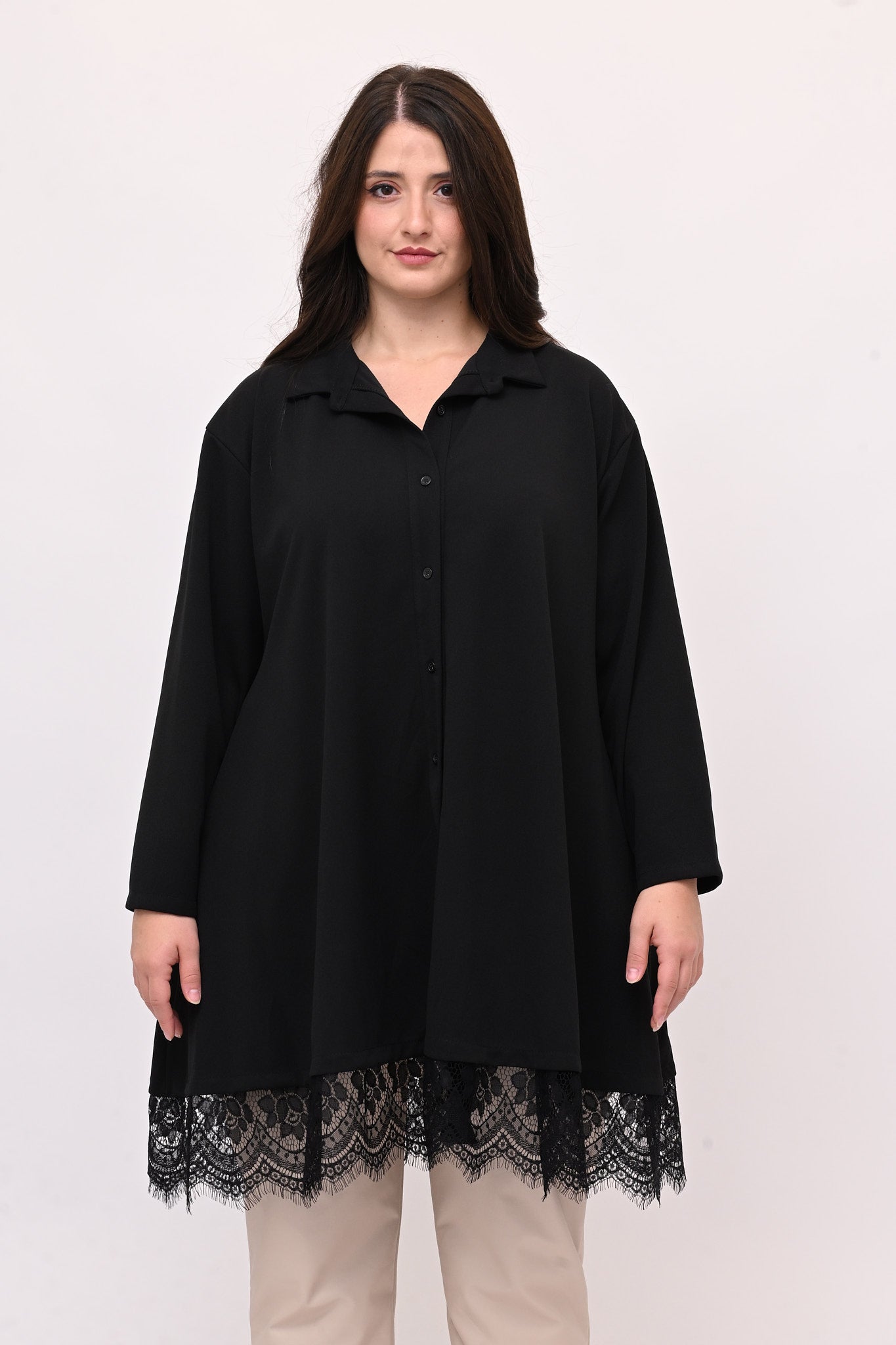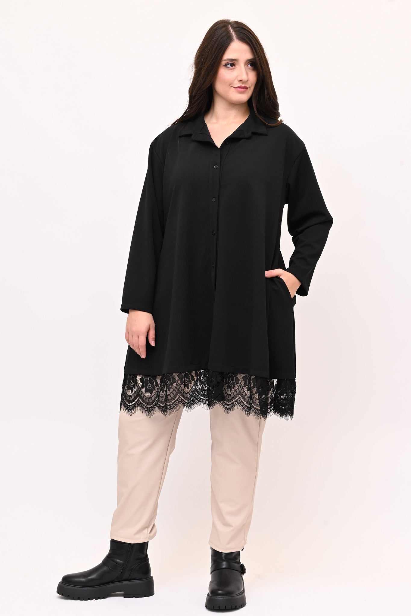 Camicia in crèpes, con tasche e pizzo sul bordo che dona un tocco raffinato. La vestibilità rilassata valorizza la silhouette. Perfetta per chi cerca uno stile sofisticato senza rinunciare alla comodità.