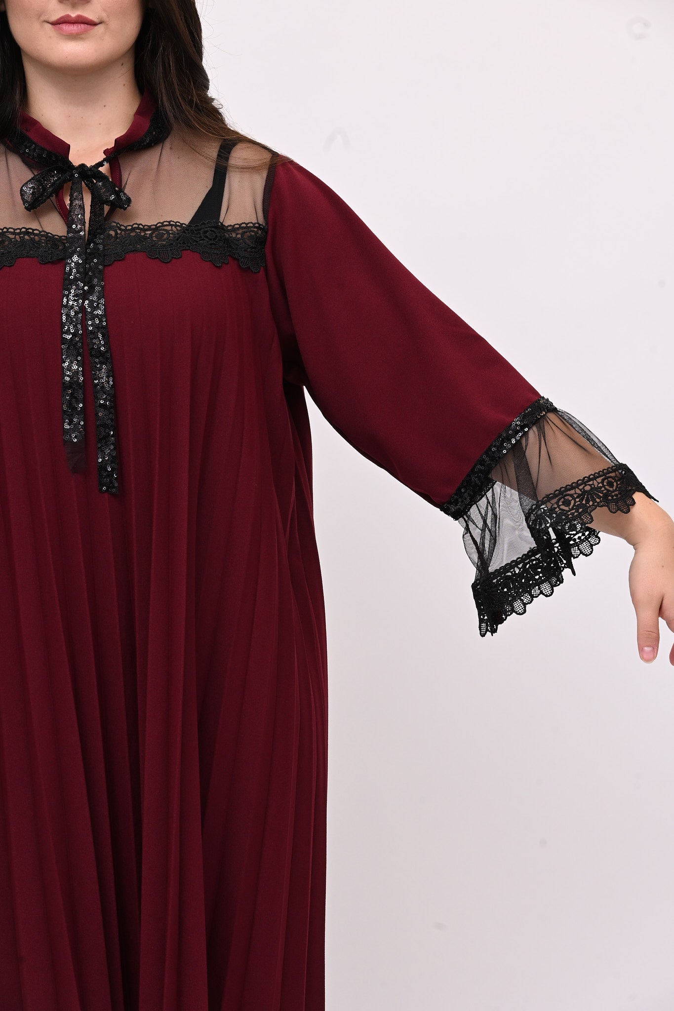 Abito plissè al ginocchio con maniche a tre quarti, inserti di tulle e passamaneria. La combinazione di tessuti dona leggerezza, femminilità ed eleganza. Perfetto per un look raffinato e dallo stile contemporaneo.