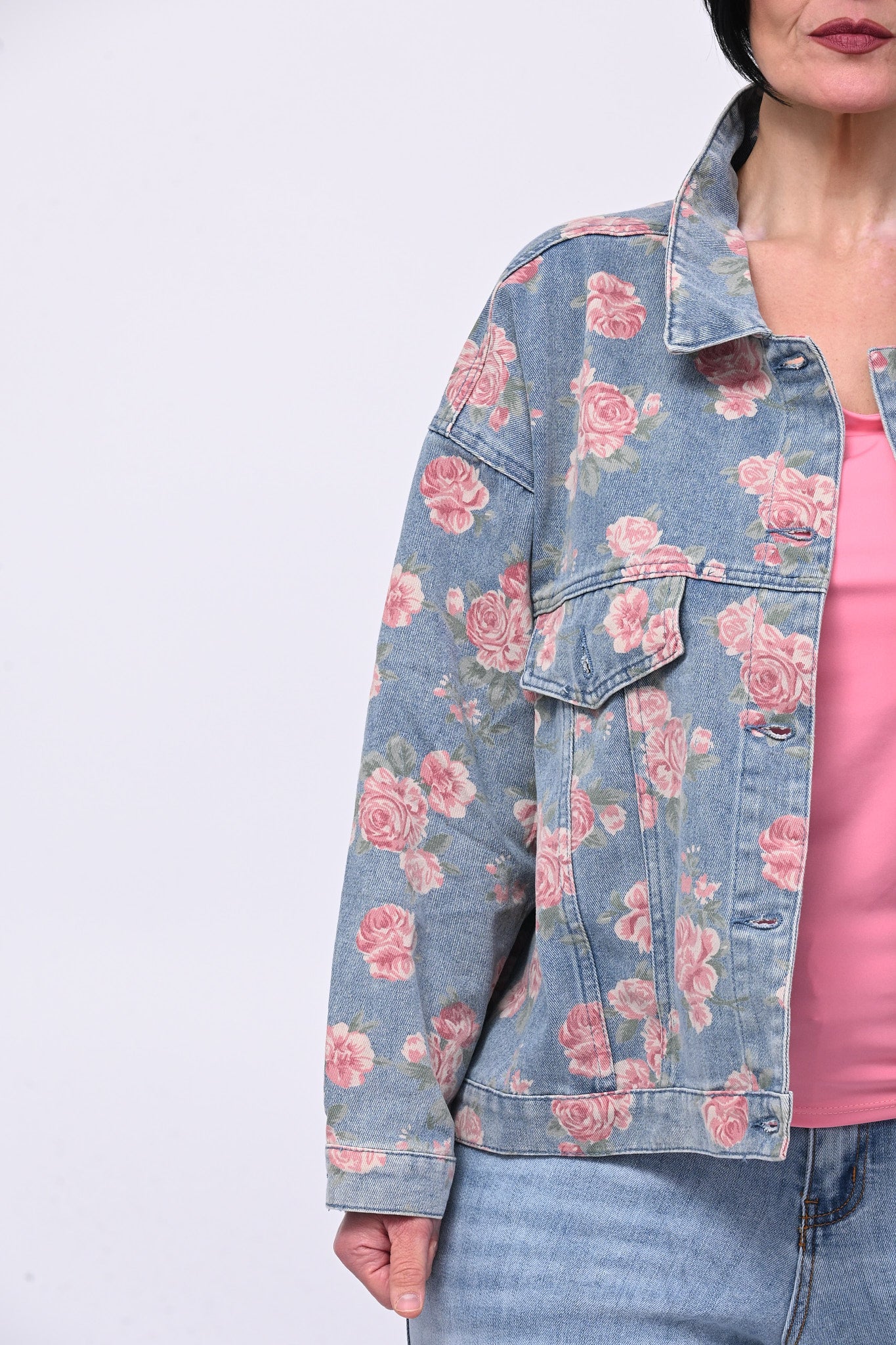 Giacca denim con stampa floreale, con finte tasche e bottoni in metallo, che reinterpreta il classico in chiave romantica e contemporanea. Un capo versatile e sofisticato, ideale per chi ricerca un equilibrio tra comfort e femminilità e stile.