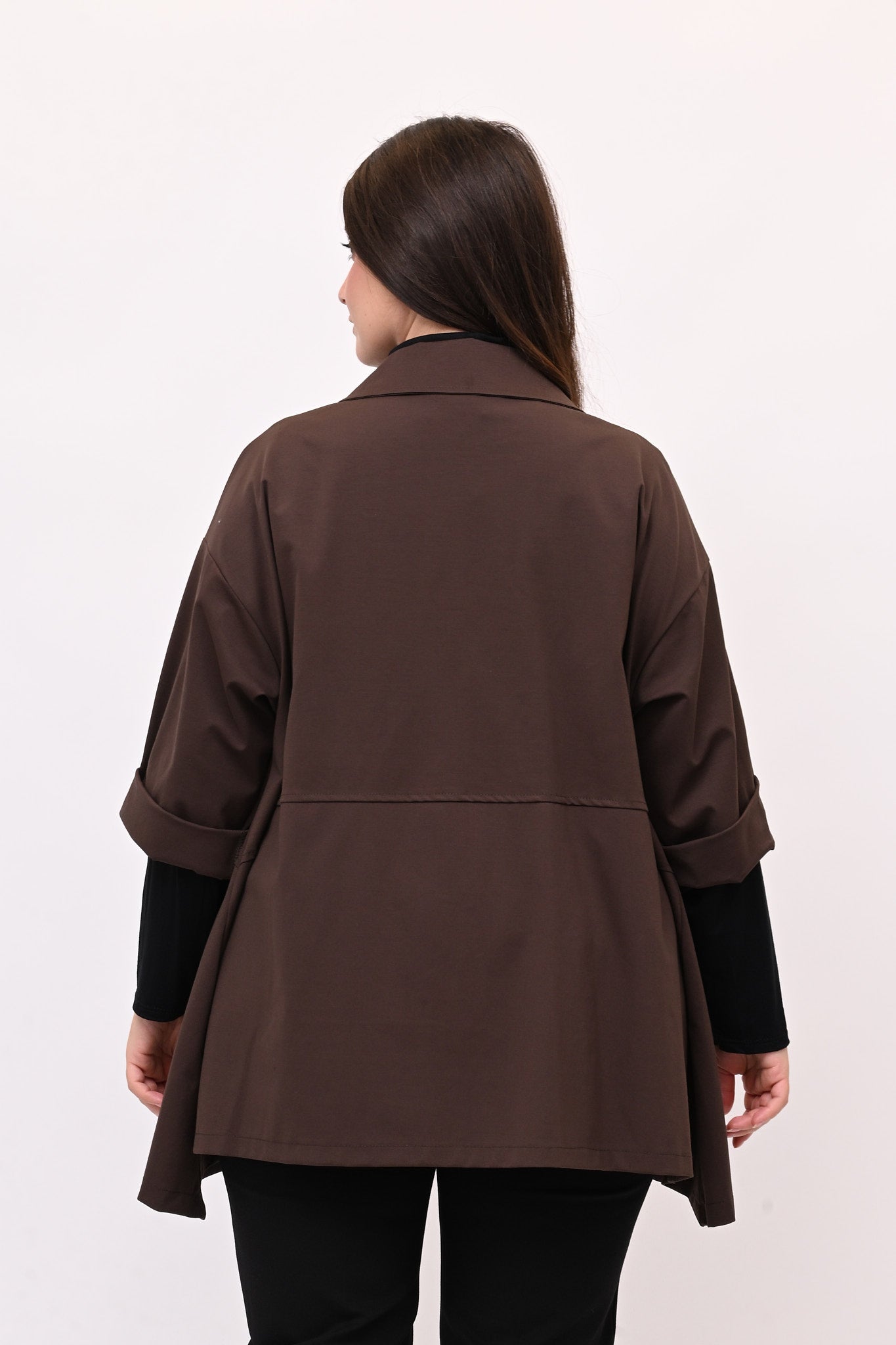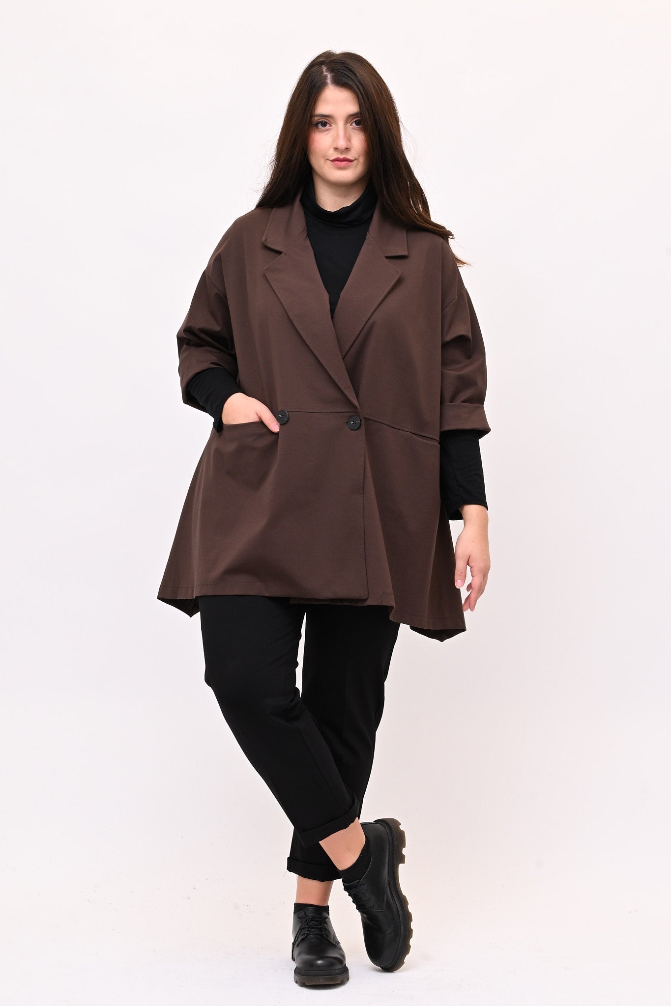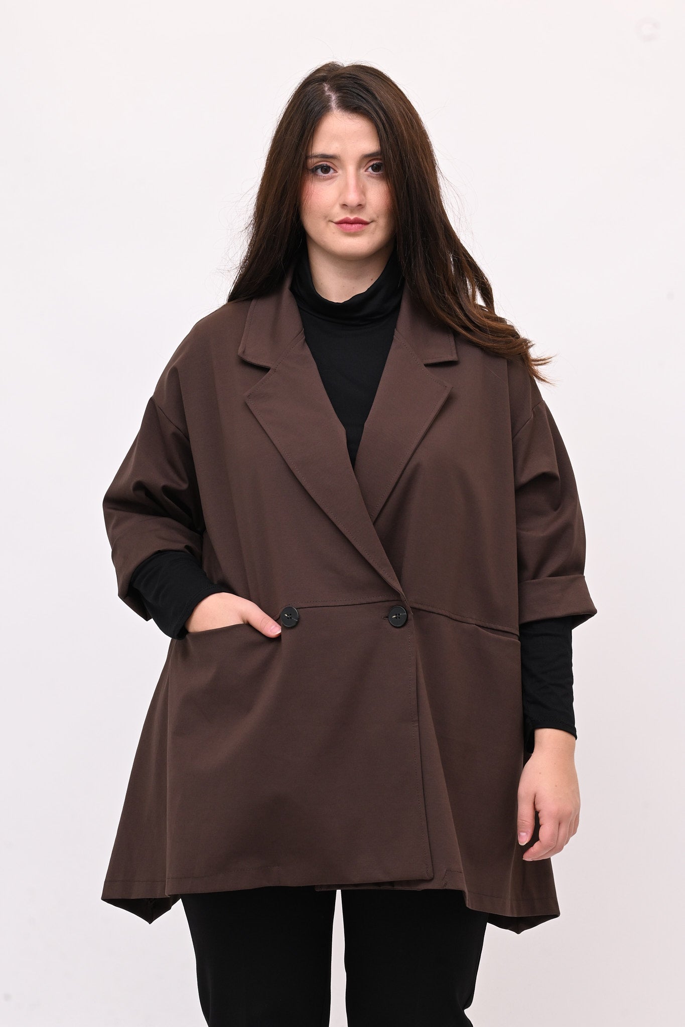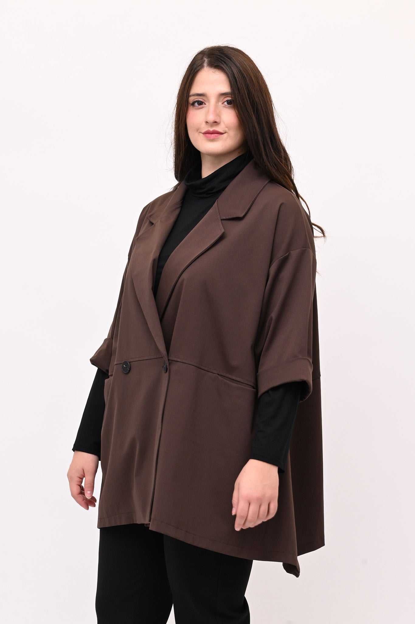 Giacca doppiopetto con rever a lancia, manica tre quarti e taschine frontali a filo. Taglio uomo oversize, molto elasticizzata, nasce per accompagnare le forme senza evidenziarle. Un capo veloce ma risolutivo, adatto da indossare in ufficio e per uscite urban chic.