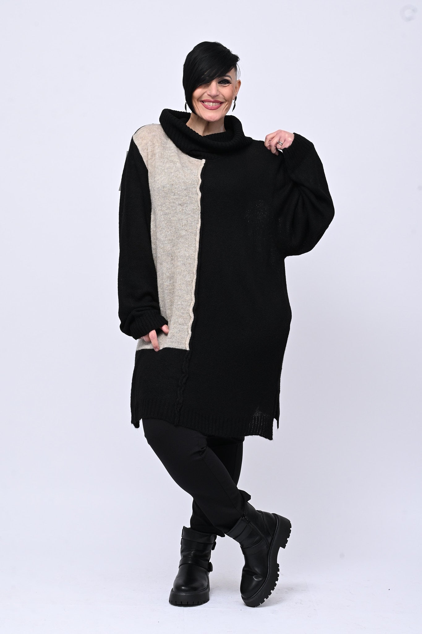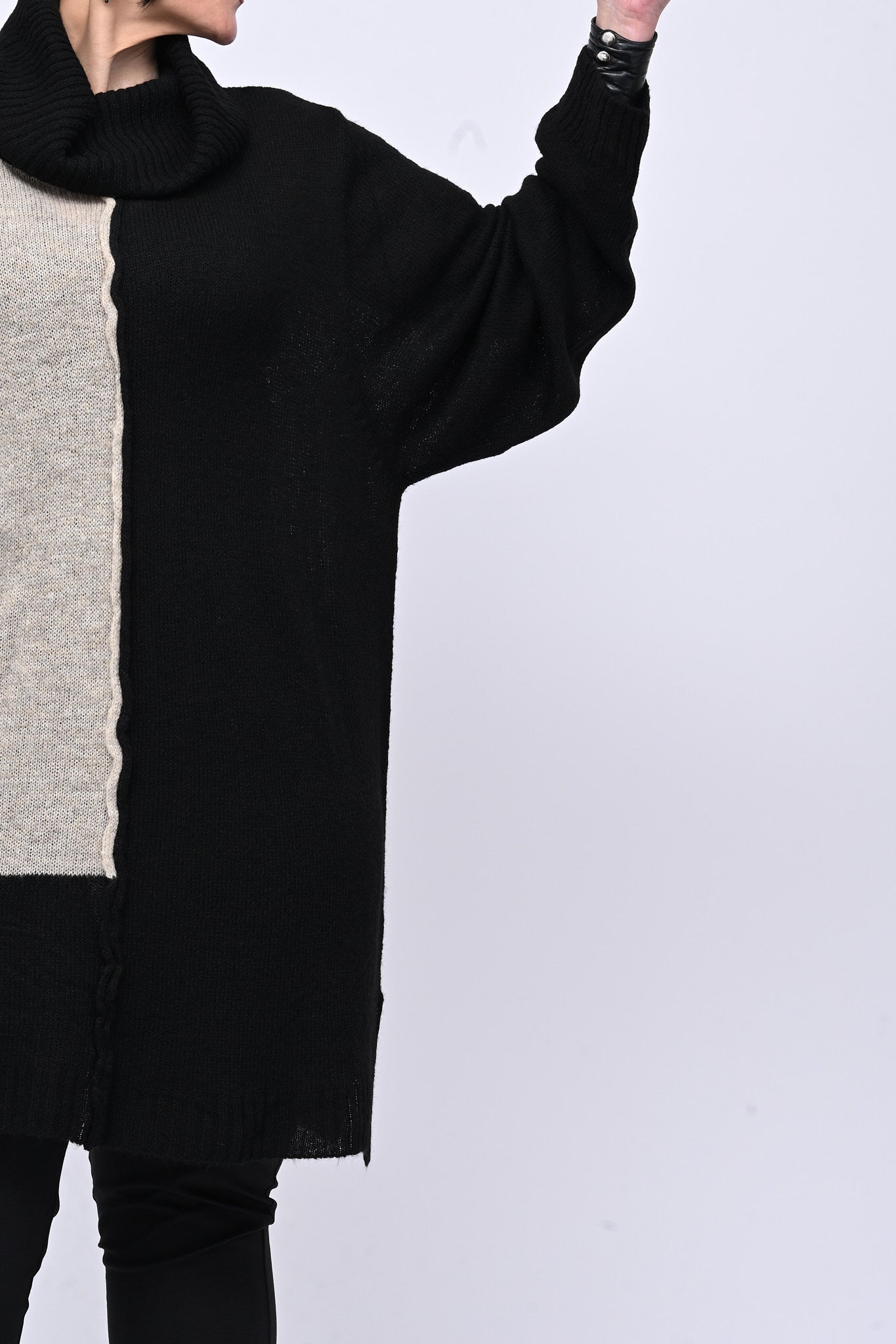 Pull in misto lana, con collo alto morbido, bicolore, e cucitura frontale.  Raffinato, versatile e dal taglio generoso e avvolgente, garantisce libertà di movimento e calore. Un capo essenziale che si adatta a molteplici occasioni, dal casual al più ricercato.