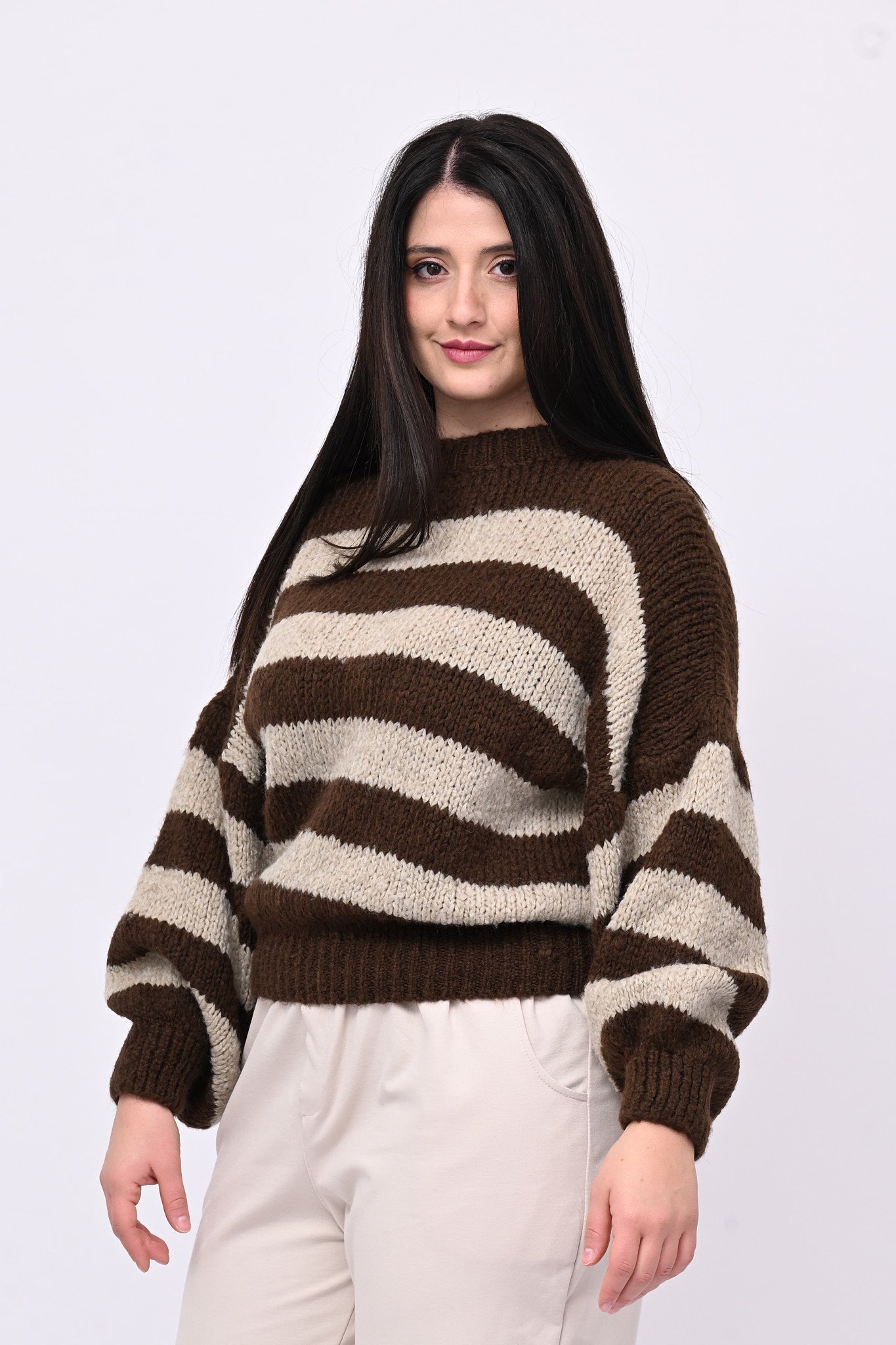 Pull in misto lana, fantasia a righe, girocollo con cannolet finale. Perfetto per chi ricerca comfort e calore, in un design moderno e versatile che unisce praticità e stile contemporaneo.