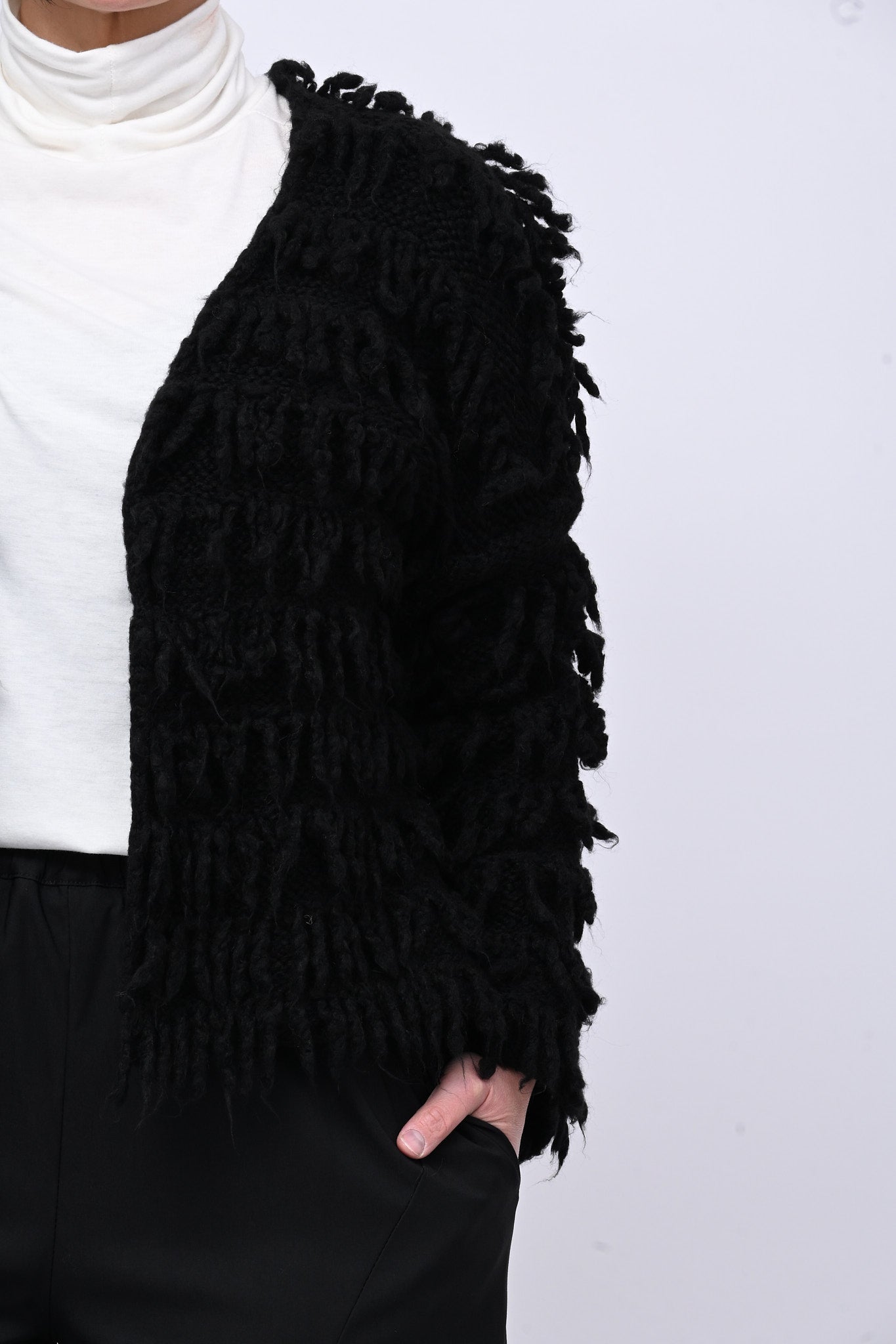 Cardigan in misto lana, senza abbottonatura, con frange che aggiungono movimento e personalità. Caldo, comodo e versatile, unisce stile, divertimento e praticità.