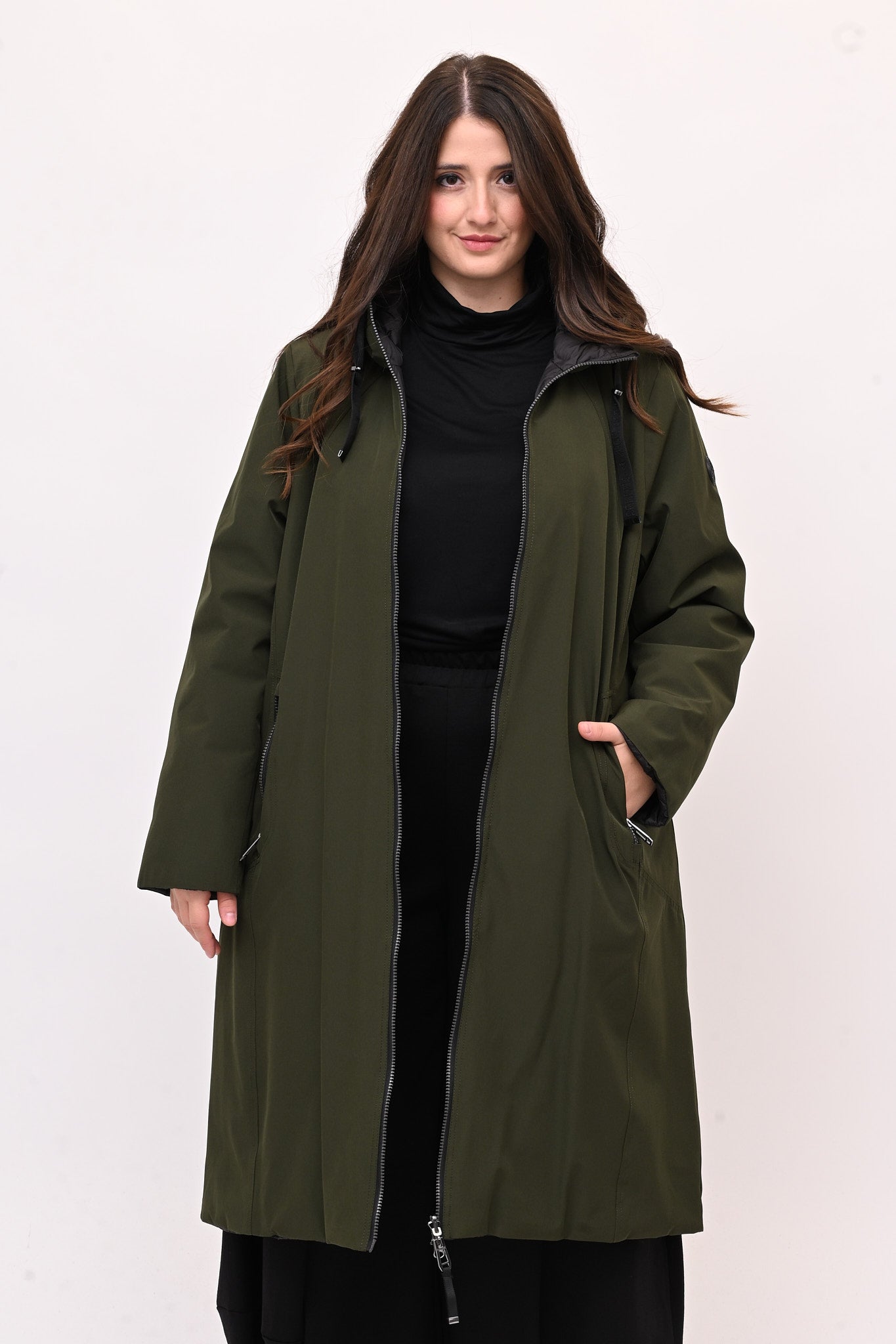 Cappotto imbottito reversibile, che offre due look distinti in un unico capo. Il tessuto liscio su un lato si contrappone alla trapuntatura dell'altro. Impermeabile, con cappuccio integrato, zip e tasche laterali, lunghezza al ginocchio. Pratico e leggero e si adatta a diversi contesti, dal casual al piu formale. Ideale per chi ricerca protezione e stile contemporaneo.