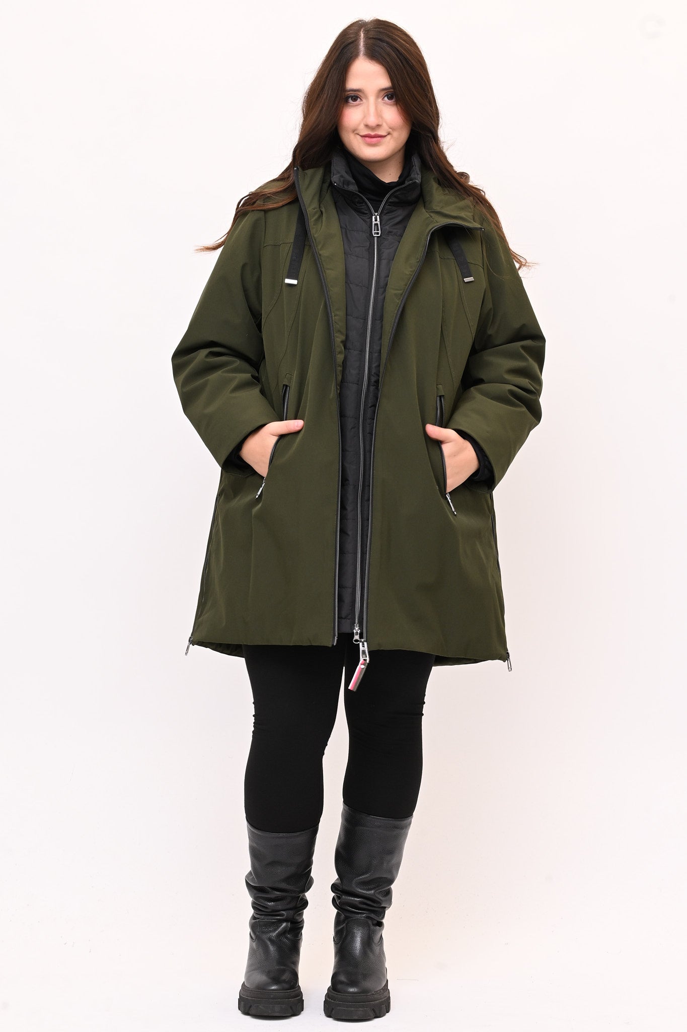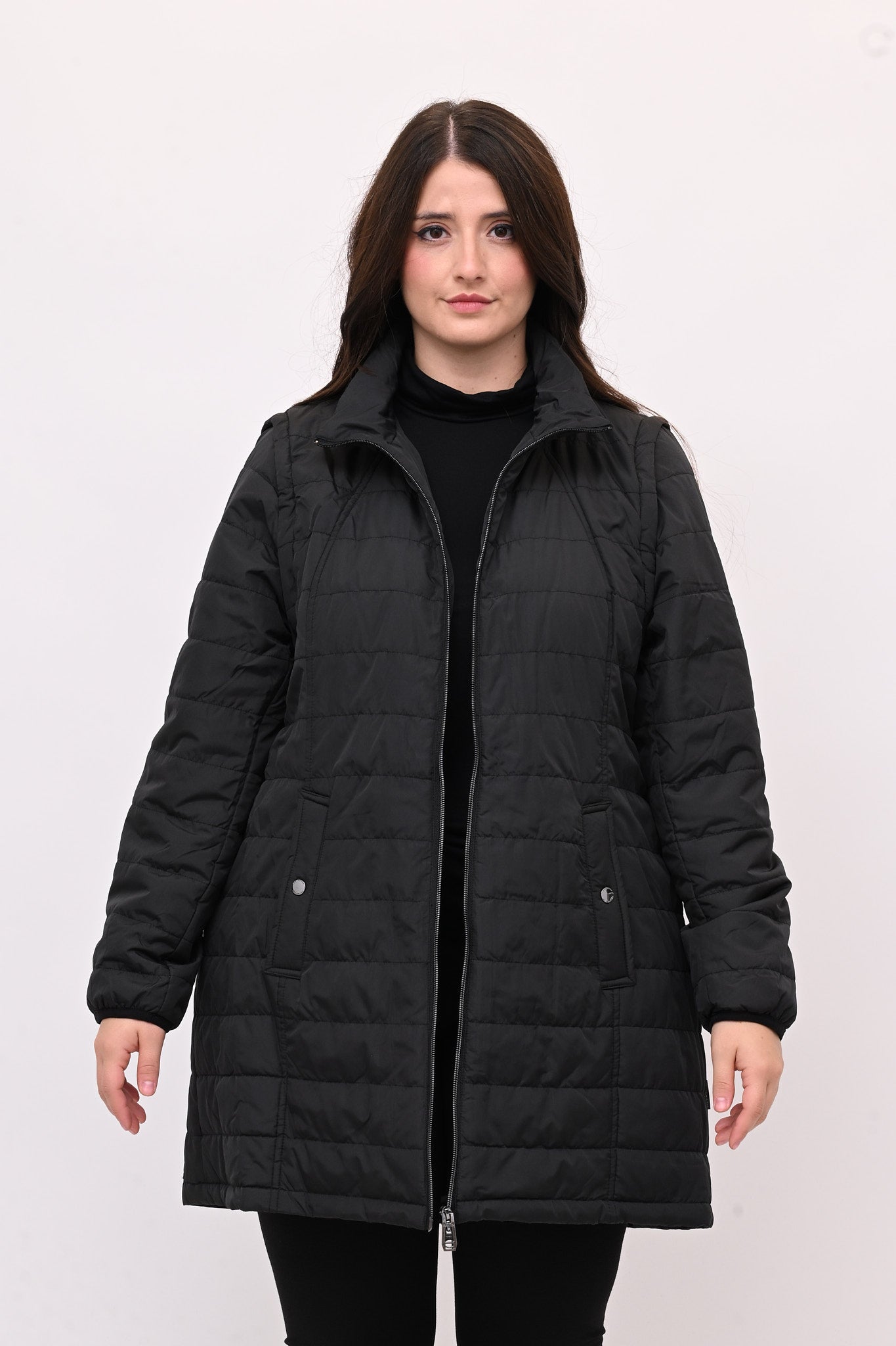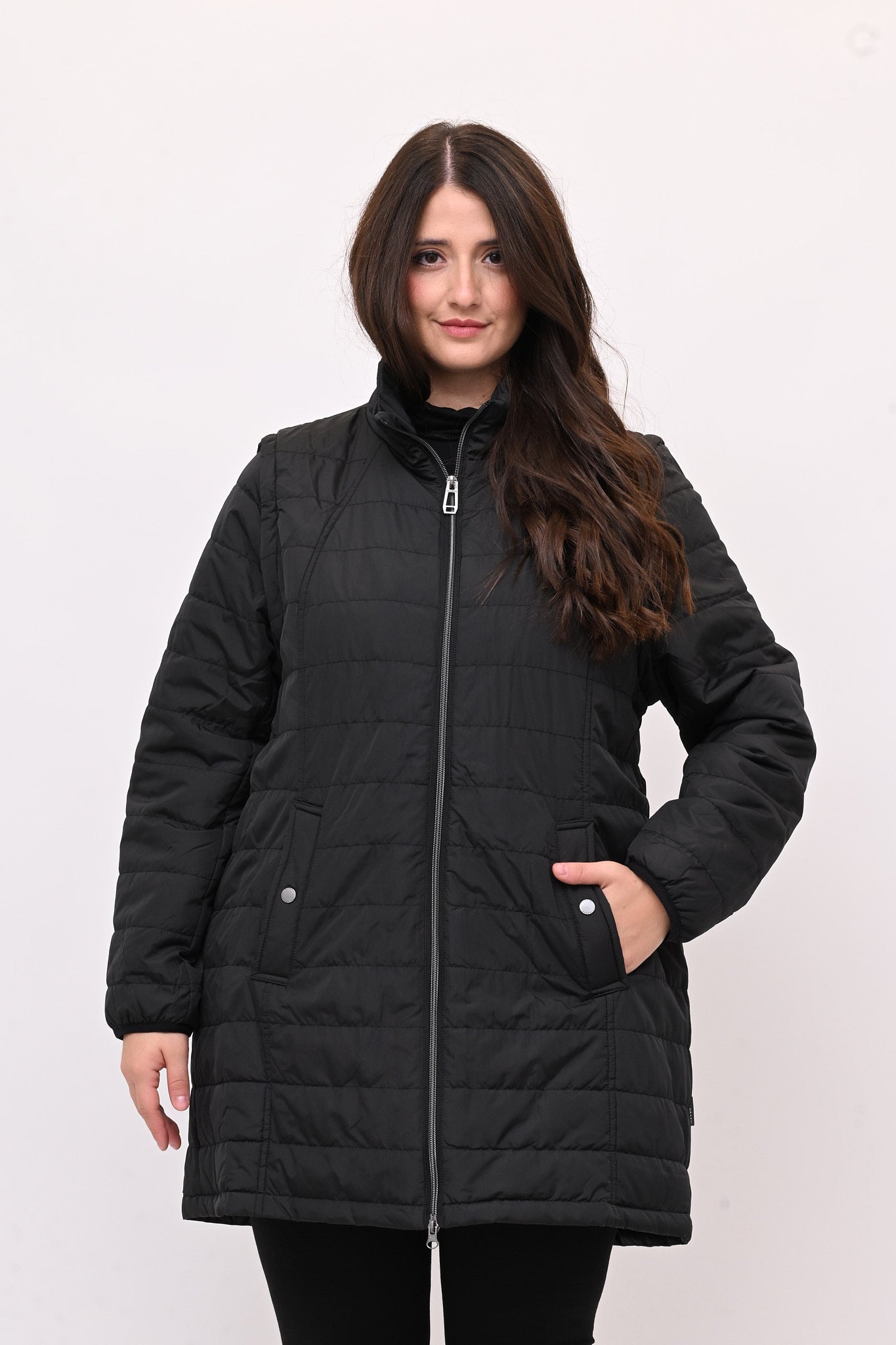 Piumino modulare doppio pensato per massima adattabilità. La base trapuntata presenta zip centrale, collo a lupetto e tasche laterali, mentre la giacca superiore imbottita ha cappuccio integrato e tasche. Due lampo laterali consentono di aprire gli spacchi per garantire comfort e libertà di movimento. Perfetti per essere indossati separatamente, insieme creano un sistema di isolamento termico superiore.