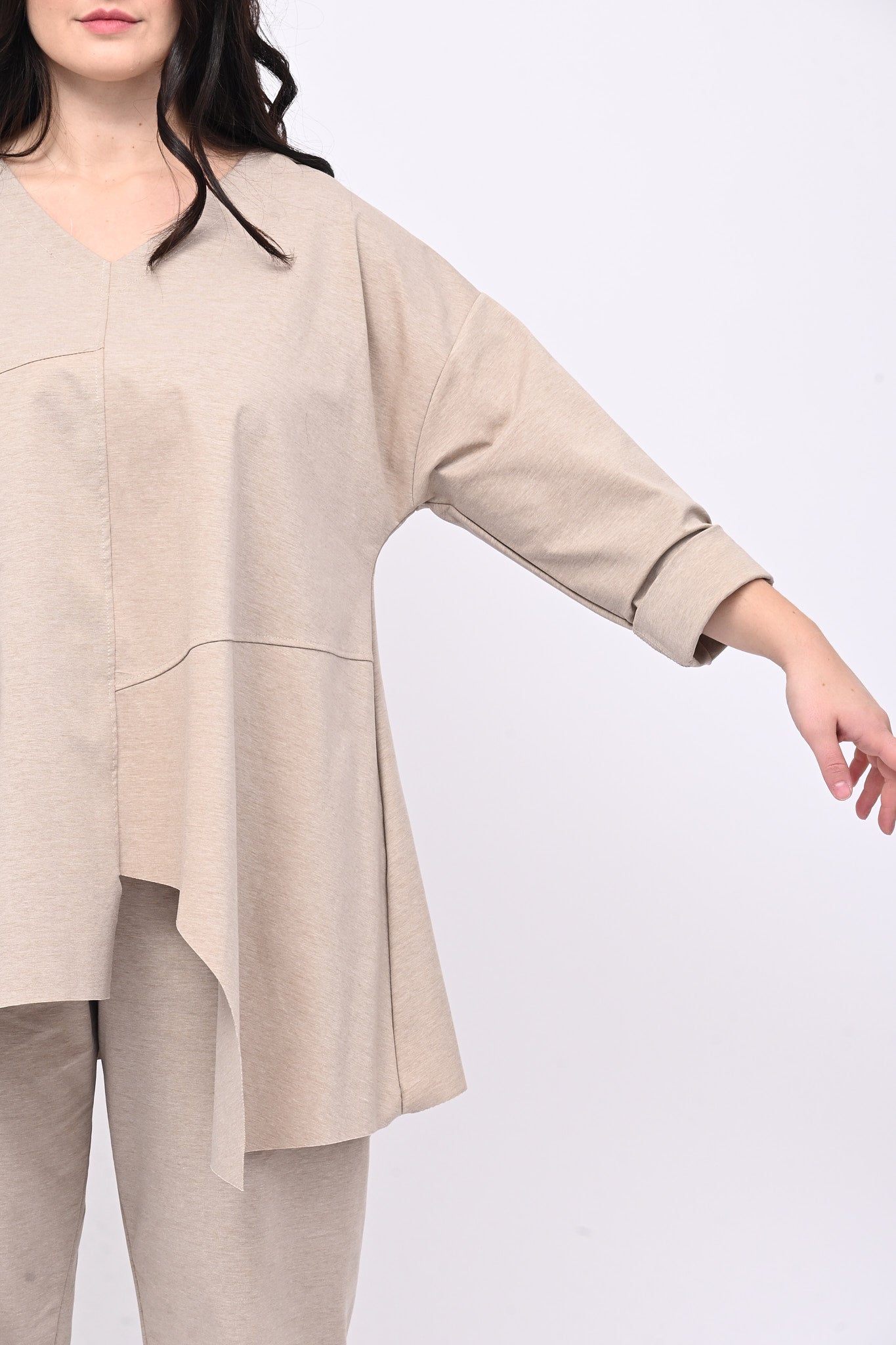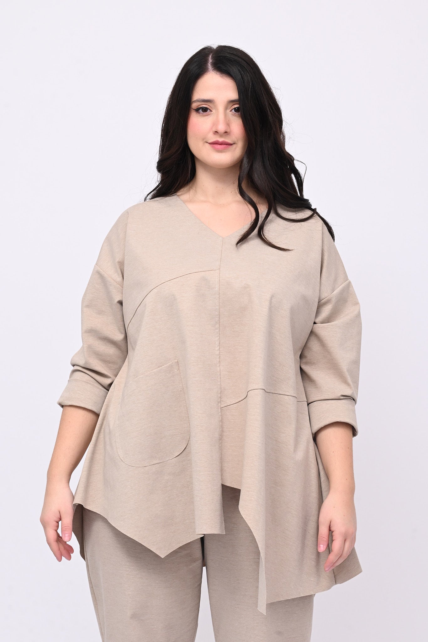 Maglia in punto Milano, con scollo a V, cuciture a vista e tasca frontale. Il design è contemporaneo e versatile e il taglio asimmetrico sul fondo aggiunge movimento e personalità. La vestibilità rilassata garantisce comfort e la rende perfetta per look moderni e minimalisti.