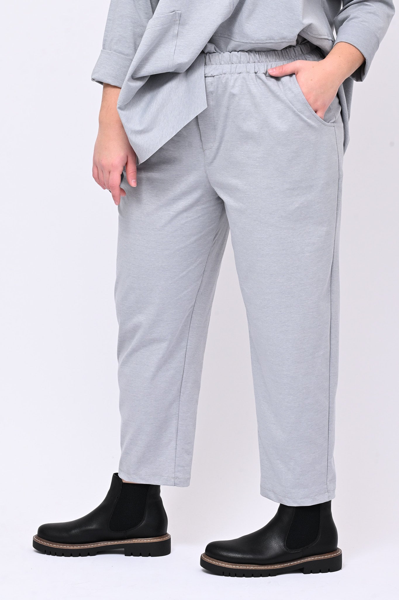 Pantalone in punto Milano, con elastico in vita, tasche laterali e posteriori, silhouette baggy. Versatile e confortevole, combina comfort e stile con un design pensato per la praticità quotidiana.