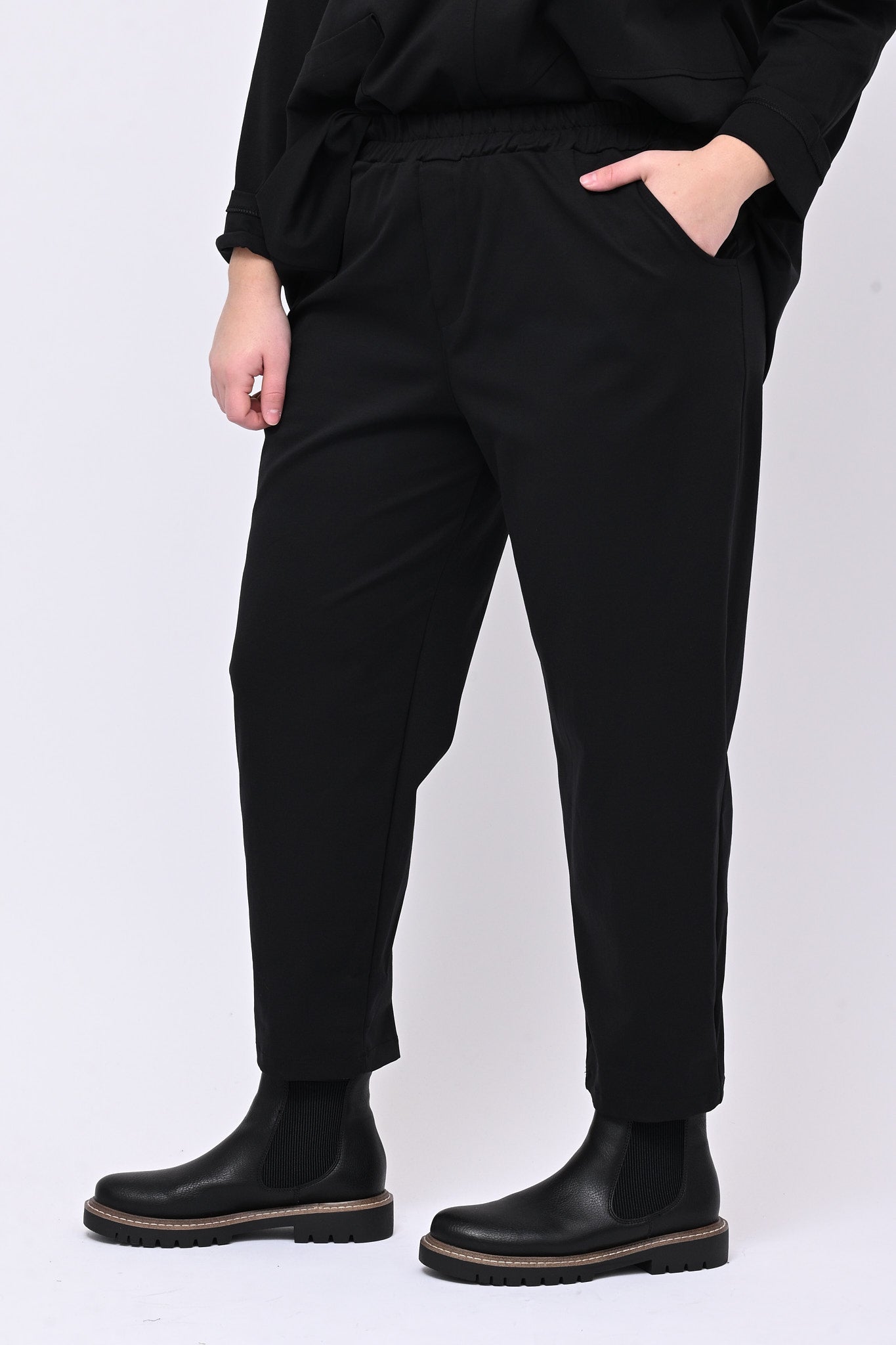 Pantalone in punto Milano, con elastico in vita, tasche laterali e posteriori, silhouette baggy. Versatile e confortevole, combina comfort e stile con un design pensato per la praticità quotidiana.