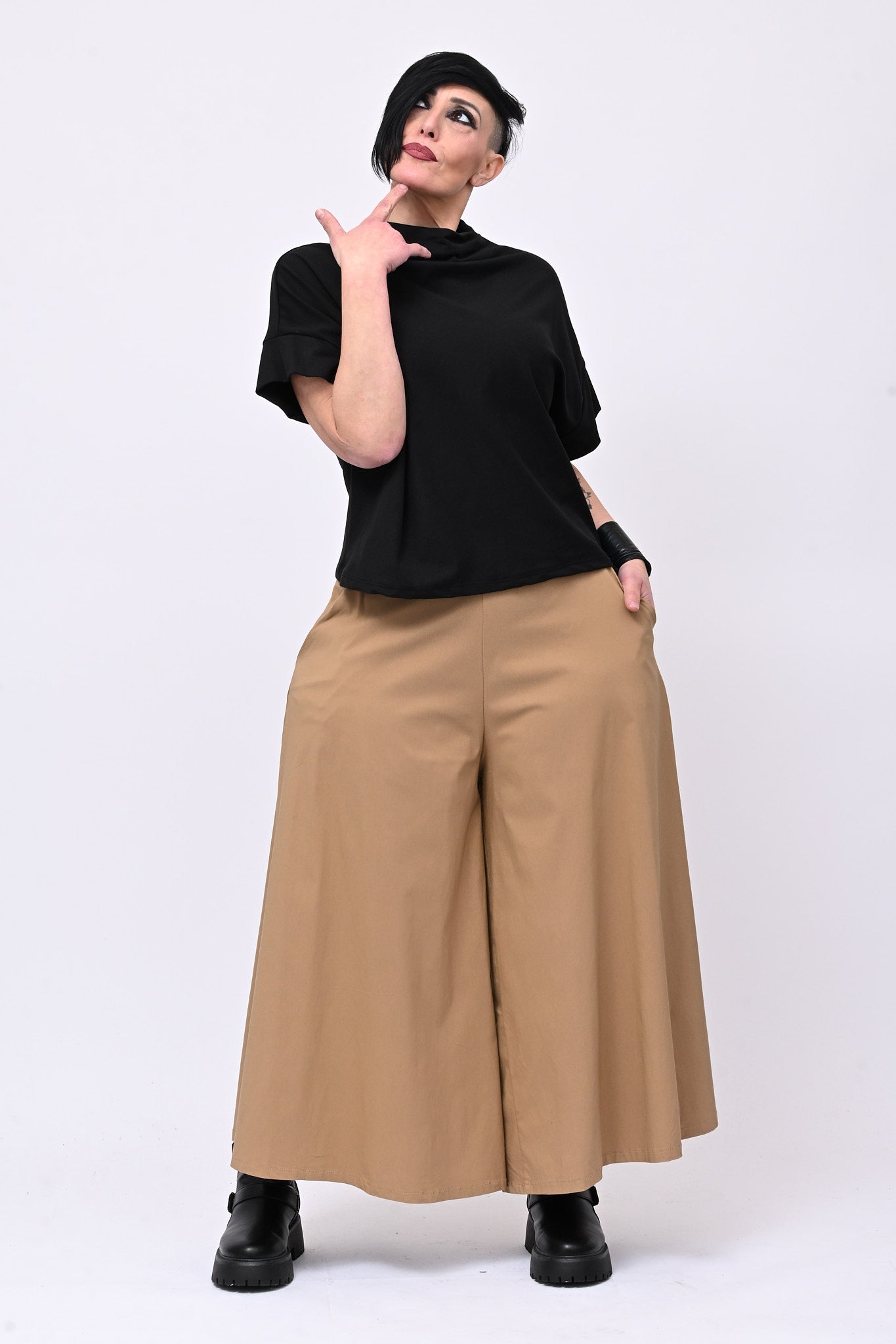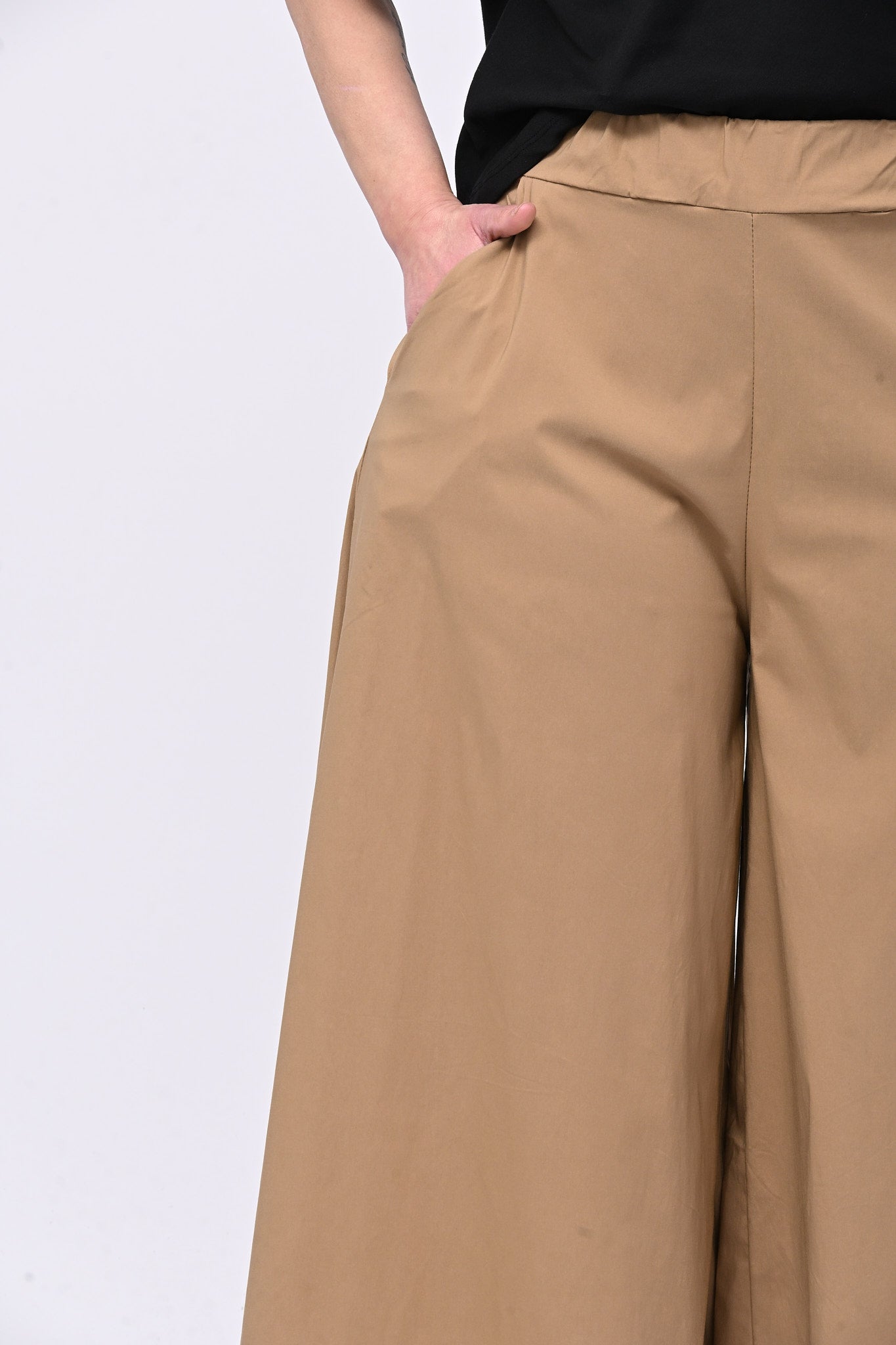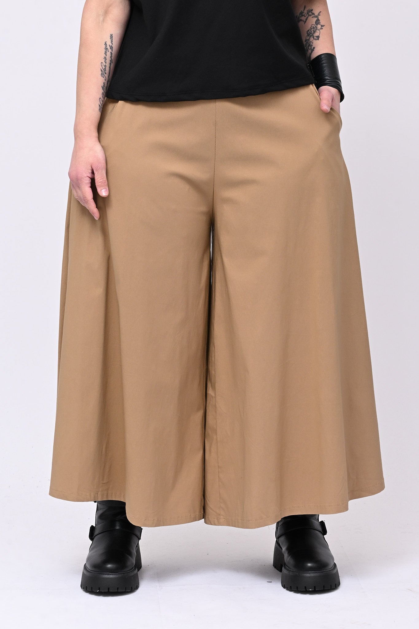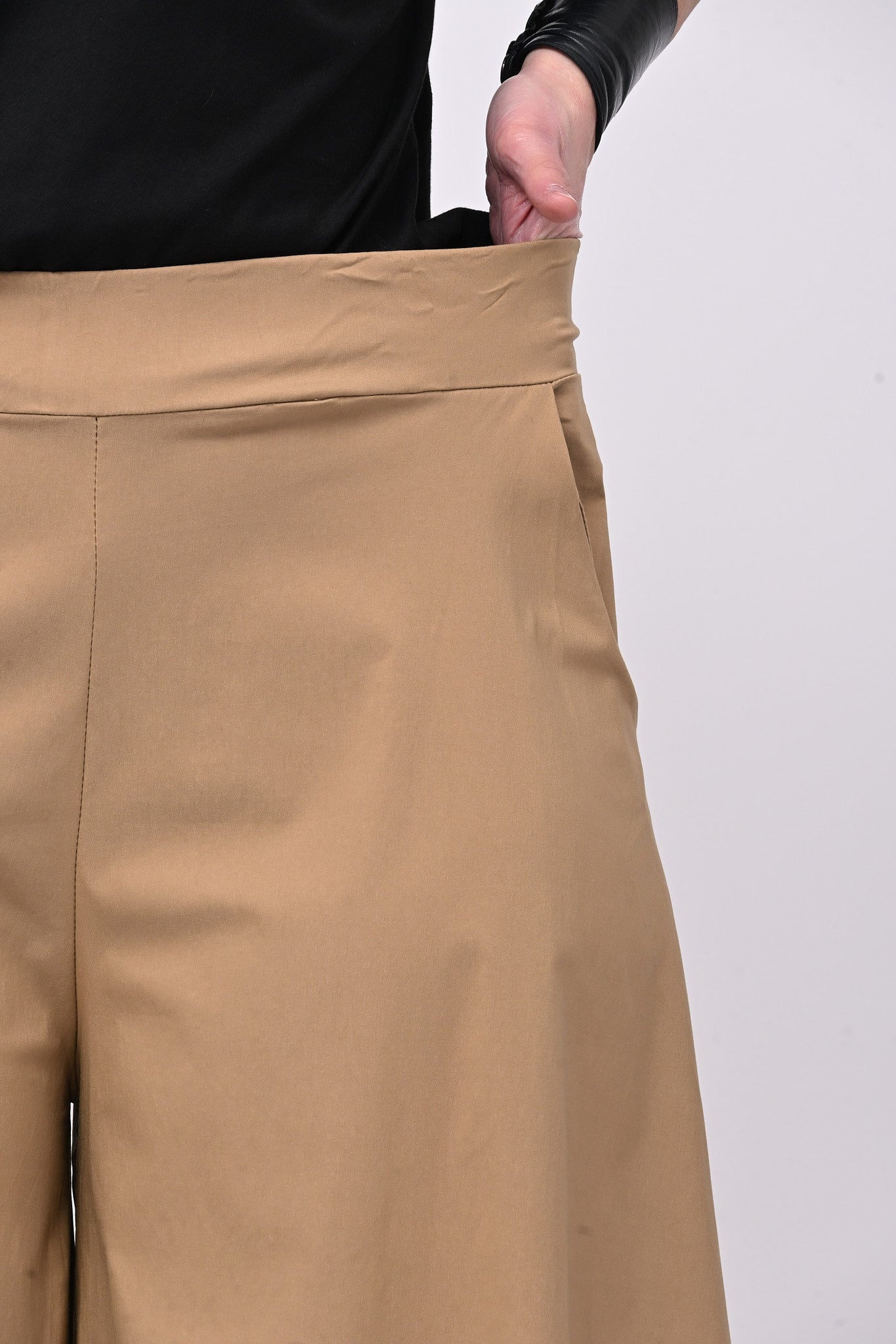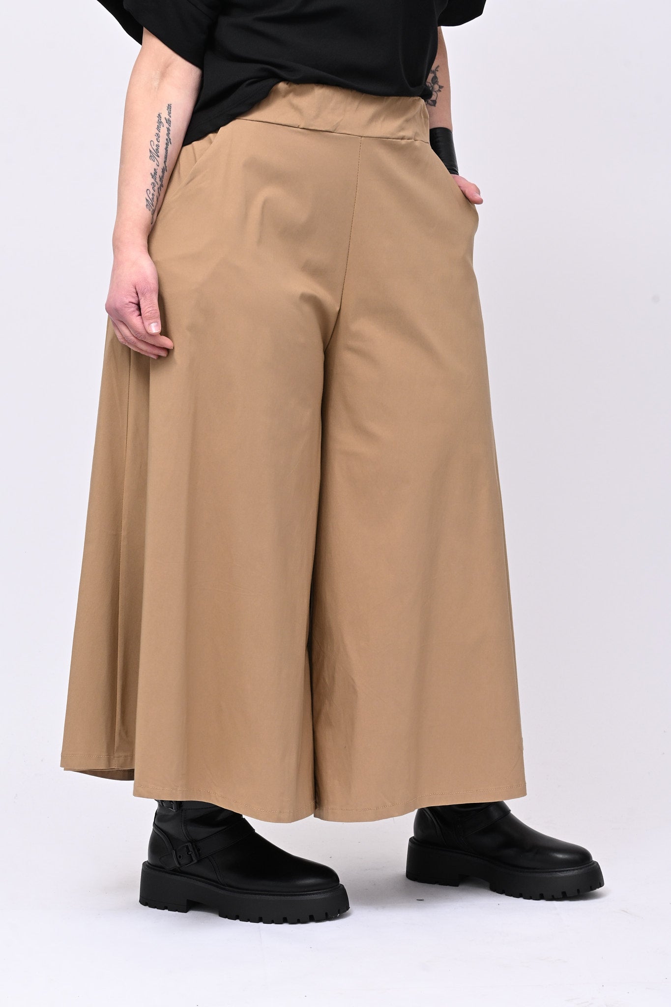 Pantagonna in bengalina elasticizzata, con elastico in vita e tasche laterali. Praticità e stile in un capo che ha la libertà di movimento di un pantalone e l'eleganza visiva di una gonna. Design grintoso e contemporaneo, ideale per chi non vuole rinunciare a comodità e personalità.