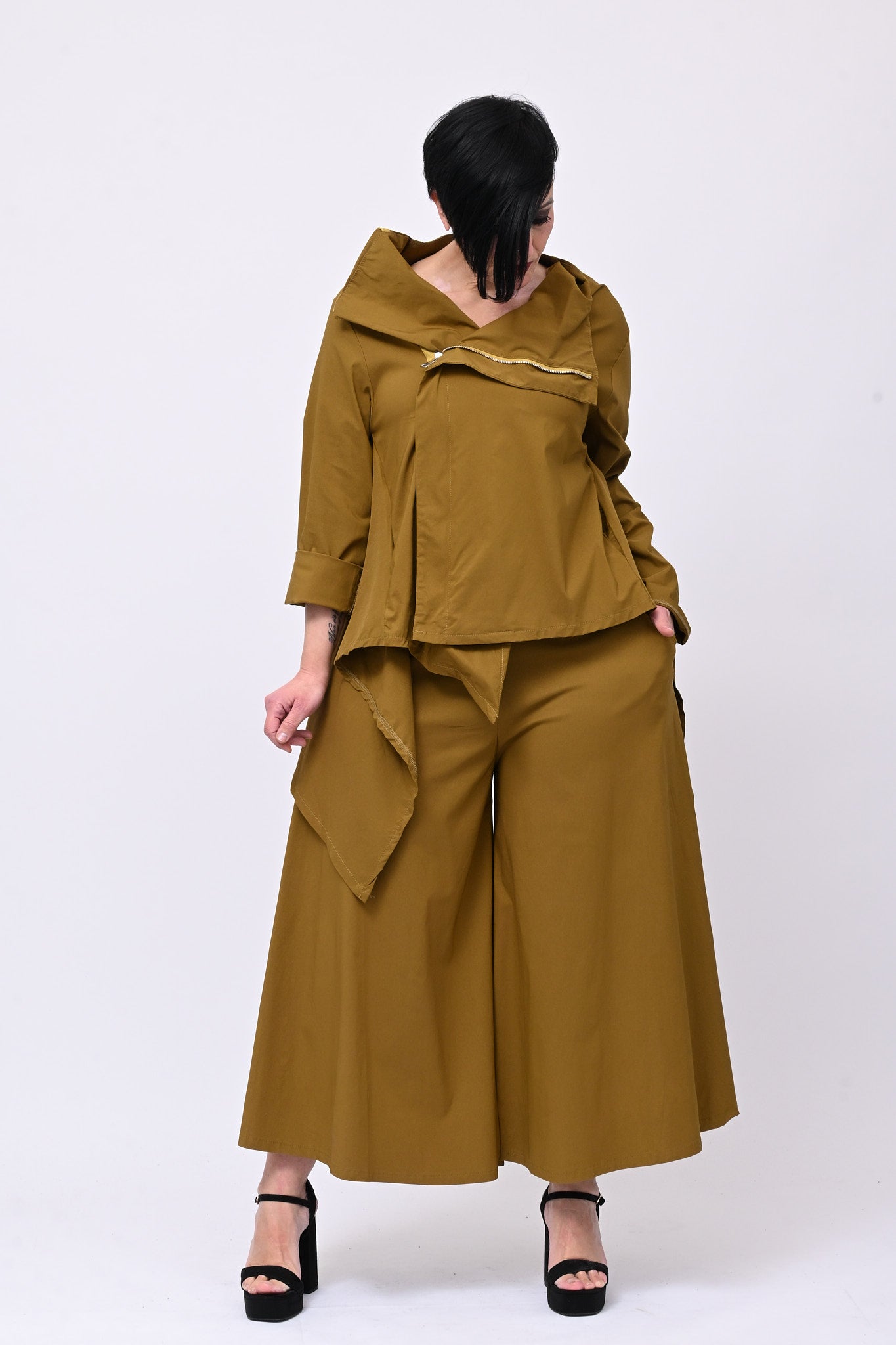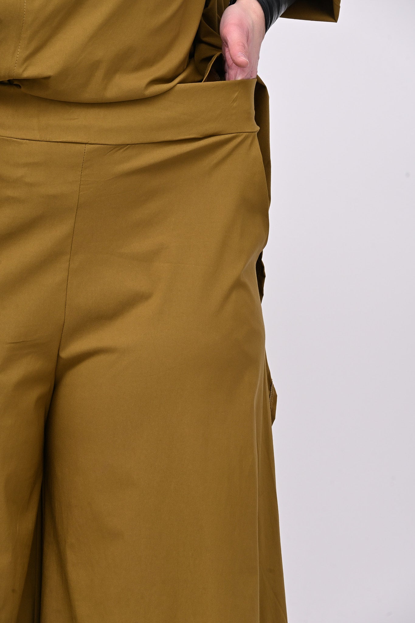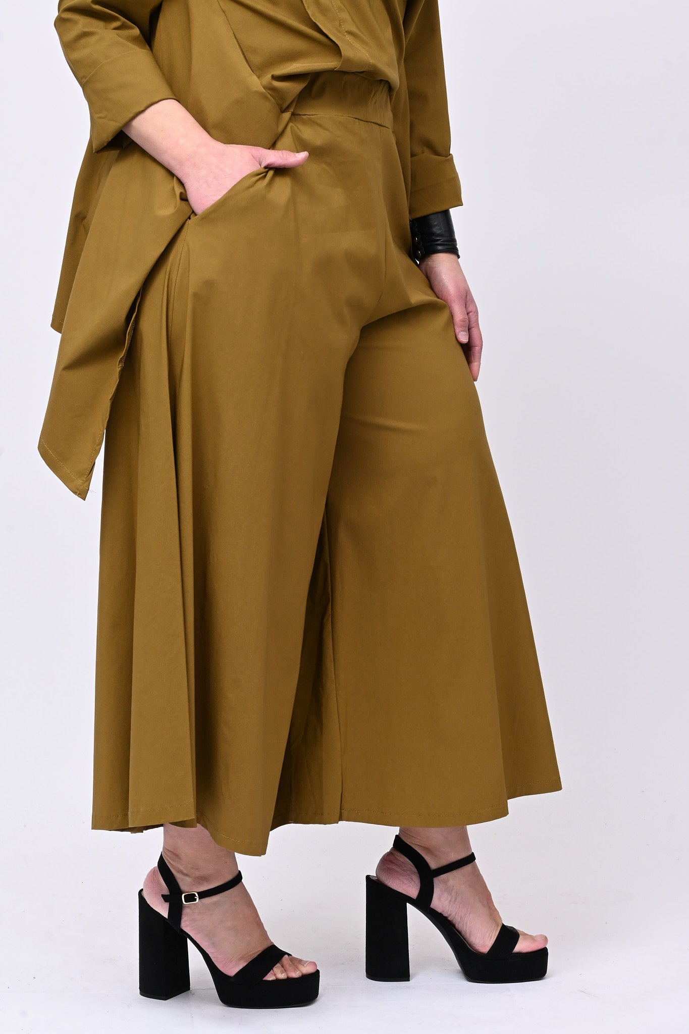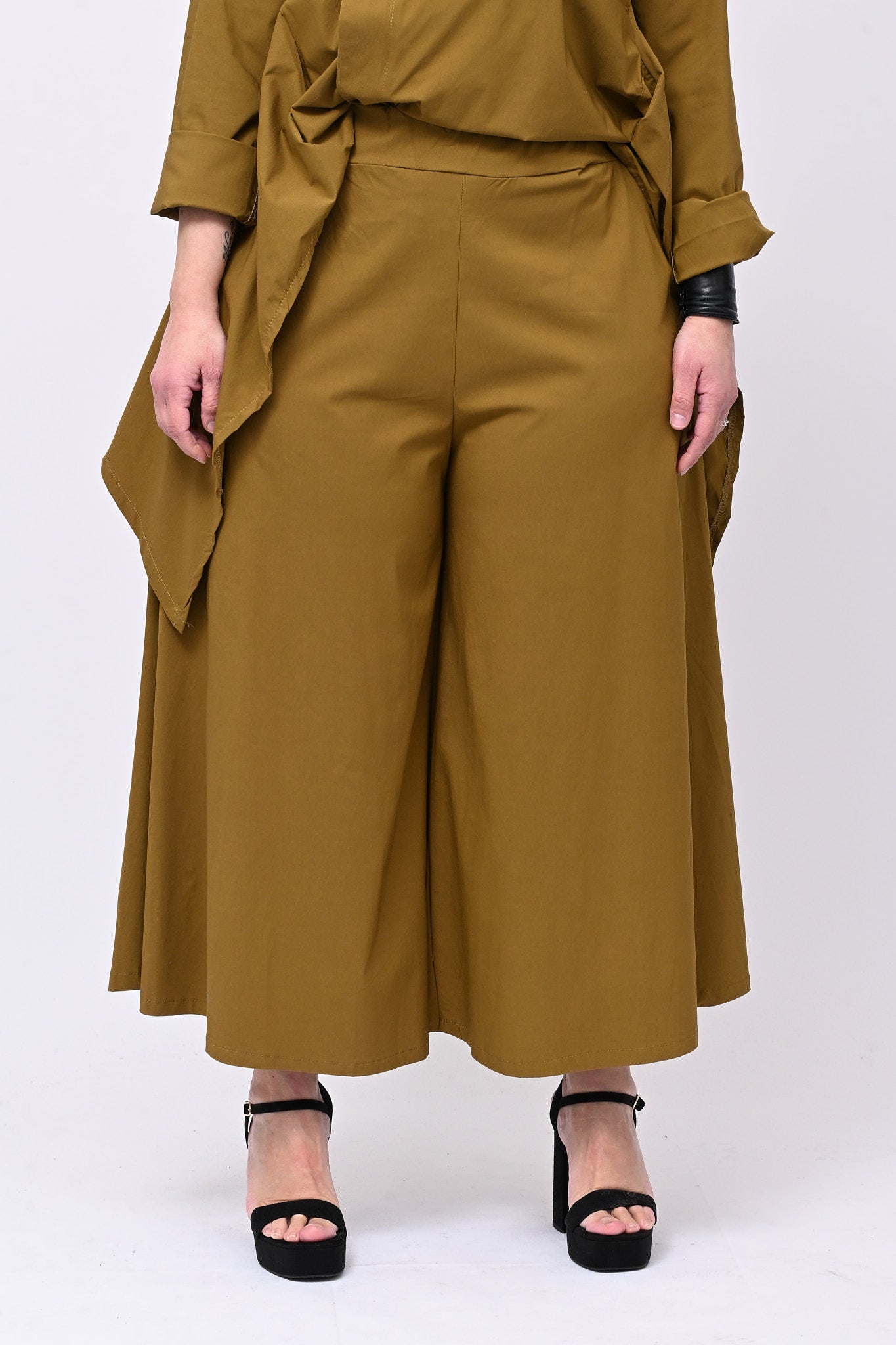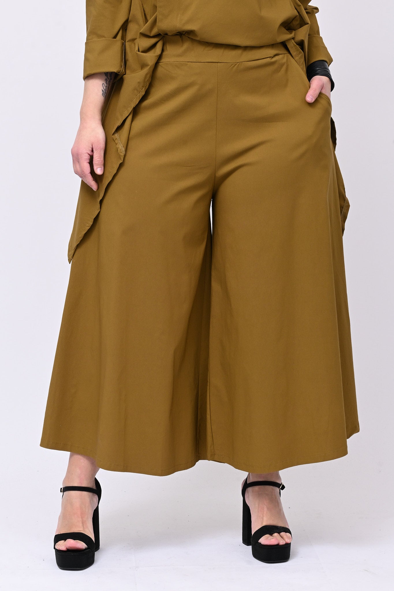 Pantagonna in bengalina elasticizzata, con elastico in vita e tasche laterali. Praticità e stile in un capo che ha la libertà di movimento di un pantalone e l'eleganza visiva di una gonna. Design grintoso e contemporaneo, ideale per chi non vuole rinunciare a comodità e personalità.