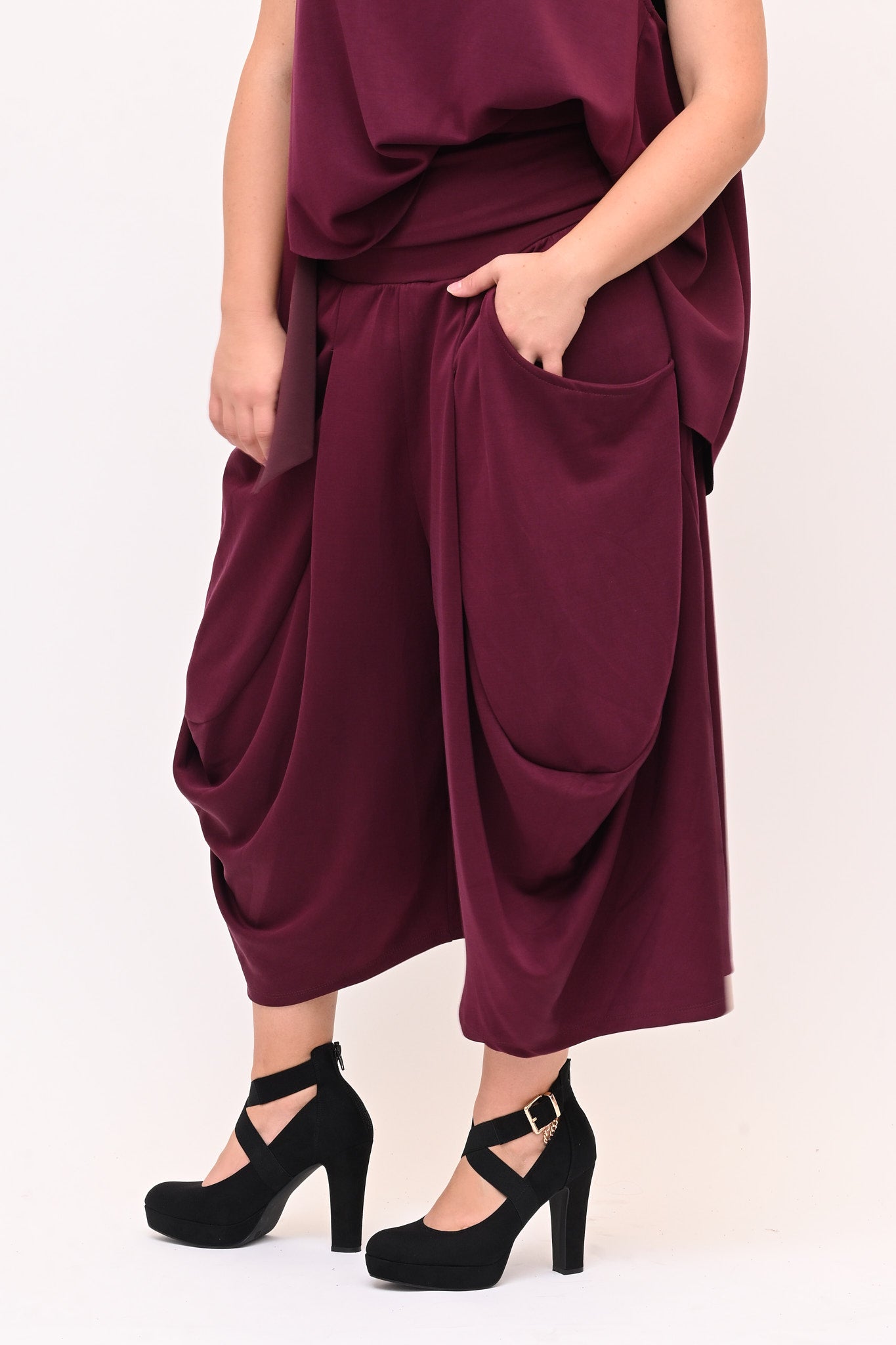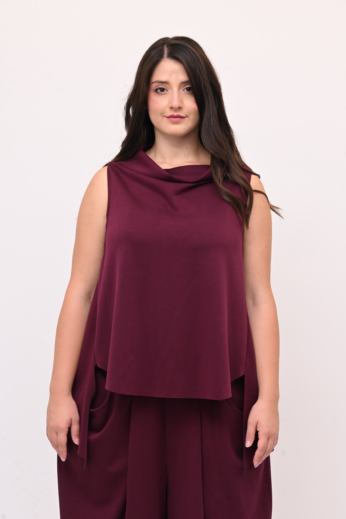 Completo in tessuto scuba, composto da: gilet smanicato con collo a cratere, più corto davanti e con coda dietro e pantalone asimmetrico con lunghezza a gaucho effetto pantagonna. Ideale per un abbigliamento casual, ma con un tocco di raffinatezza e stile.