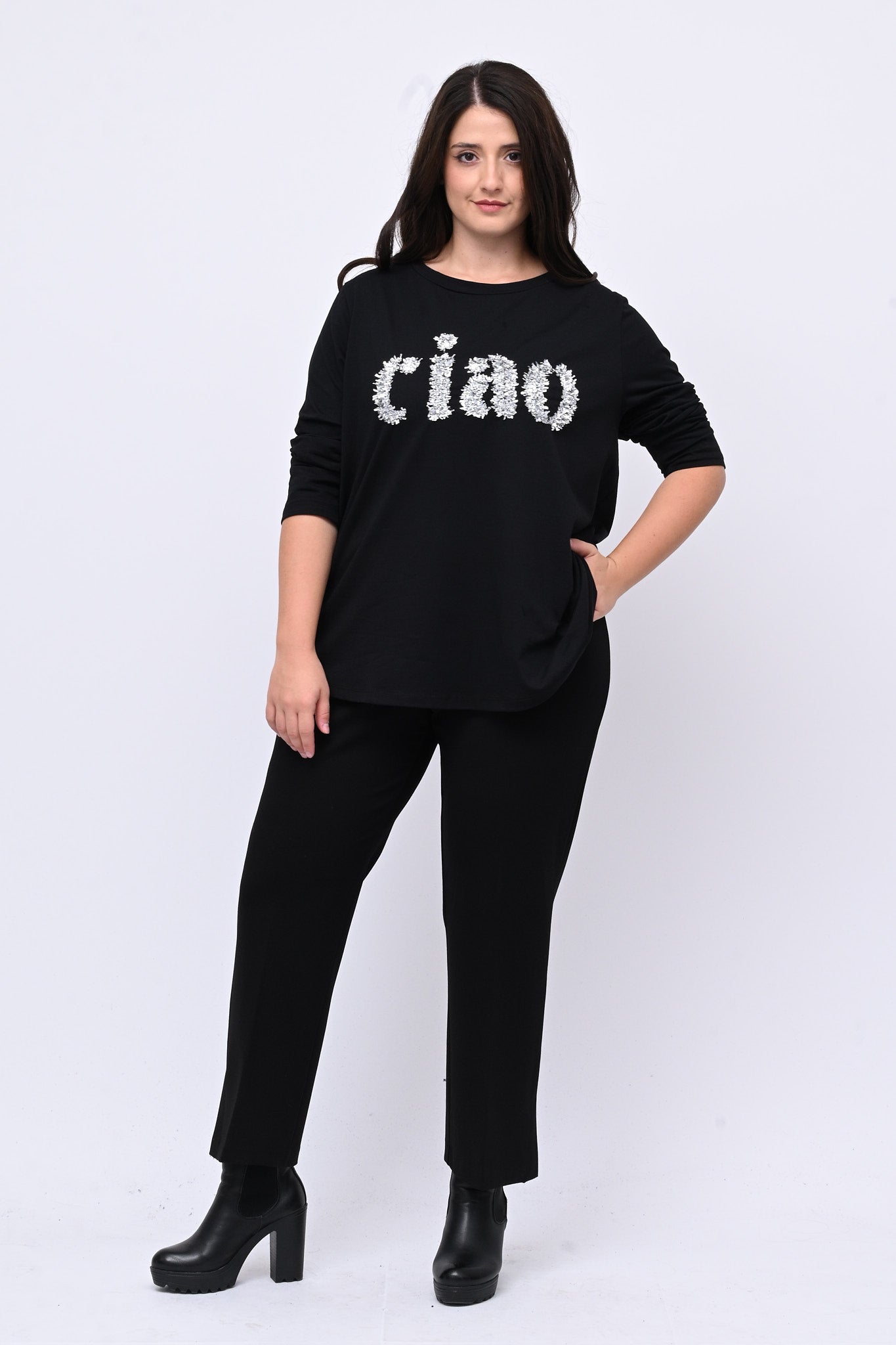 T-shirt in cotone, girocollo, manica lunga. Il ricamo argentato con la scritta "CIAO" dona un tocco sofisticato e distintivo, perfetto per valorizzare il tuo look in modo discreto ma efficace. Un capo versatile che combina qualità dei materiali e design curato nei dettagli.