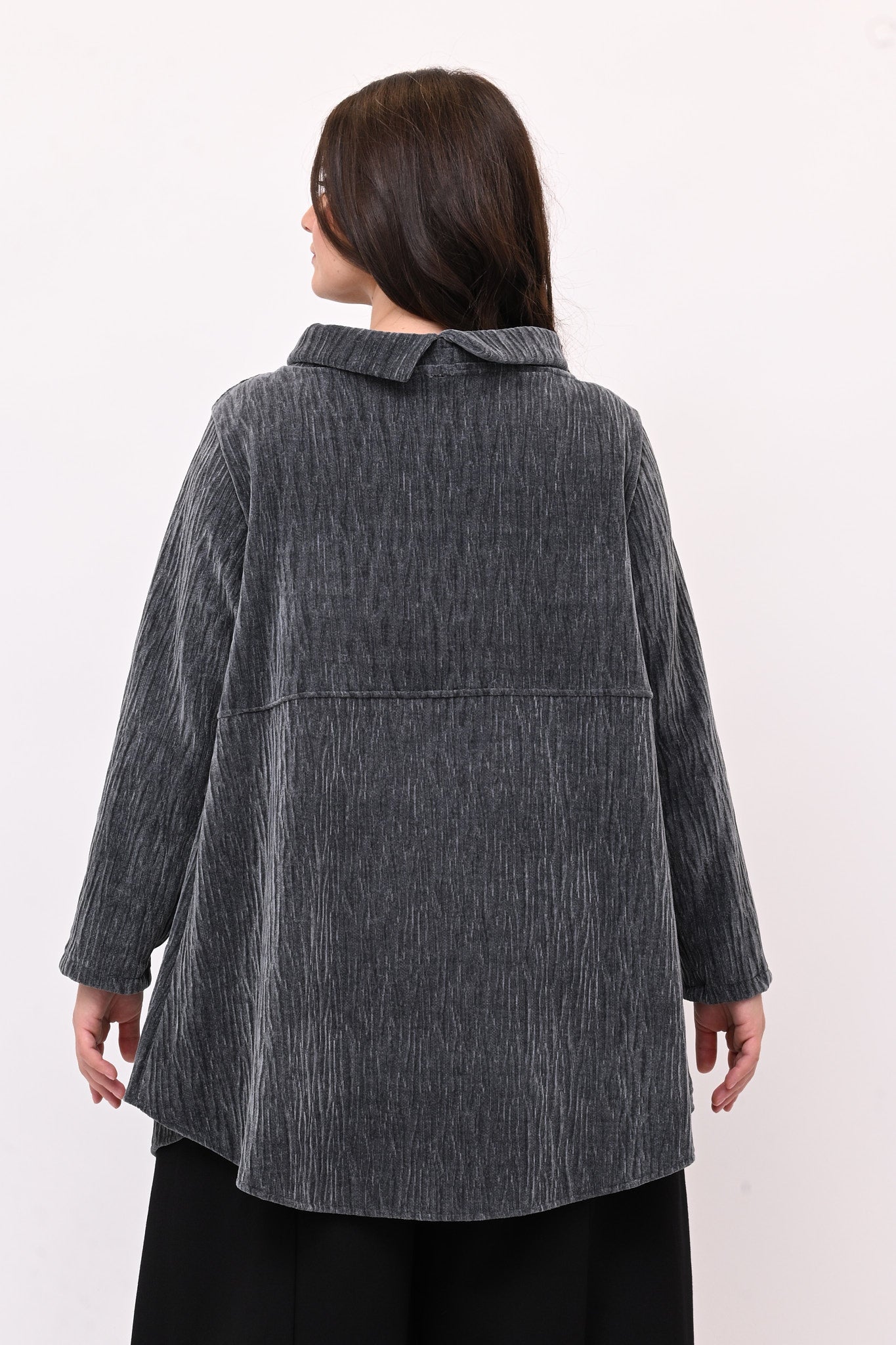 Maglia in ciniglia con collo risvoltato ad anello e manica lunga. Linea svasata ad A, più lunga dietro, che la rende strategica per chi desidera coprire le forme senza nasconderle. Perfetta per chi cerca un capo casual e femminile.