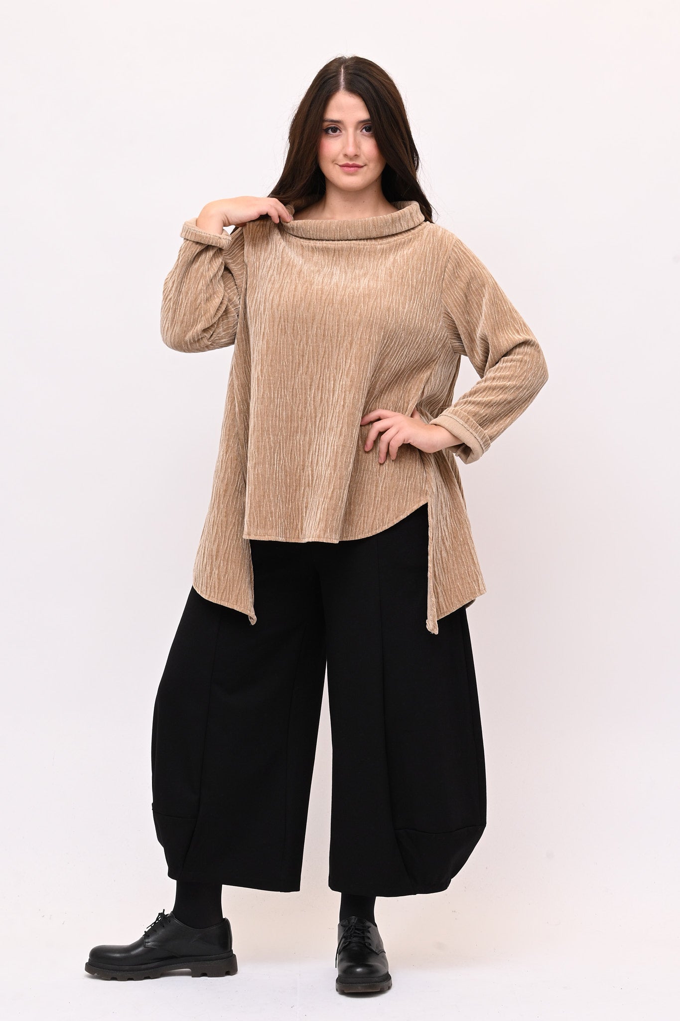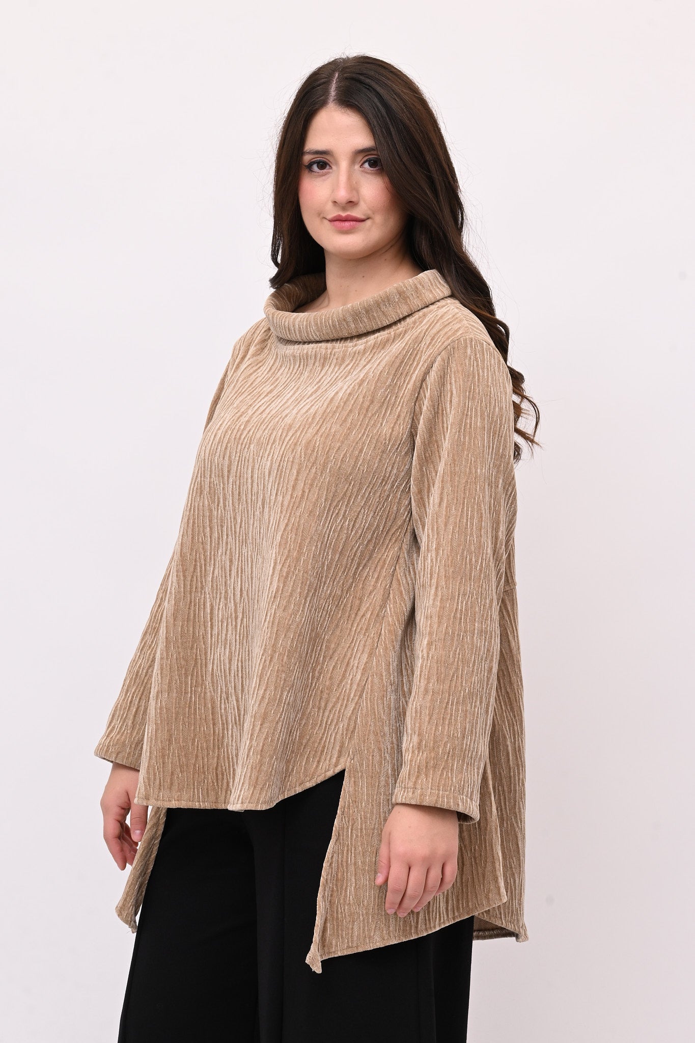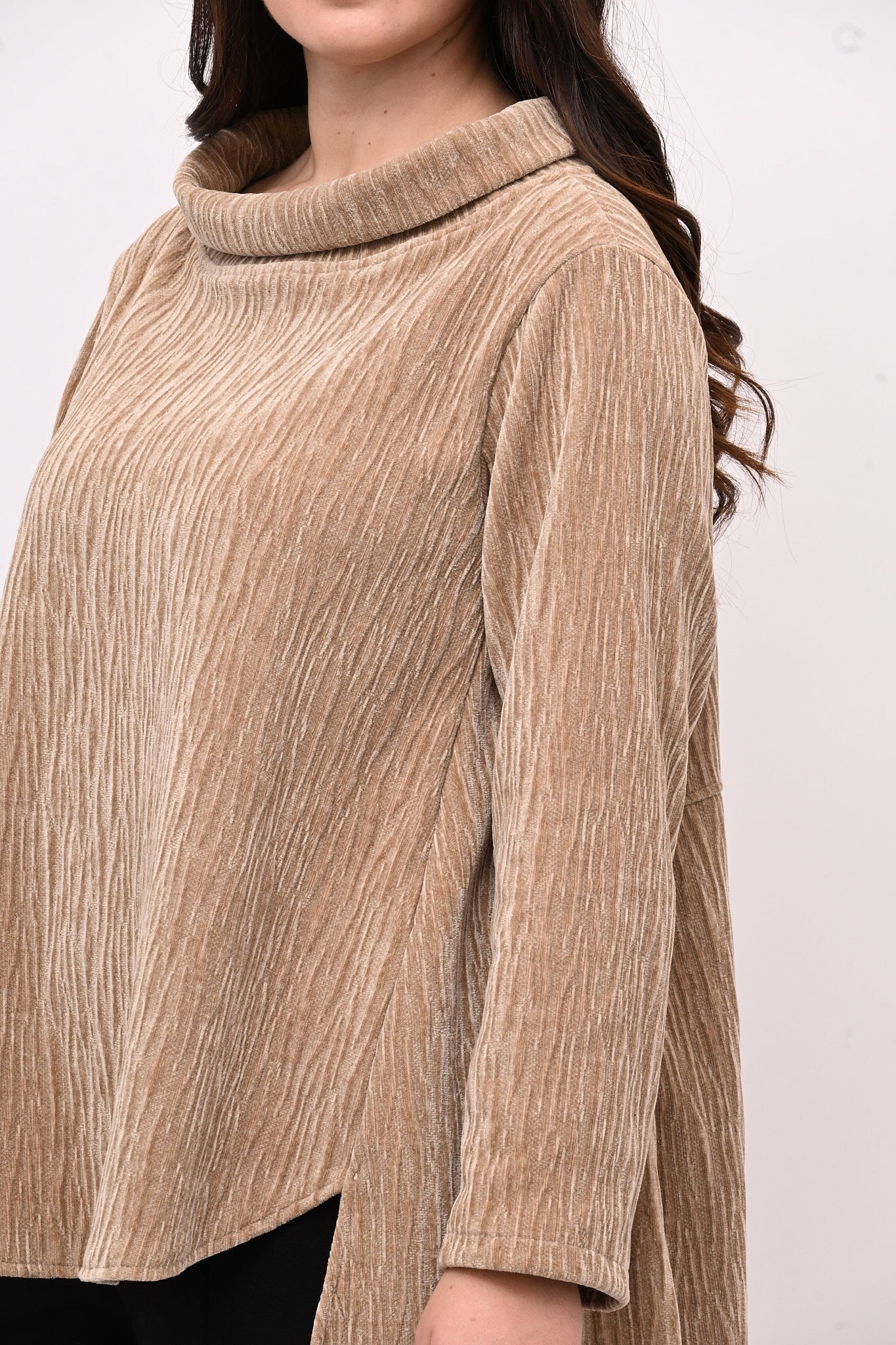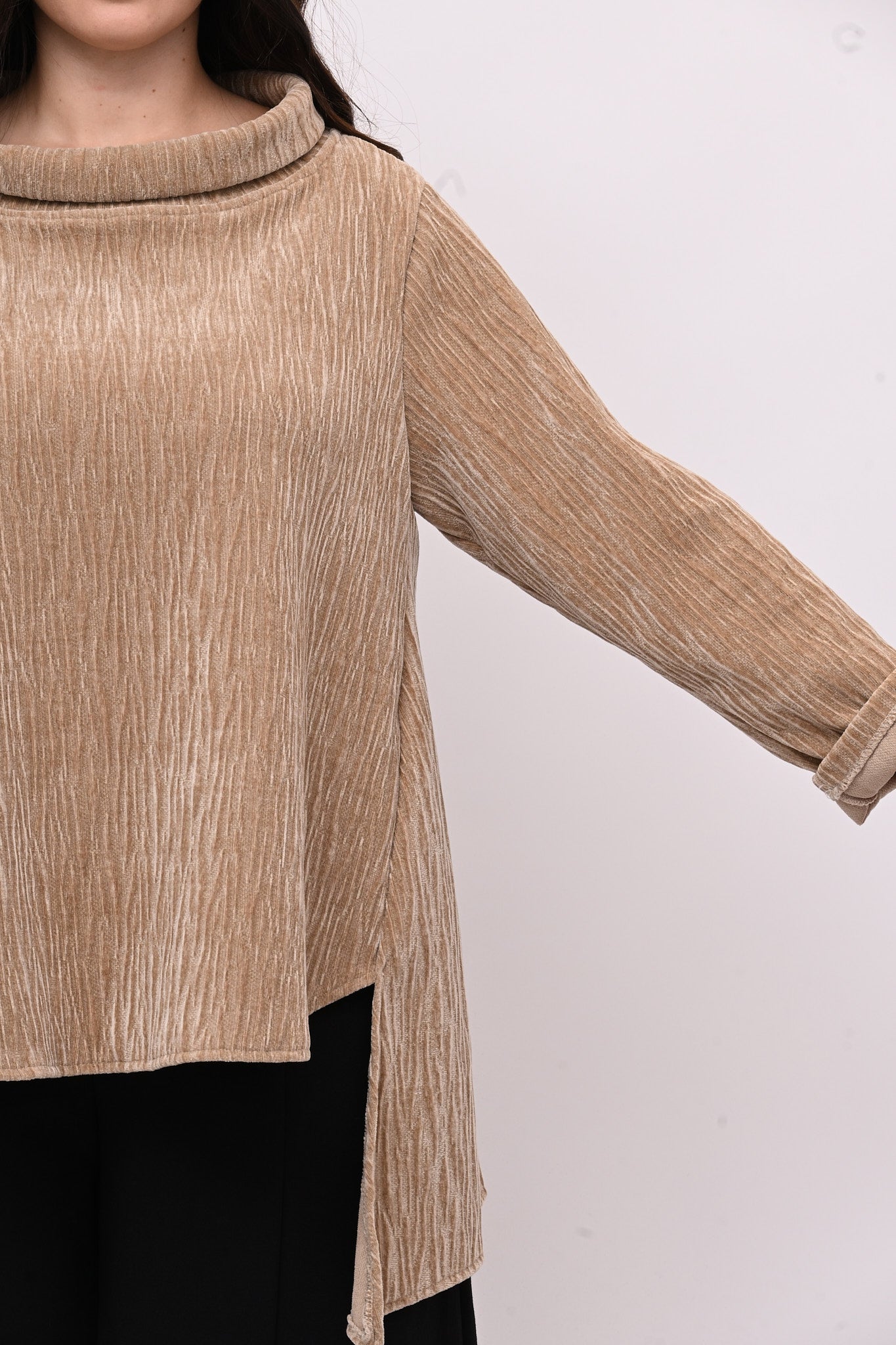 Maglia in ciniglia con collo risvoltato ad anello e manica lunga. Linea svasata ad A, più lunga dietro, che la rende strategica per chi desidera coprire le forme senza nasconderle. Perfetta per chi cerca un capo casual e femminile.
