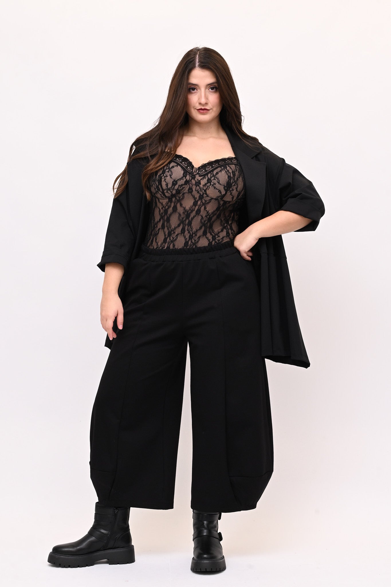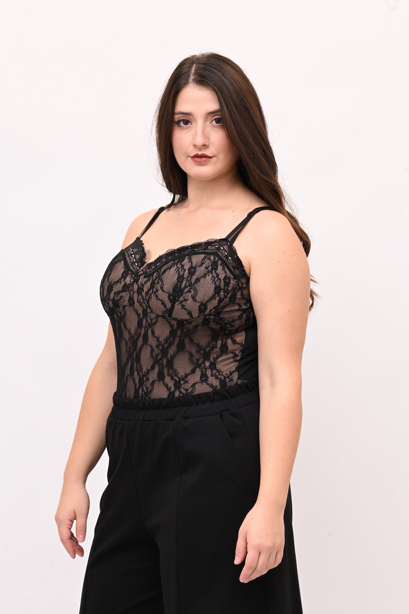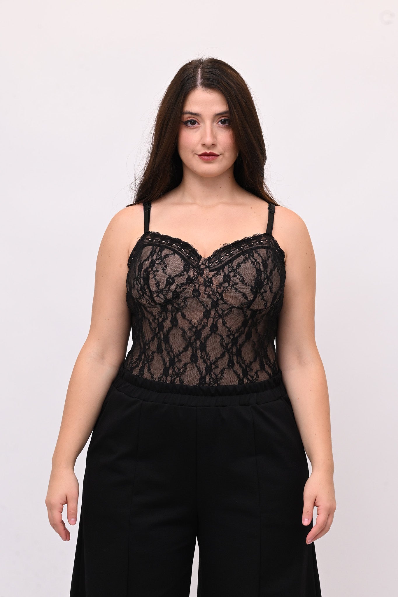 Body in merletto elasticizzato effetto nude, bretelline regolabili e coppe preformate per sostegno un ottimale. Un capo grintoso e sexy, che unisce comfort ed eleganza, facile da indossare, che esalta la femminilità con un tocco sofisticato.
