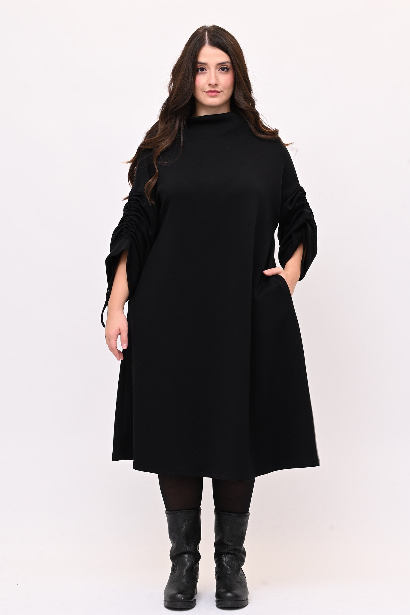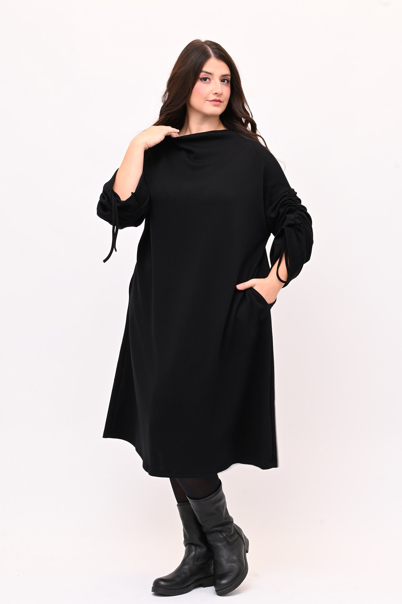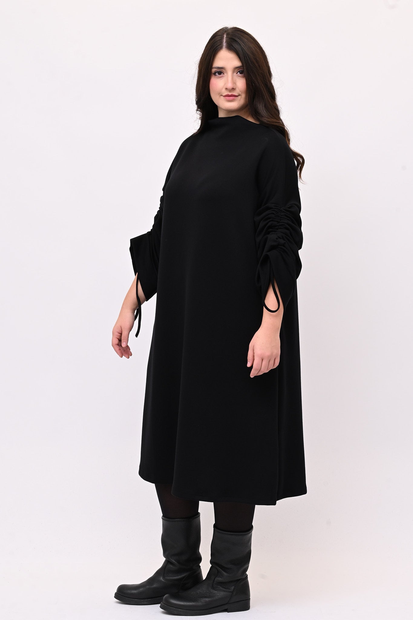 Abito in tessuto scuba con collo a vulcano, modello ad A. I lacci sulle maniche creano un’arricciatura che aggiunge stile. Confortevole e versatile, è perfetto per outfit eleganti e pratici.