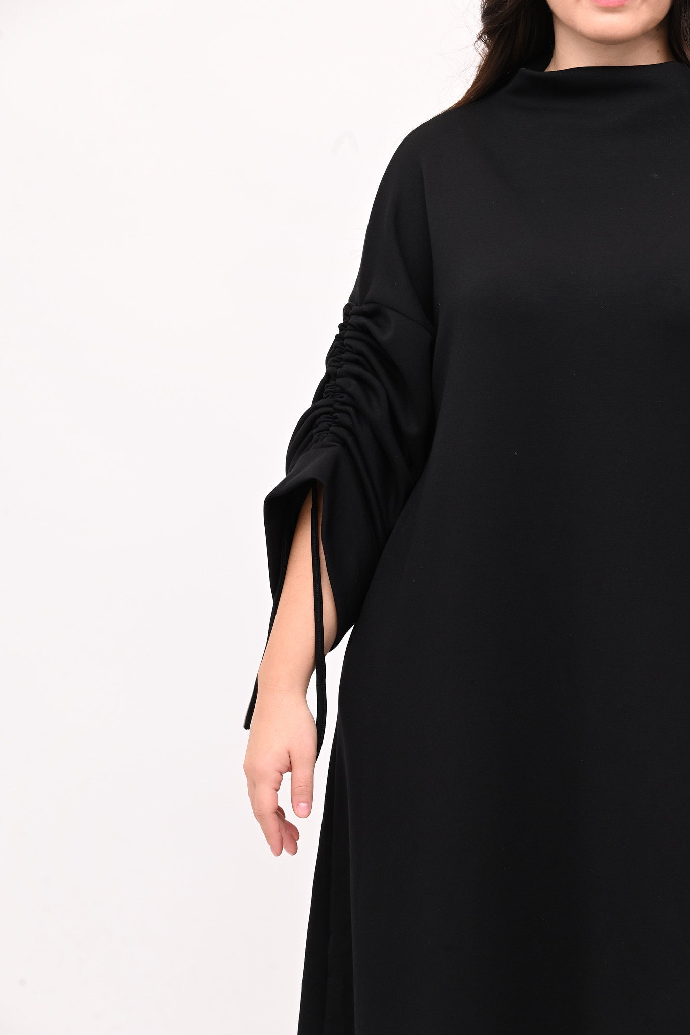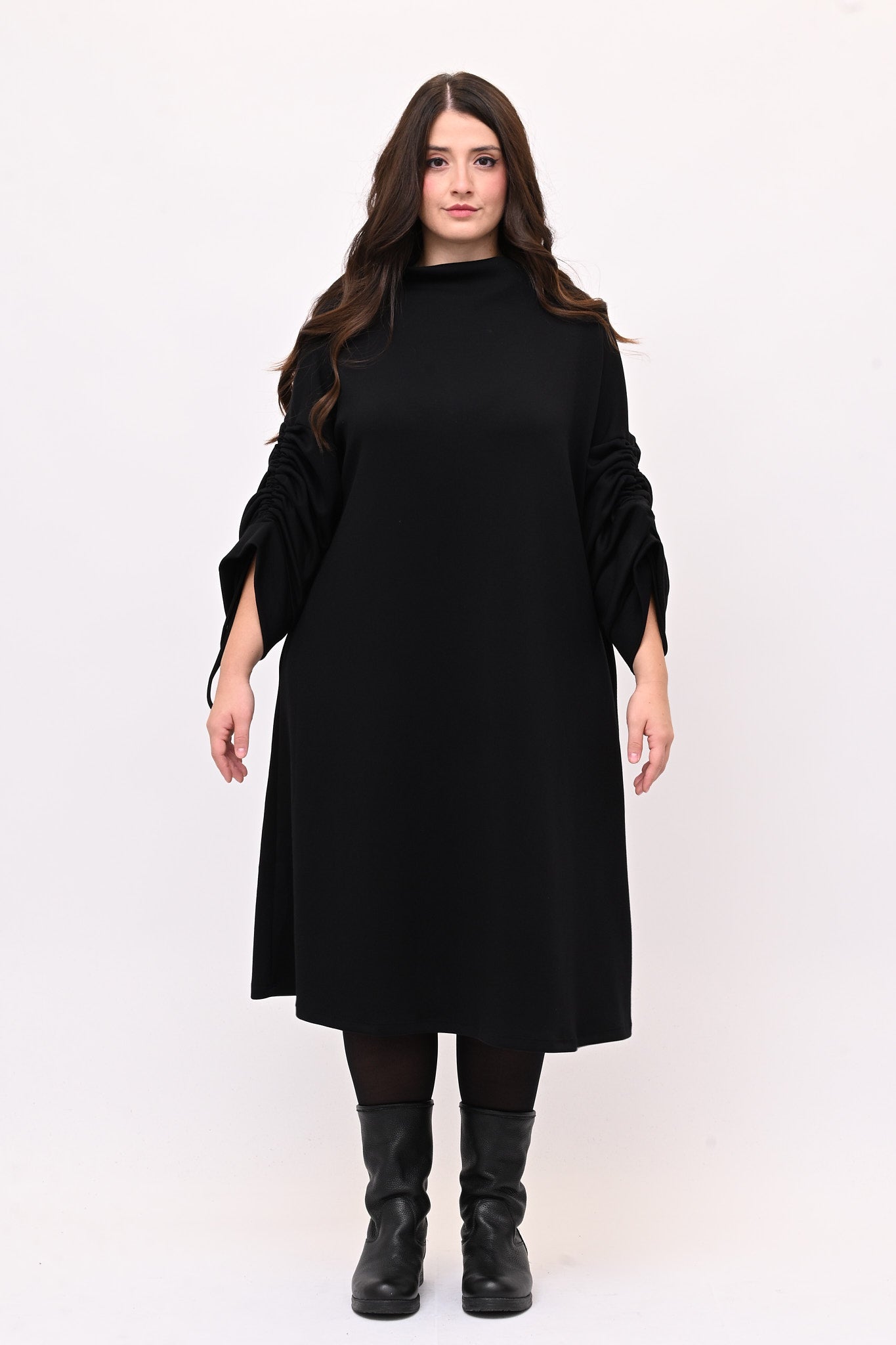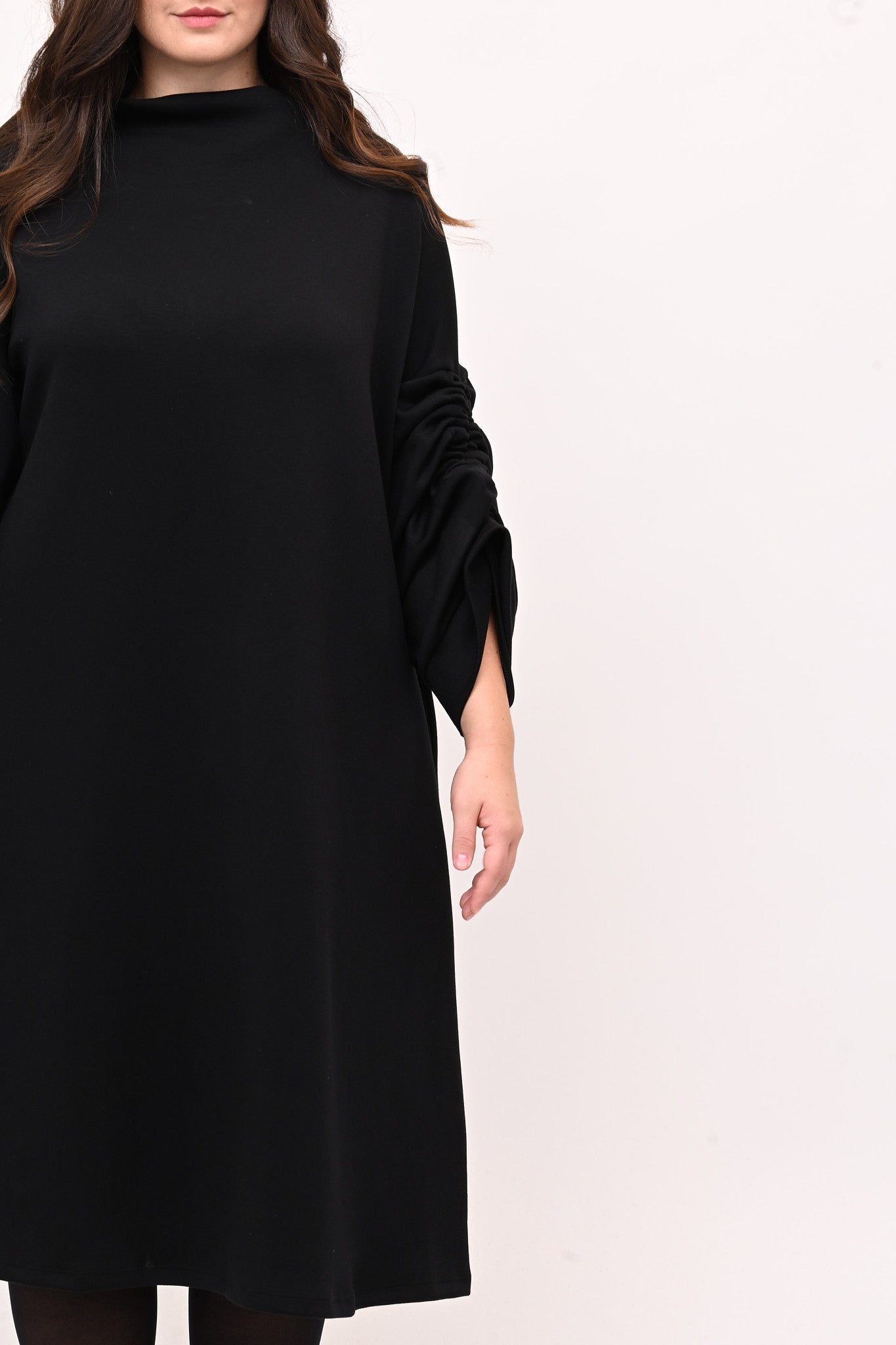 Abito in tessuto scuba con collo a vulcano, modello ad A. I lacci sulle maniche creano un’arricciatura che aggiunge stile. Confortevole e versatile, è perfetto per outfit eleganti e pratici.