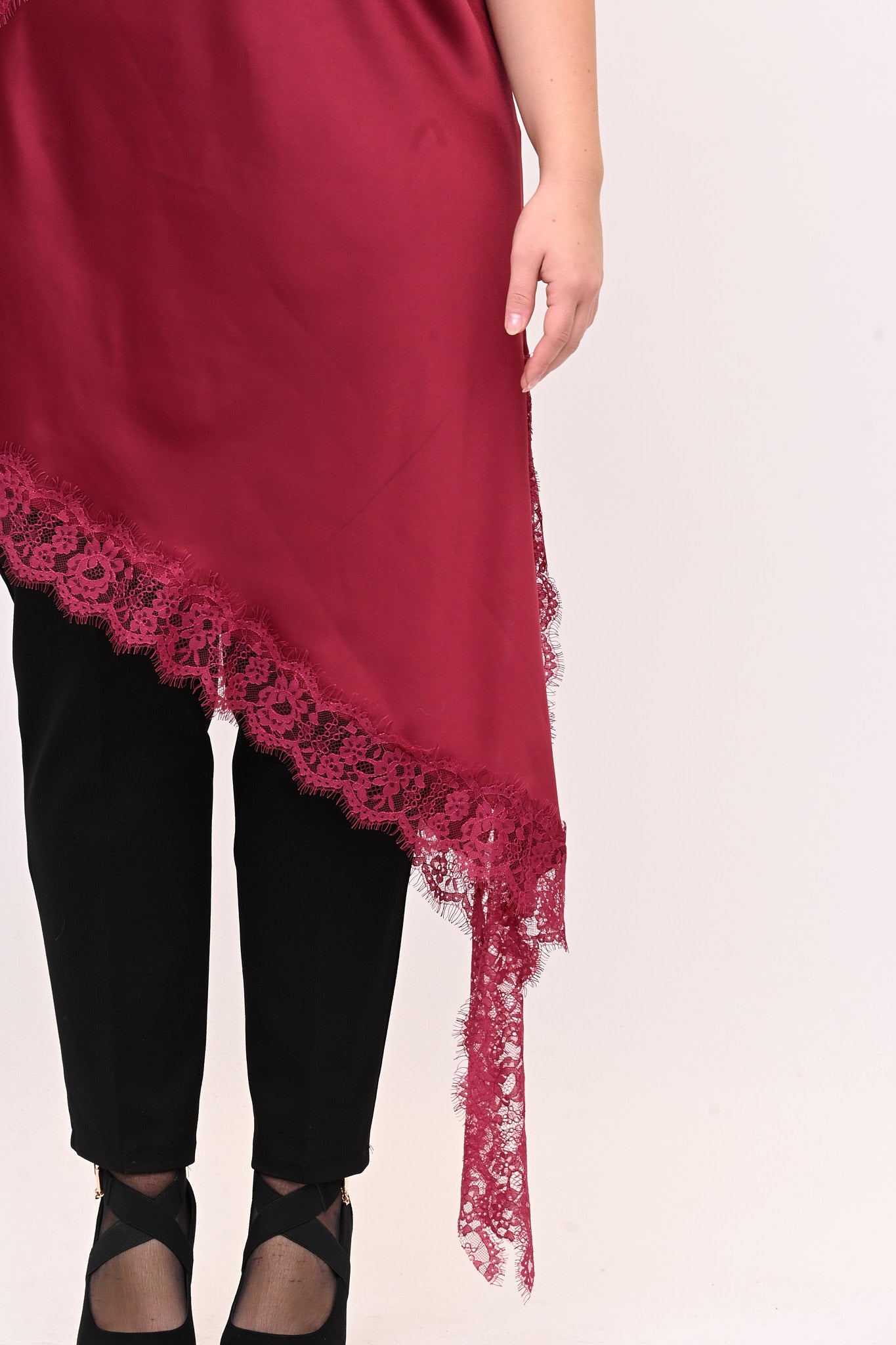 Top lungo in raso, con bretelle sottili e dettagli in pizzo sul decoltè e sull'orlo inferiore. Il design asimmetrico presenta una lunga punta laterale con spacco che da movimento e sensualità. Sexy indossato da solo per look audaci, può diventare una base versatile per outfit raffinati. Un capo che unisce eleganza femminile e carattere deciso.