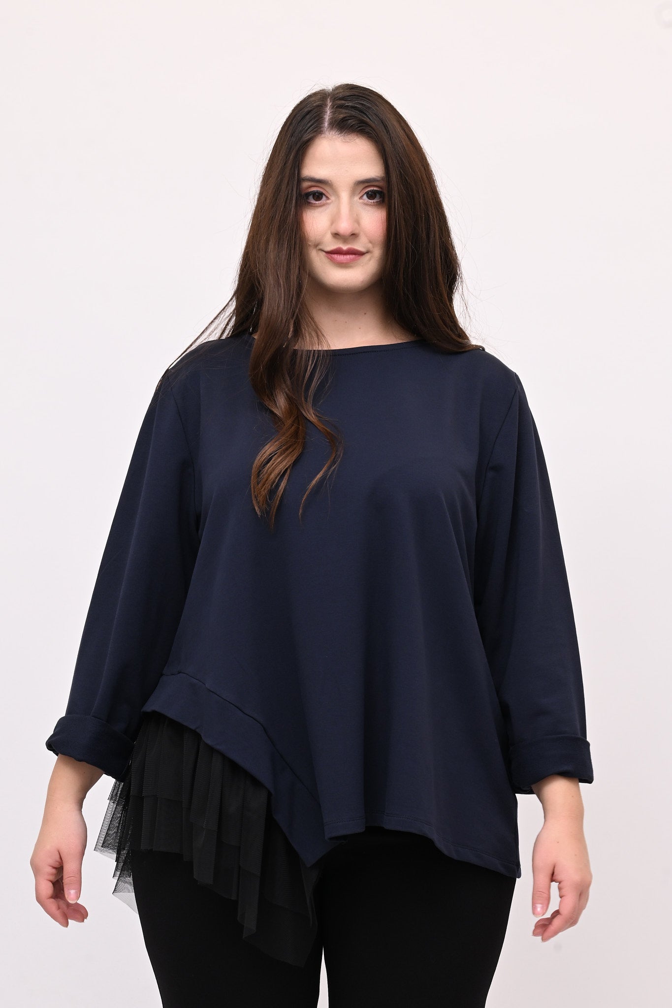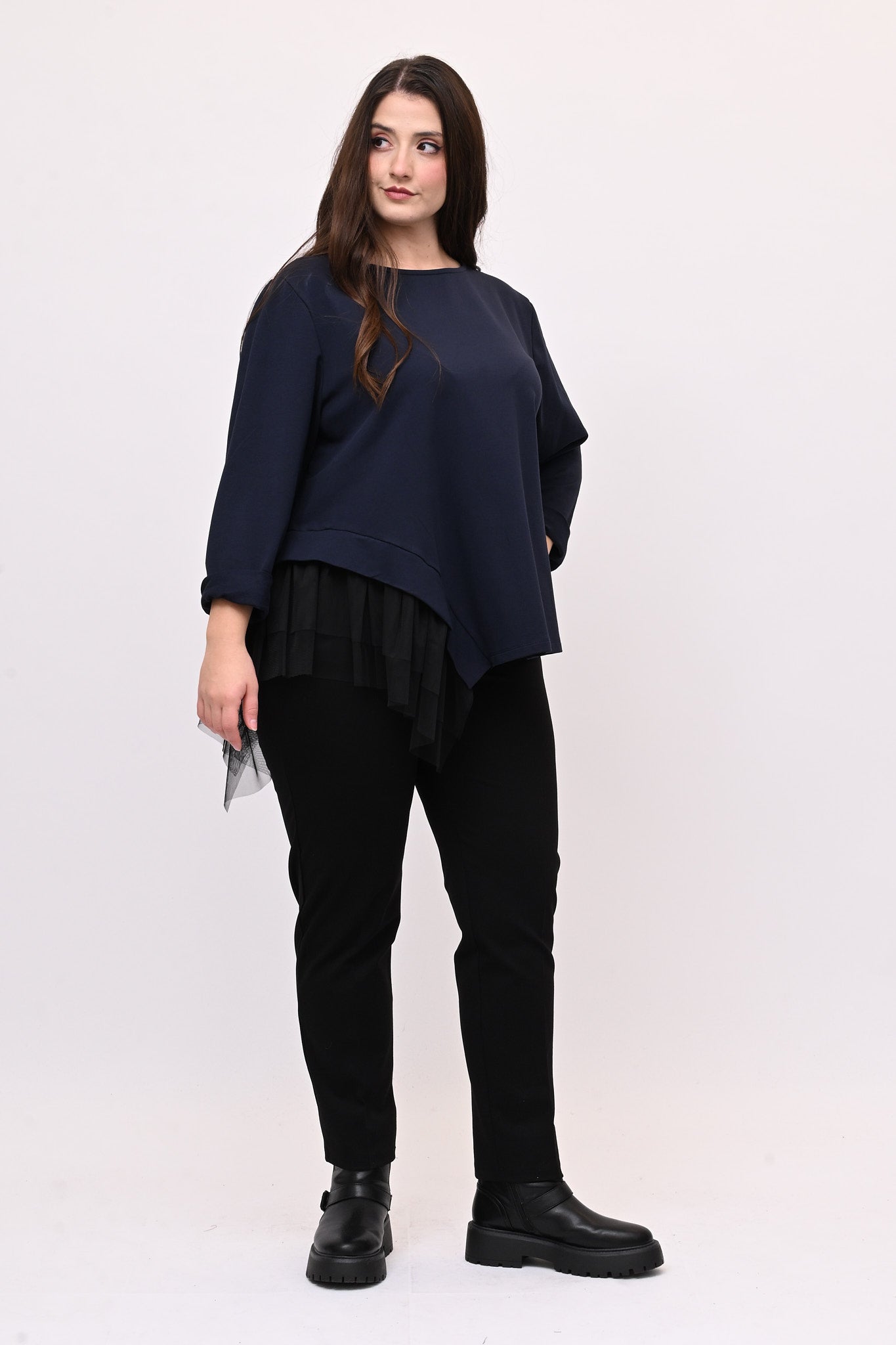 Felpa in cotone, girocollo e maniche lunghe, impreziosita da un originale inserto laterale in tulle a balza, che aggiunge movimento e femminilità. Un capo che unisce comfort e personalità, perfetto per chi desidera un look casual ma ricercato.