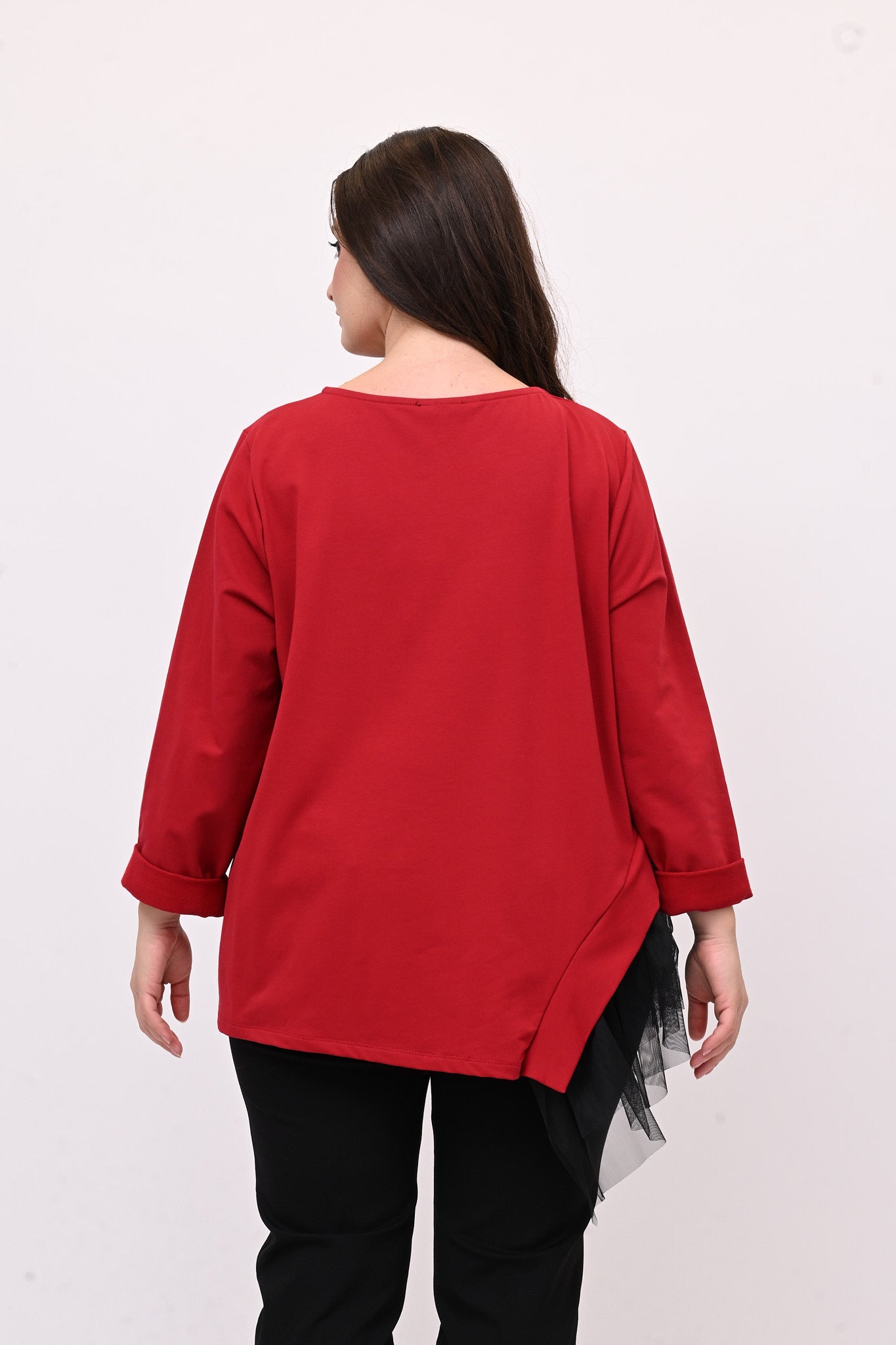Felpa in cotone, girocollo e maniche lunghe, impreziosita da un originale inserto laterale in tulle a balza, che aggiunge movimento e femminilità. Un capo che unisce comfort e personalità, perfetto per chi desidera un look casual ma ricercato.