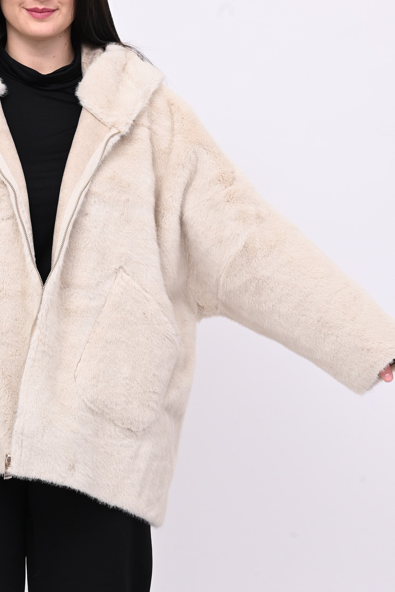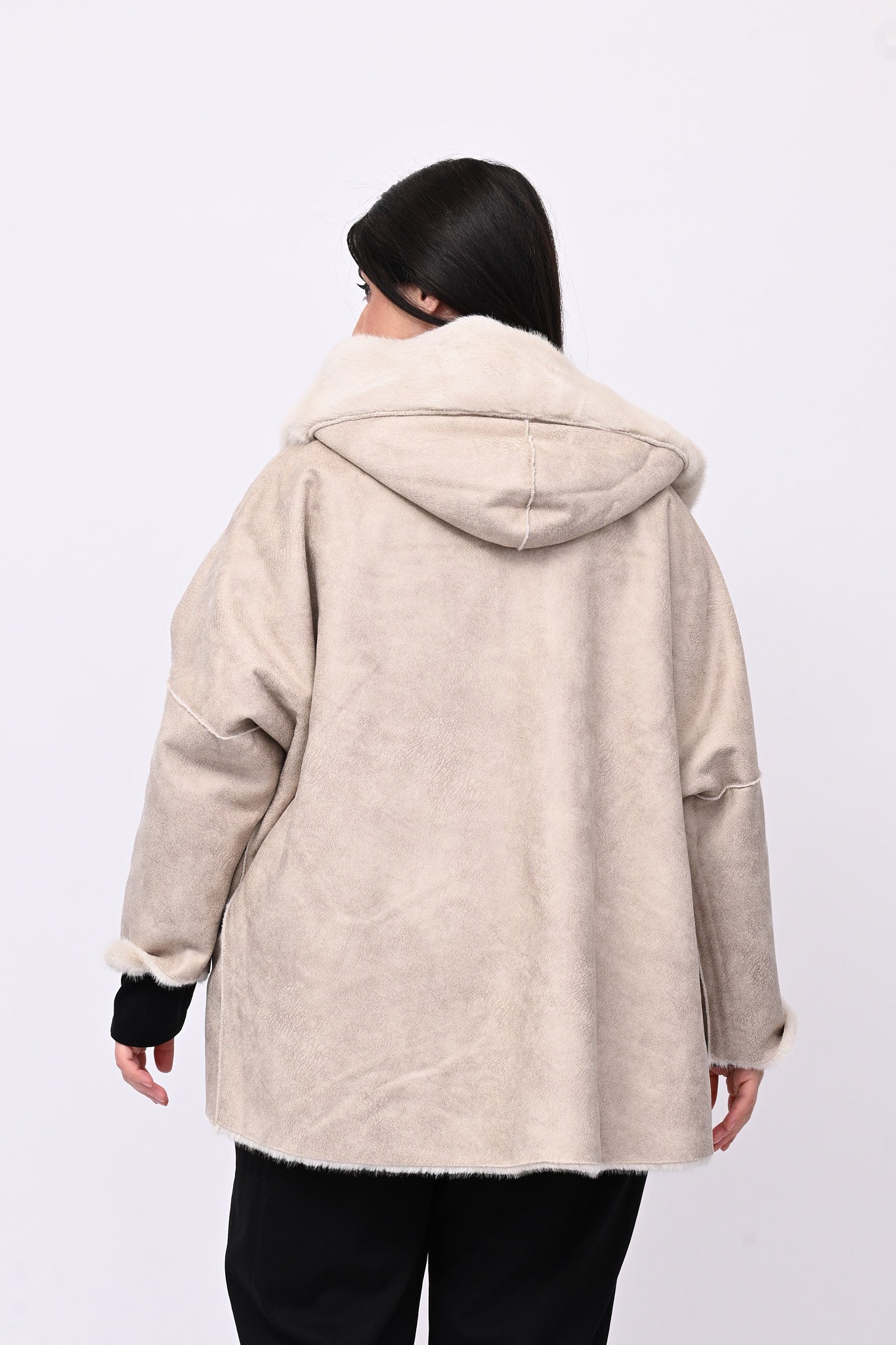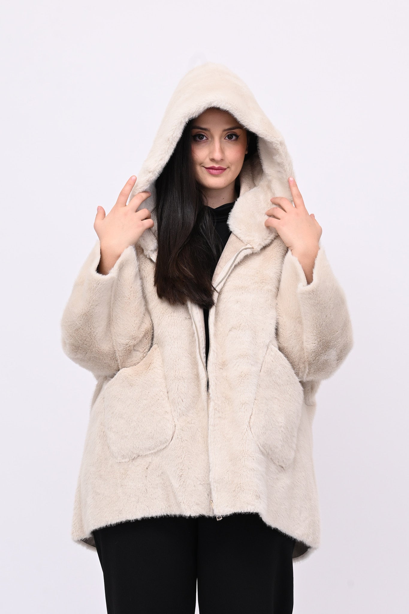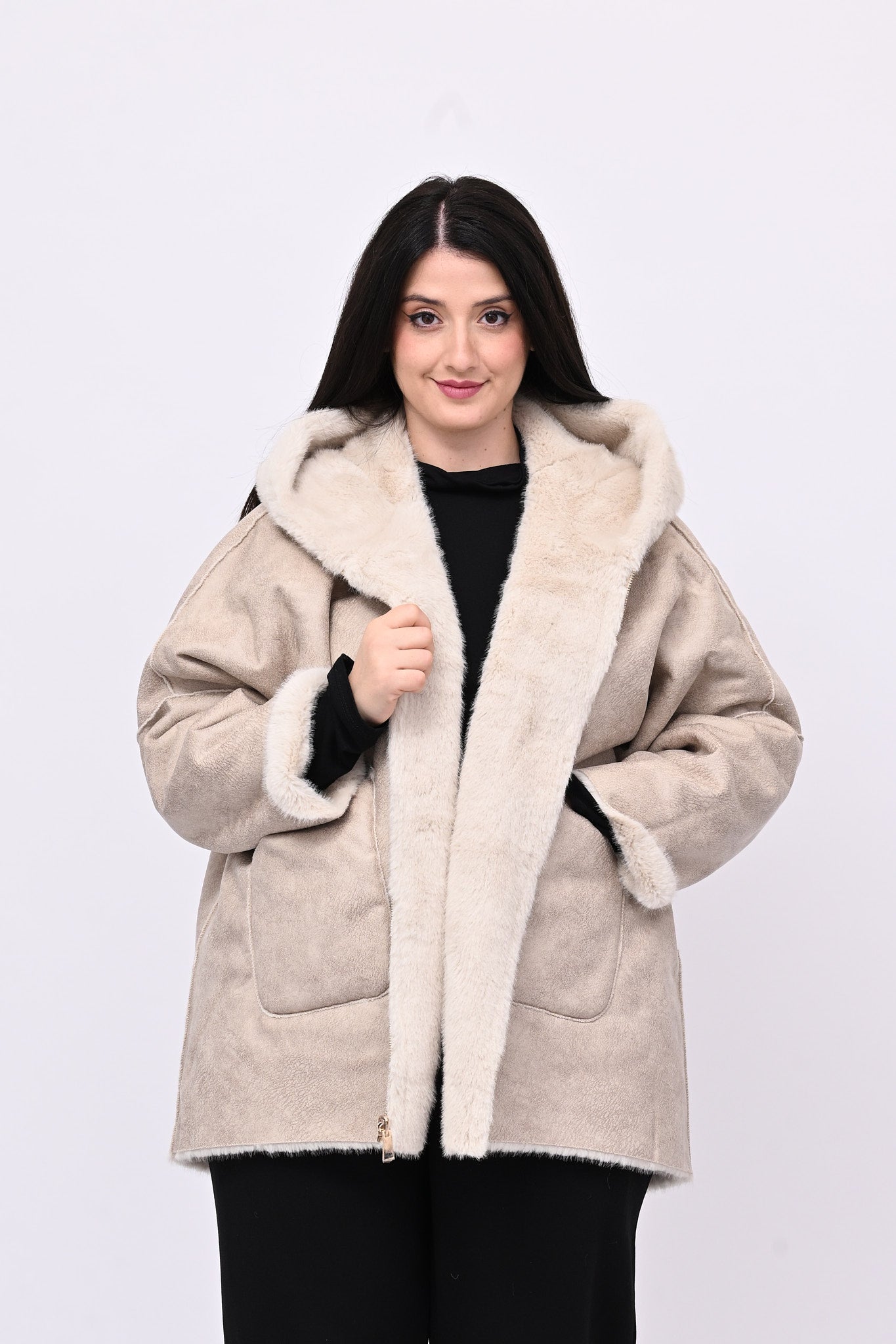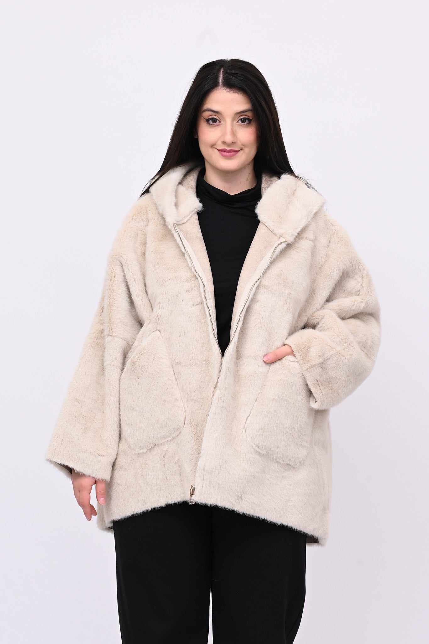 Eco pelliccia double face con cappuccio integrato, tasche a toppa e chiusura con zip.  Rigirando il capo si trasforma in eco montone.  Calda, femminile e versatile combina eleganza e praticità ed è perfetta per ogni occasione.