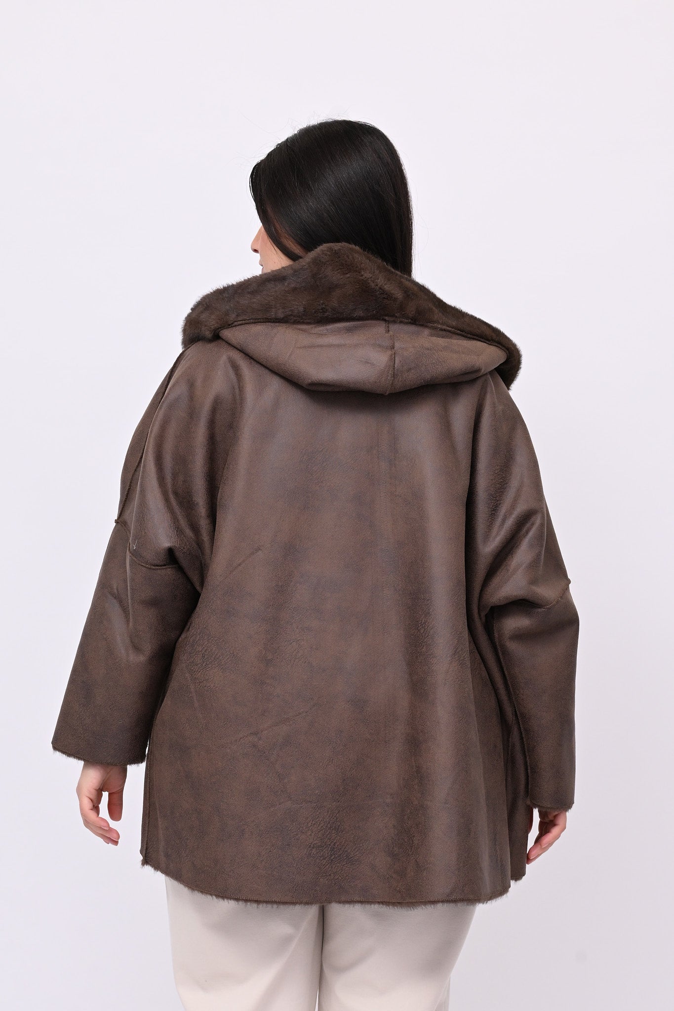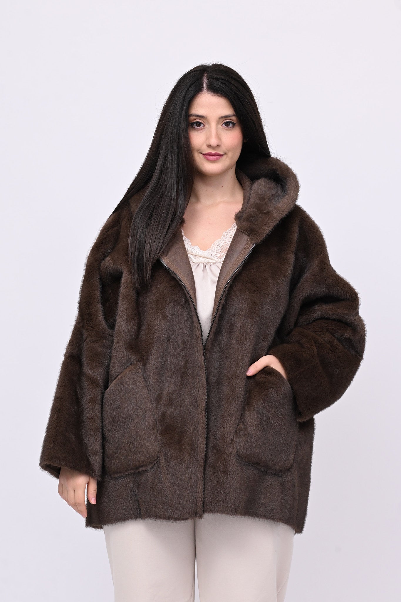 Eco pelliccia double face con cappuccio integrato, tasche a toppa e chiusura con zip.  Rigirando il capo si trasforma in eco montone.  Calda, femminile e versatile combina eleganza e praticità ed è perfetta per ogni occasione.