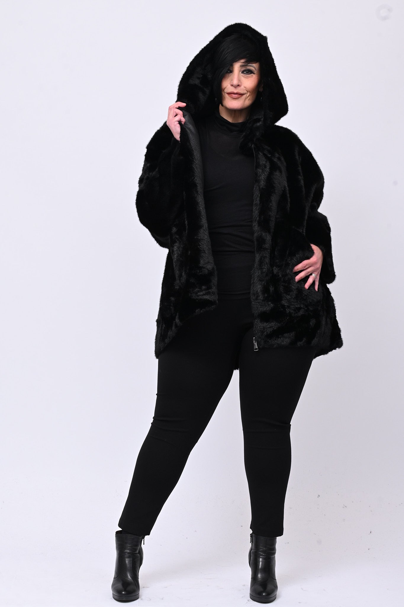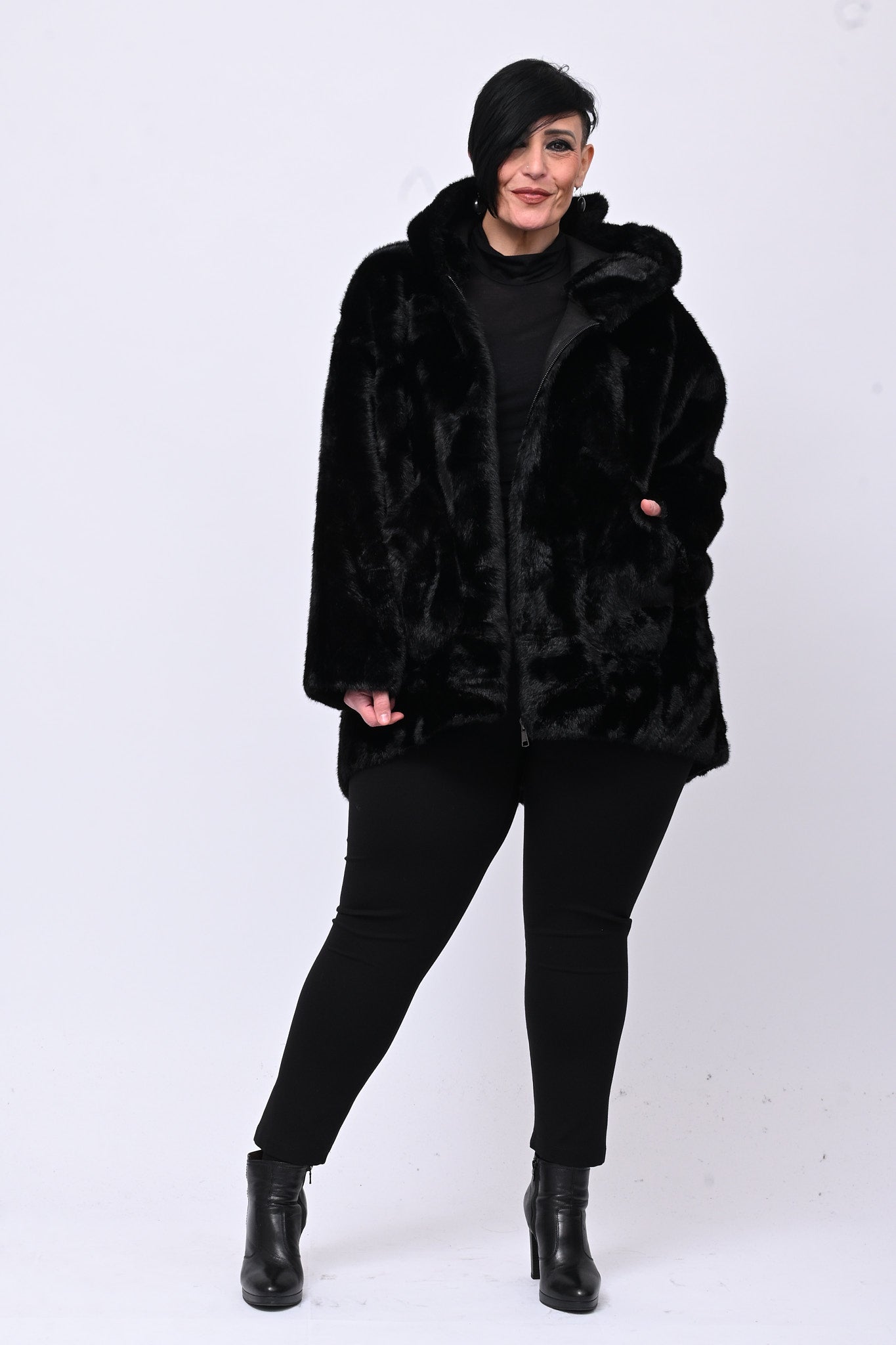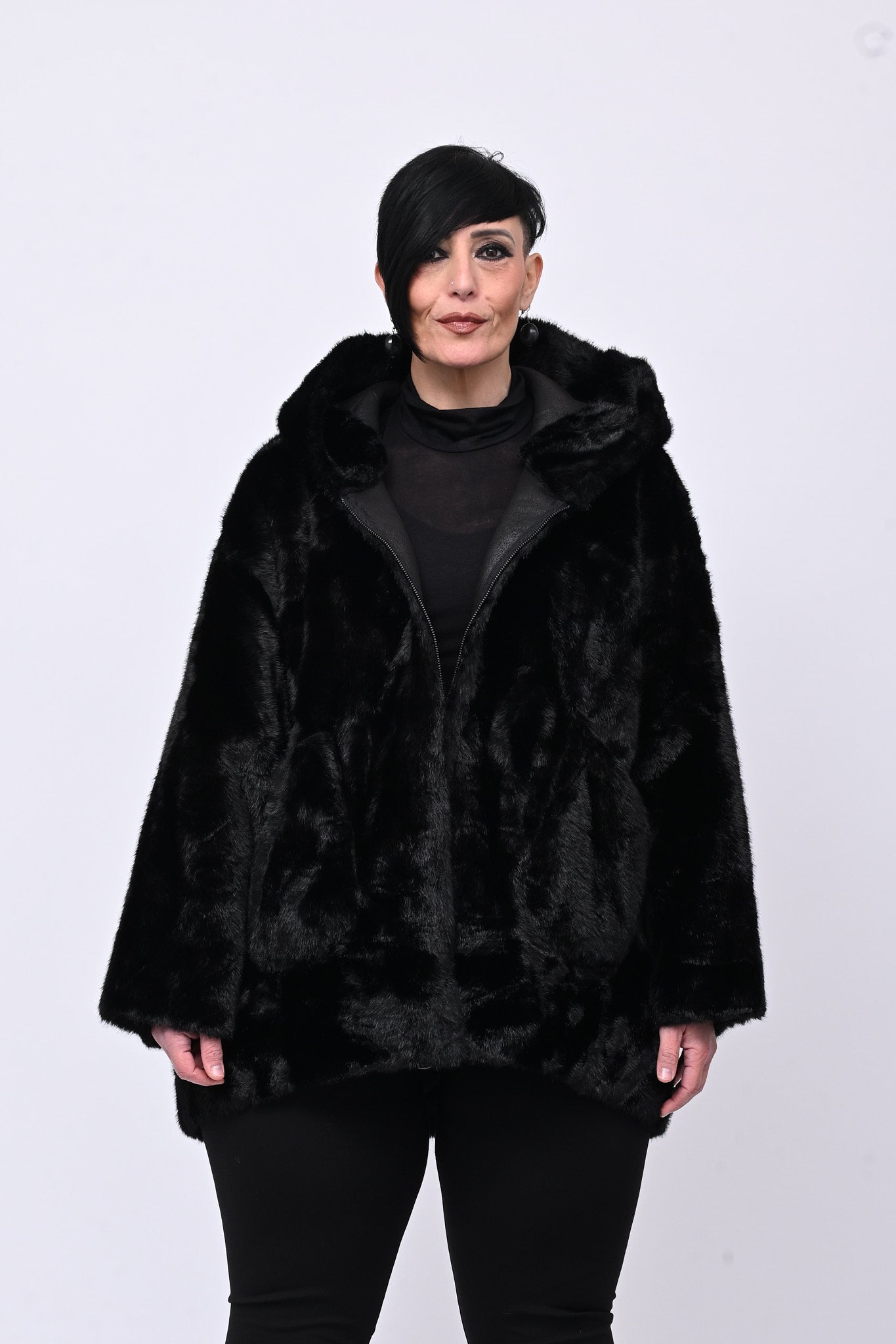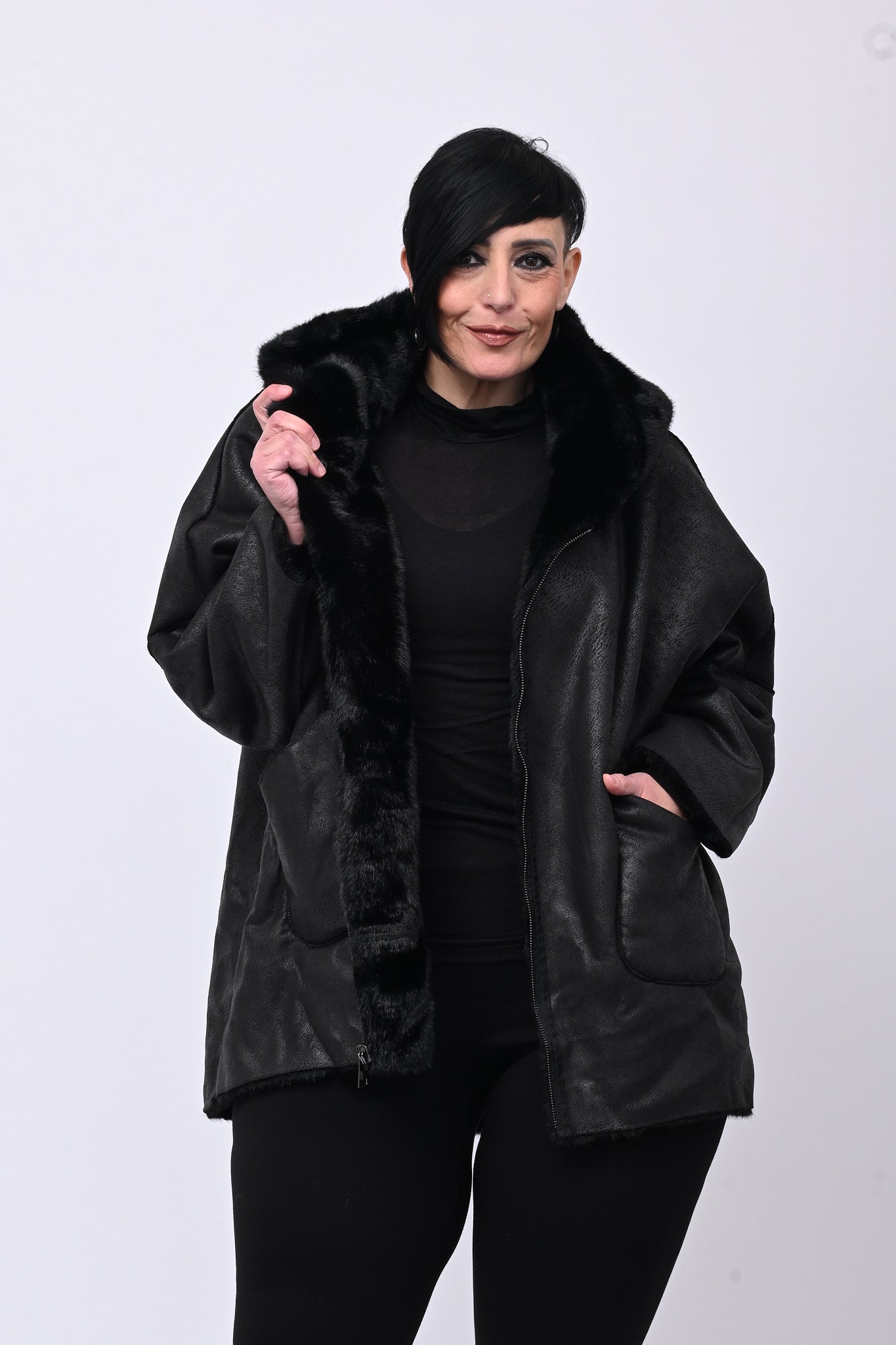 Eco pelliccia double face con cappuccio integrato, tasche a toppa e chiusura con zip.  Rigirando il capo si trasforma in eco montone.  Calda, femminile e versatile combina eleganza e praticità ed è perfetta per ogni occasione.