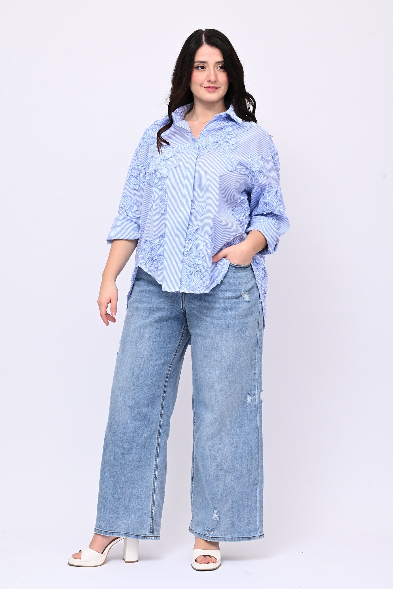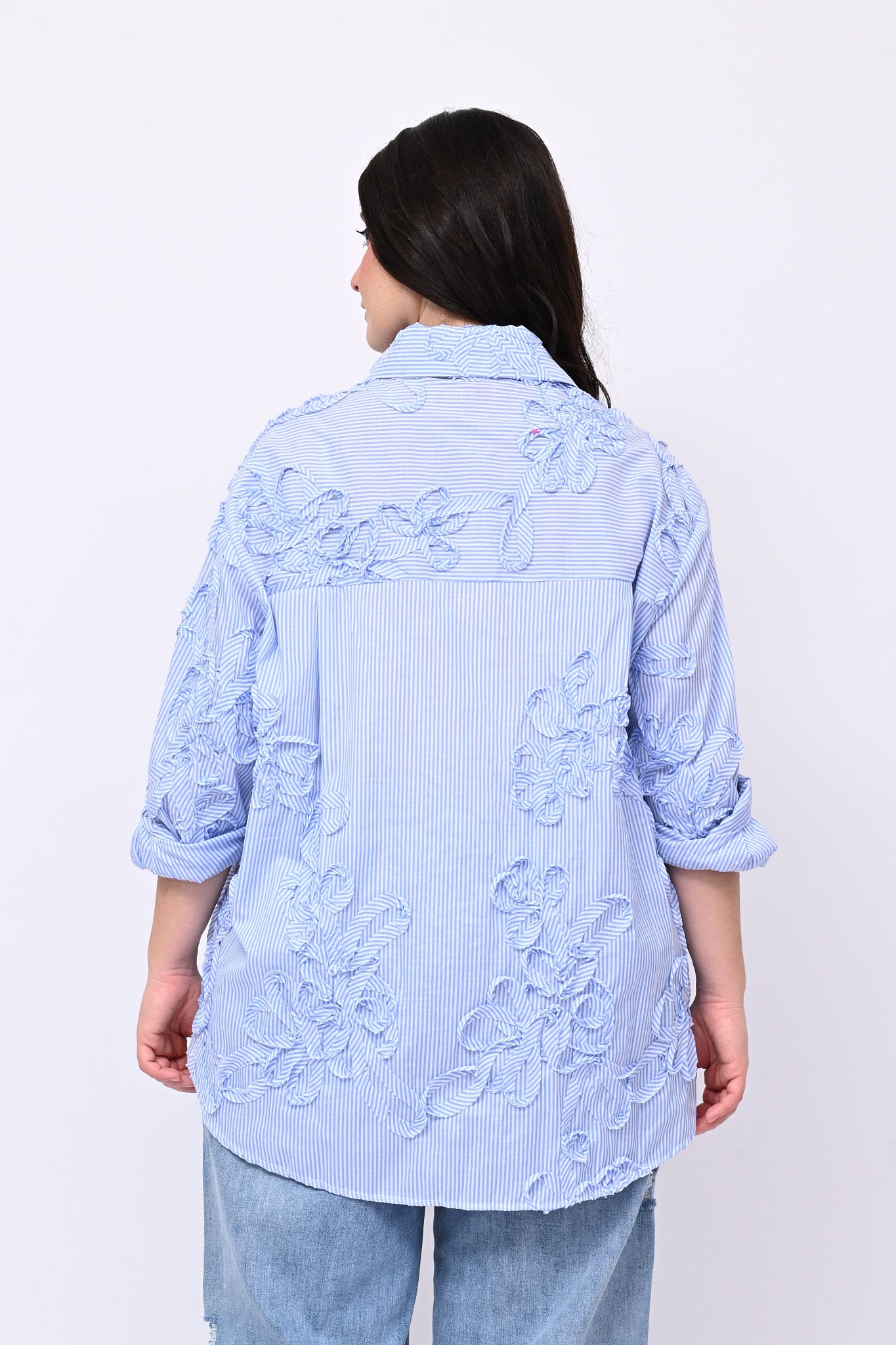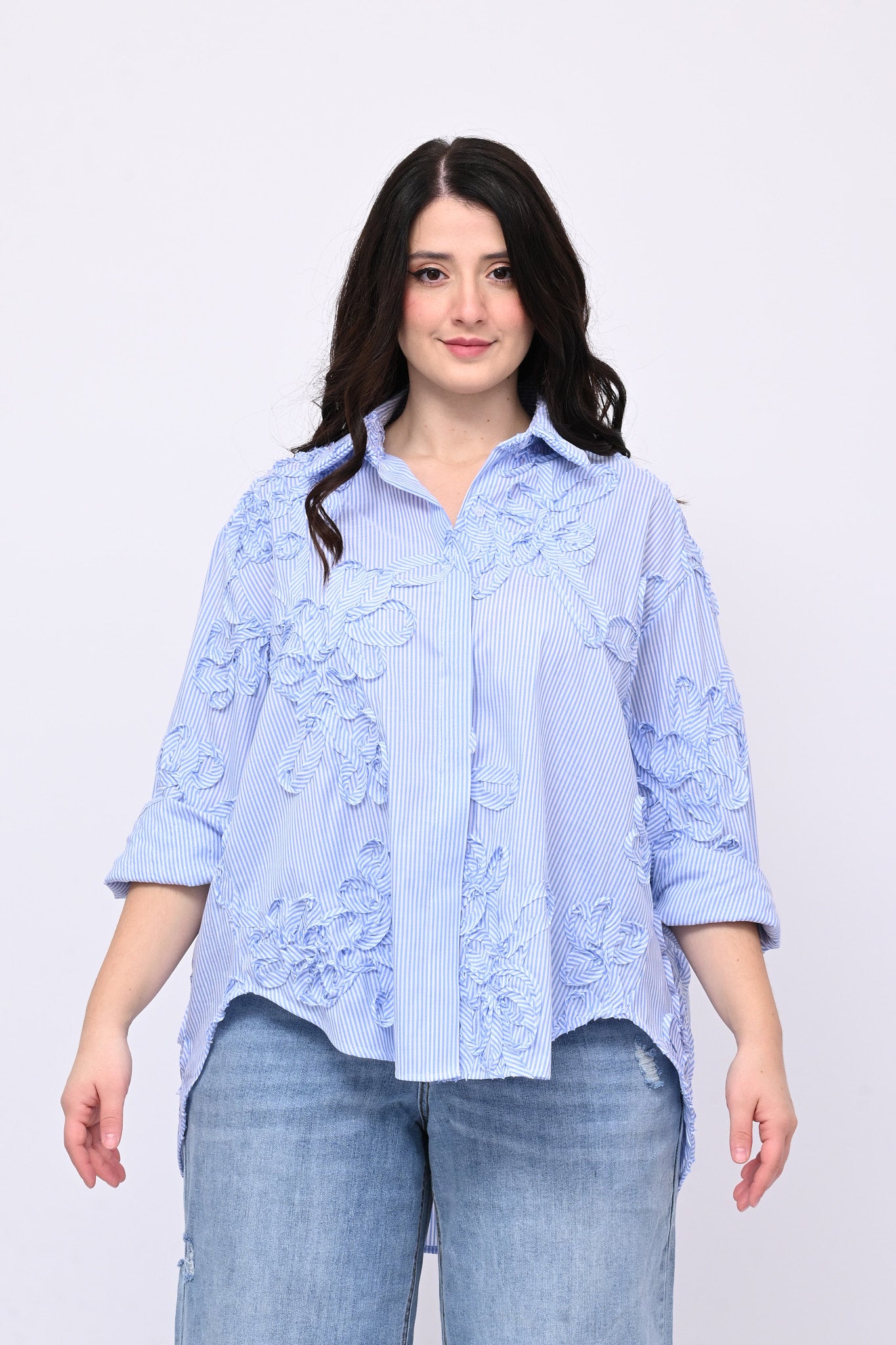 Camicia modello a scatoletta, maniche lunghe e fondo stondato più lungo dietro. La fantasia bacchettata è impreziosita da ricami applicati realizzati con lo stesso tessuto, un dettaglio che conferisce originalità e raffinatezza. Perfetta per chi ricerca capi che uniscono comfort, femminilità e stile.