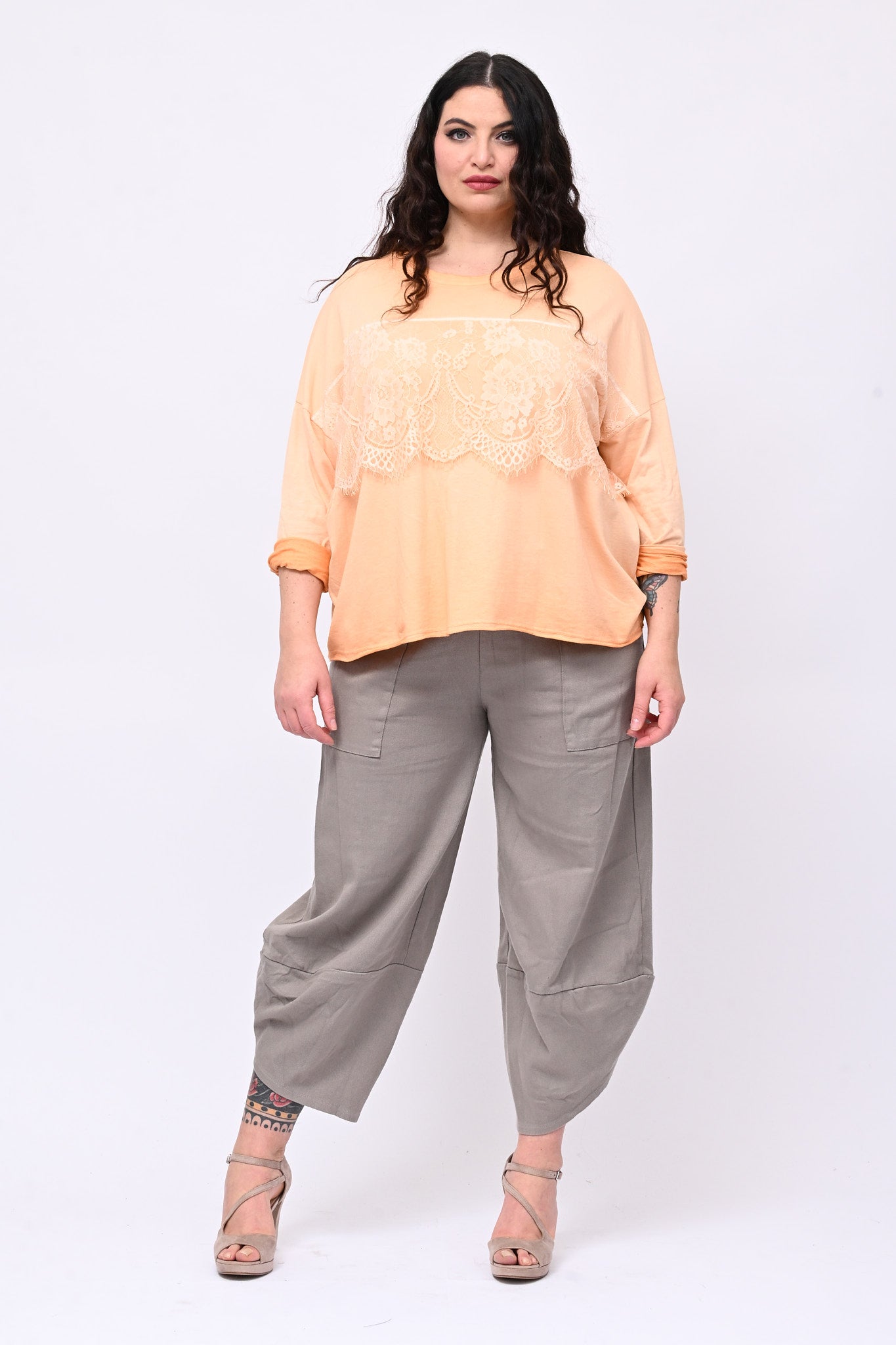 Felpa in garza di cotone, girocollo, manica lunga, con silhouette a scatoletta che valorizza la figura. L'inserto di merletto applicato sul davanti, tono su tono, aggiunge un tocco di femminilità e ricercatezza. Versatile e comoda, è perfetta per ogni occasione, dal casual al più elegante.