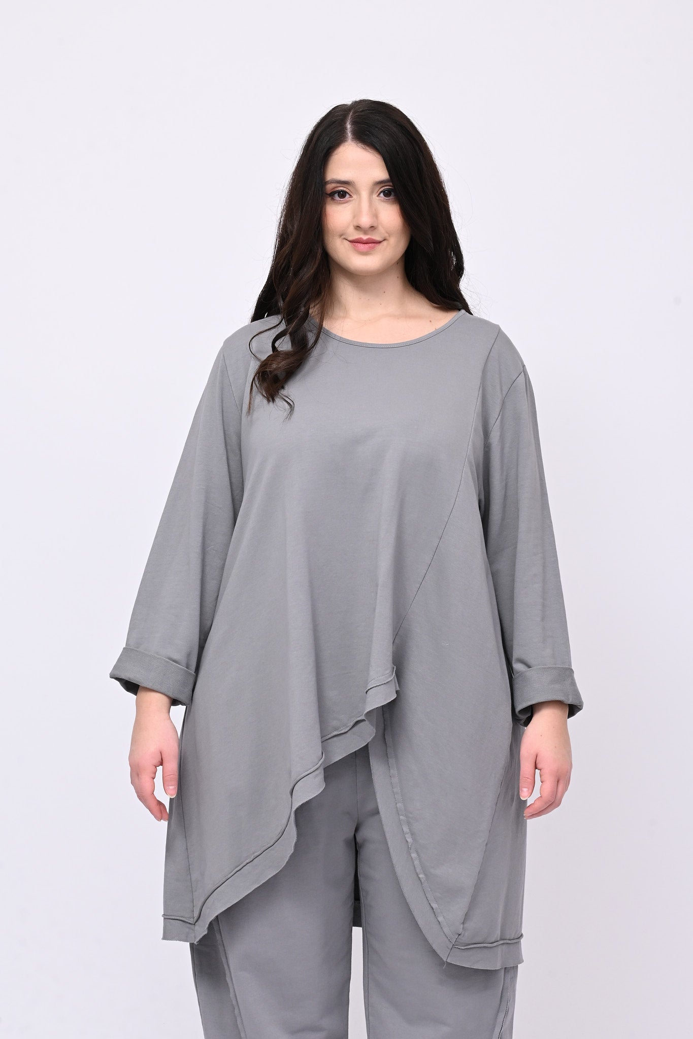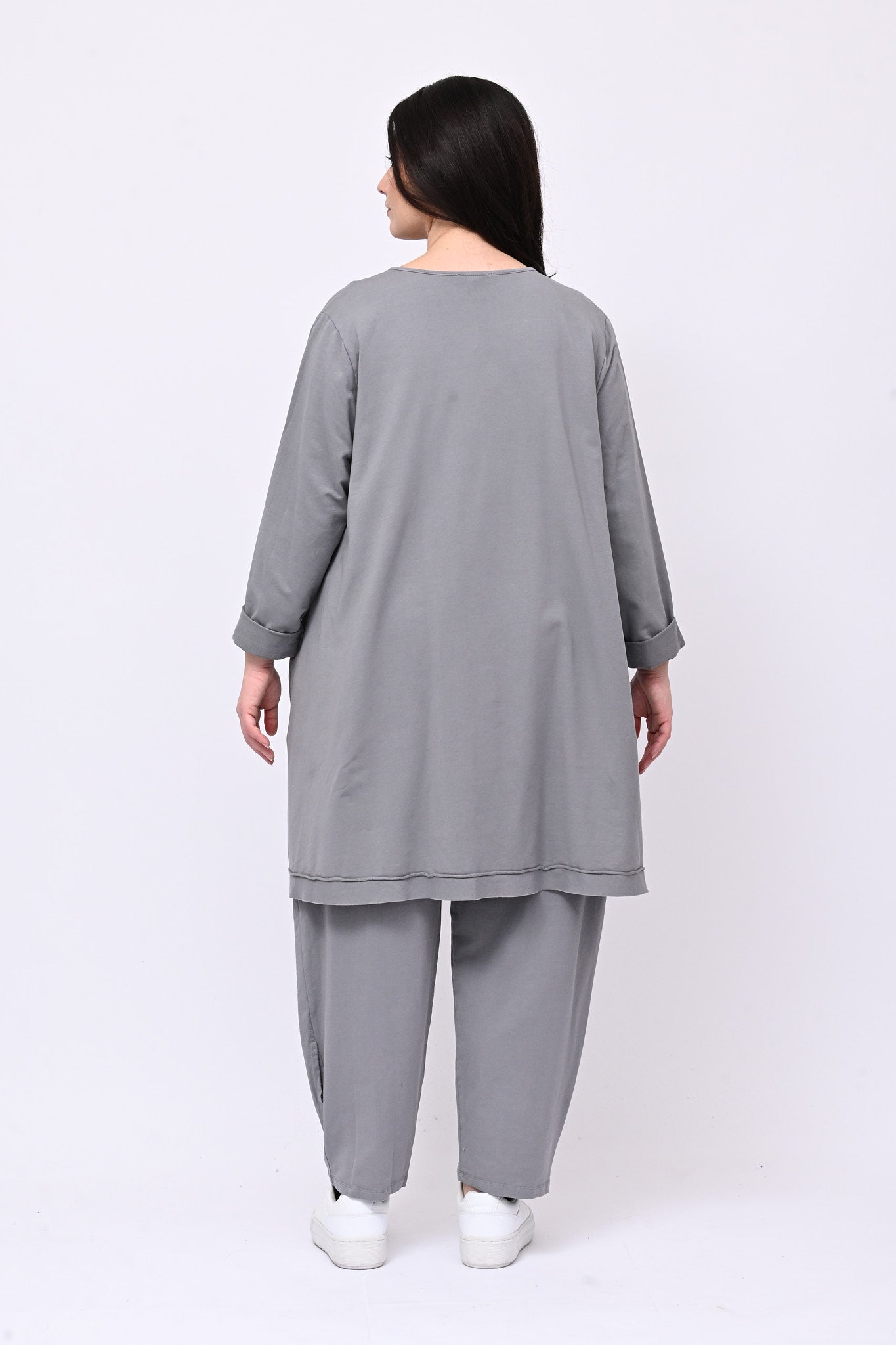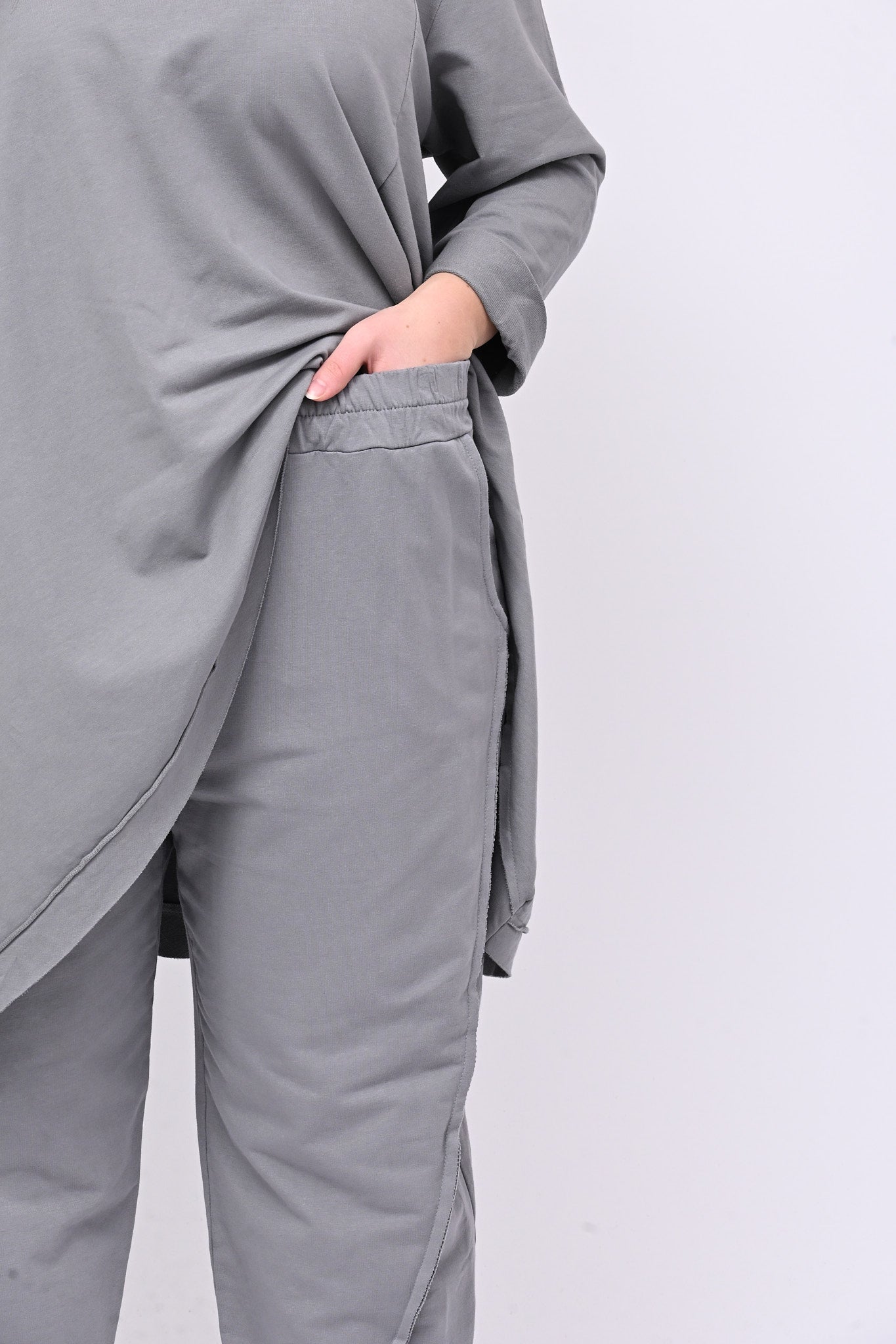 Completo in felpa garzata, composto da: blusa manica lunga dal taglio asimmetrico sul fondo e pantalone modello carota. Il coordinato è caratterizzato da giochi di cuciture che creano dettaglio e originalità. Comodo e trendy, è ideale per un look casual e urbani.