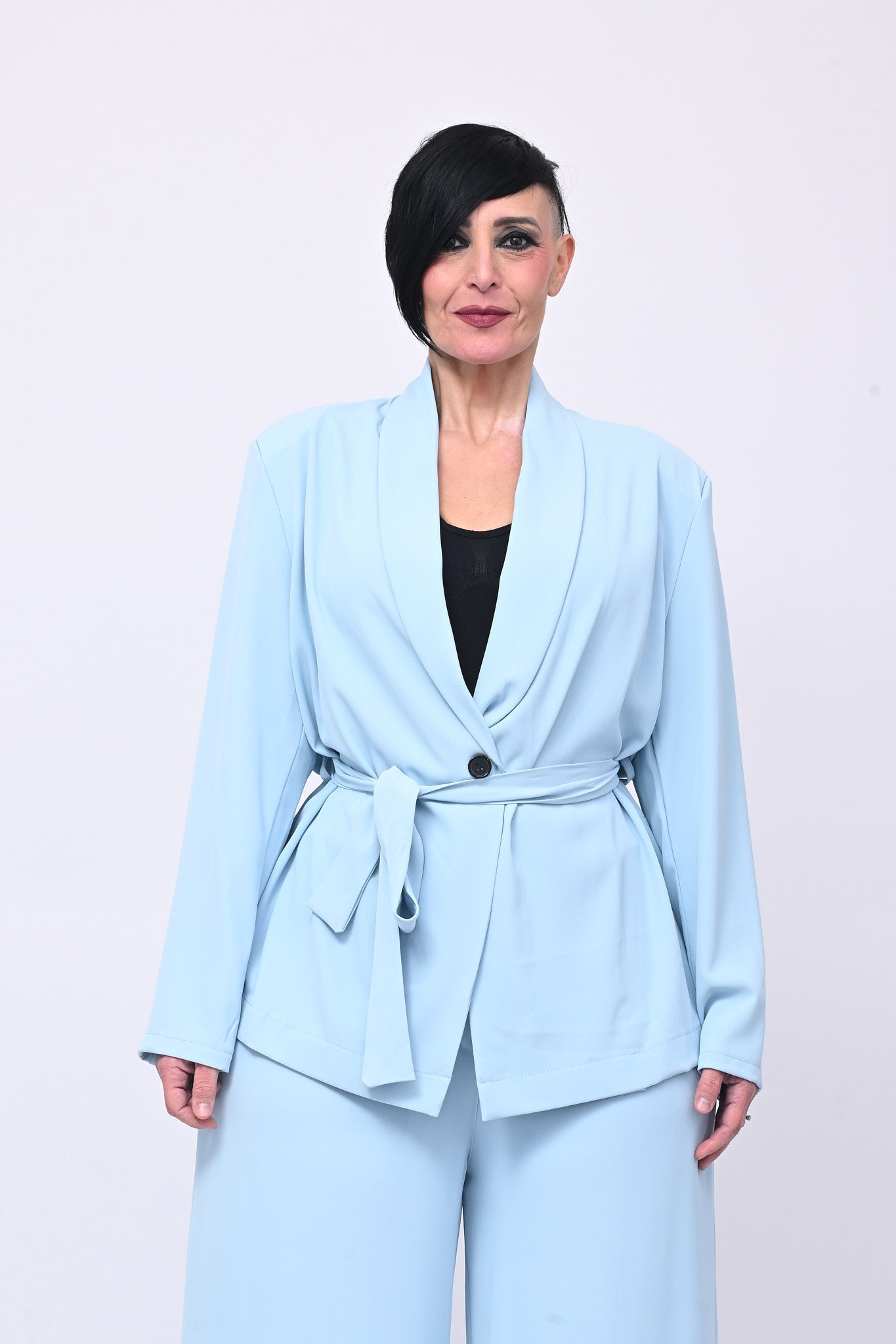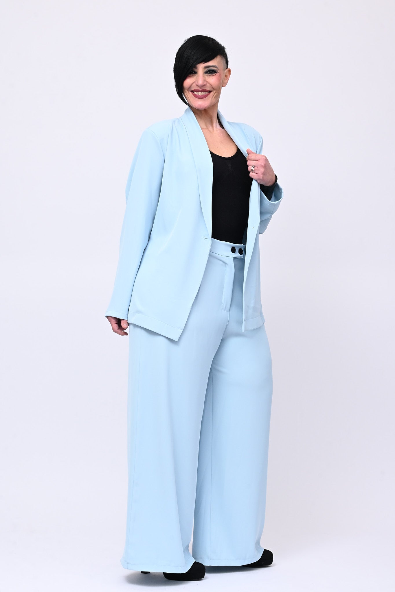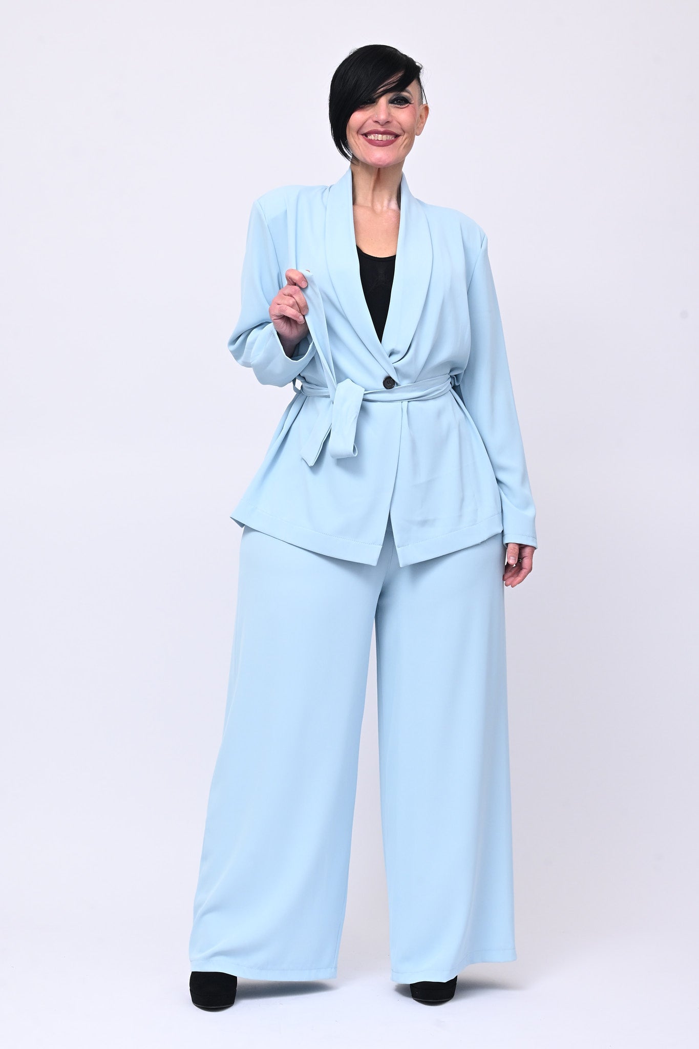 Tailleur in cadì, composto da: giacca monobottone, con rever, spalline e cinta in vita. Il pantalone è modello palazzo, con elastico in vita. La vestibilità del completo è morbida e scivolata e garantisce massima comodità ed eleganza contemporanea. Ideale per look easy chic raffinati e di tendenza.