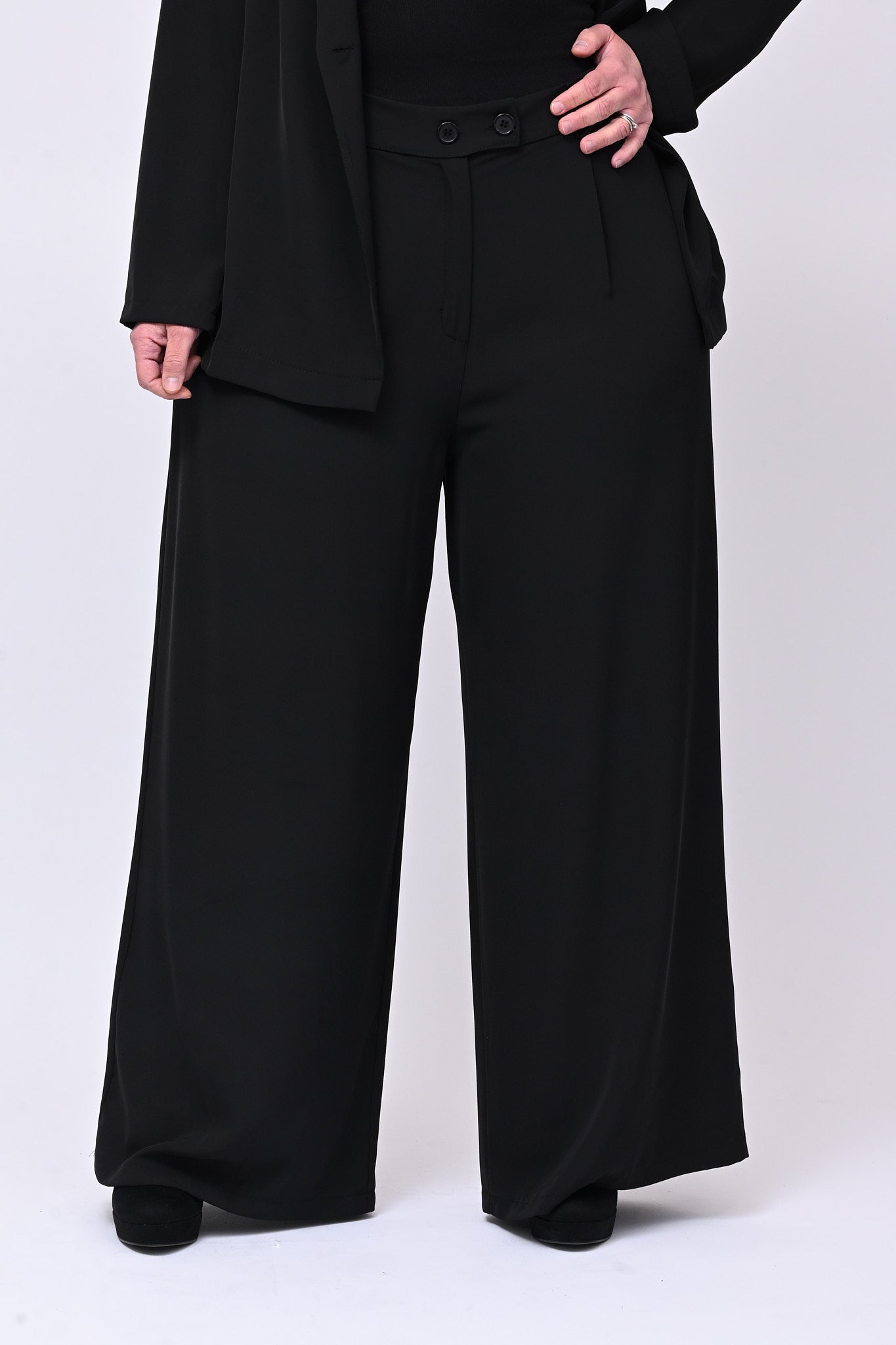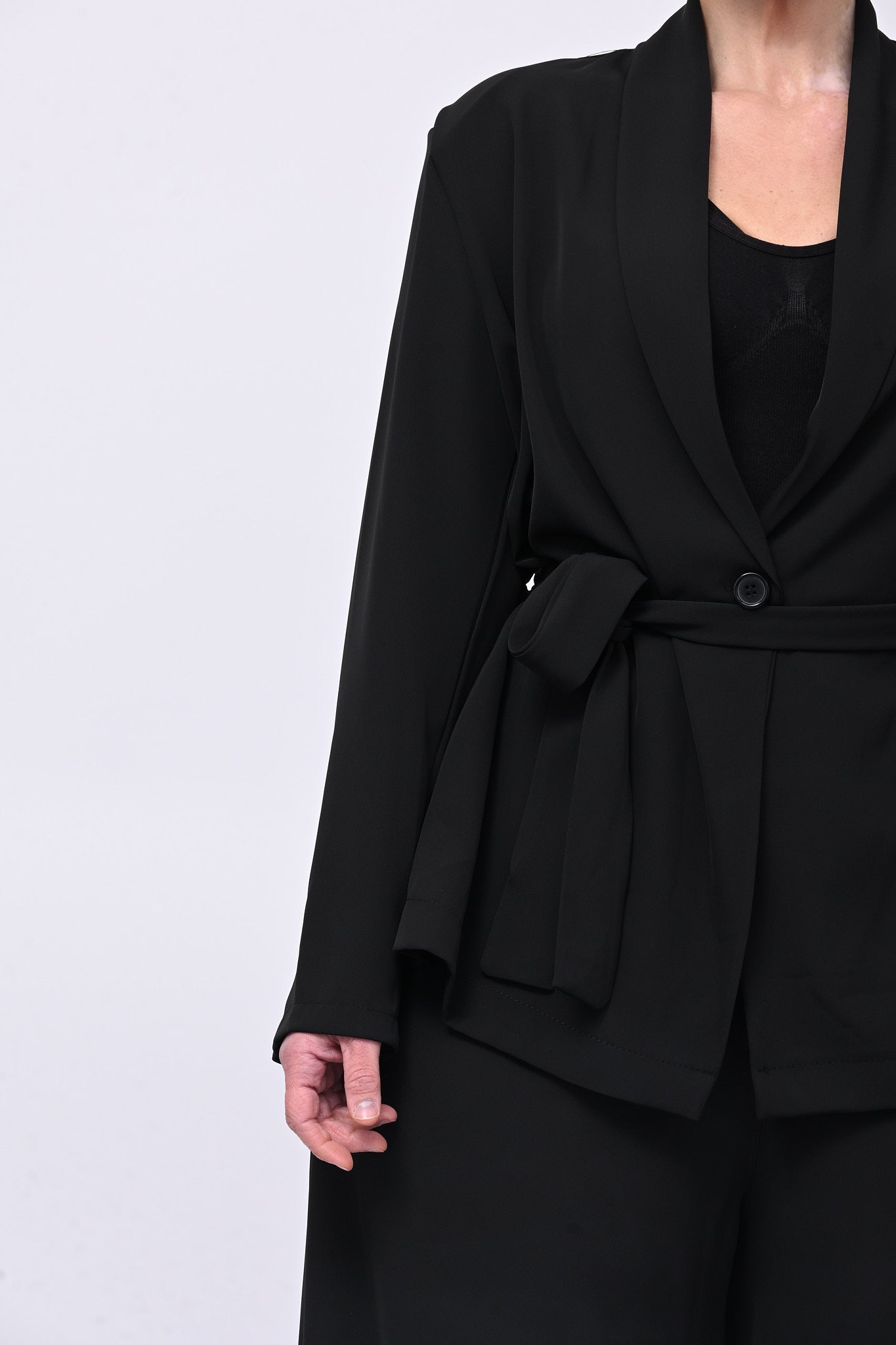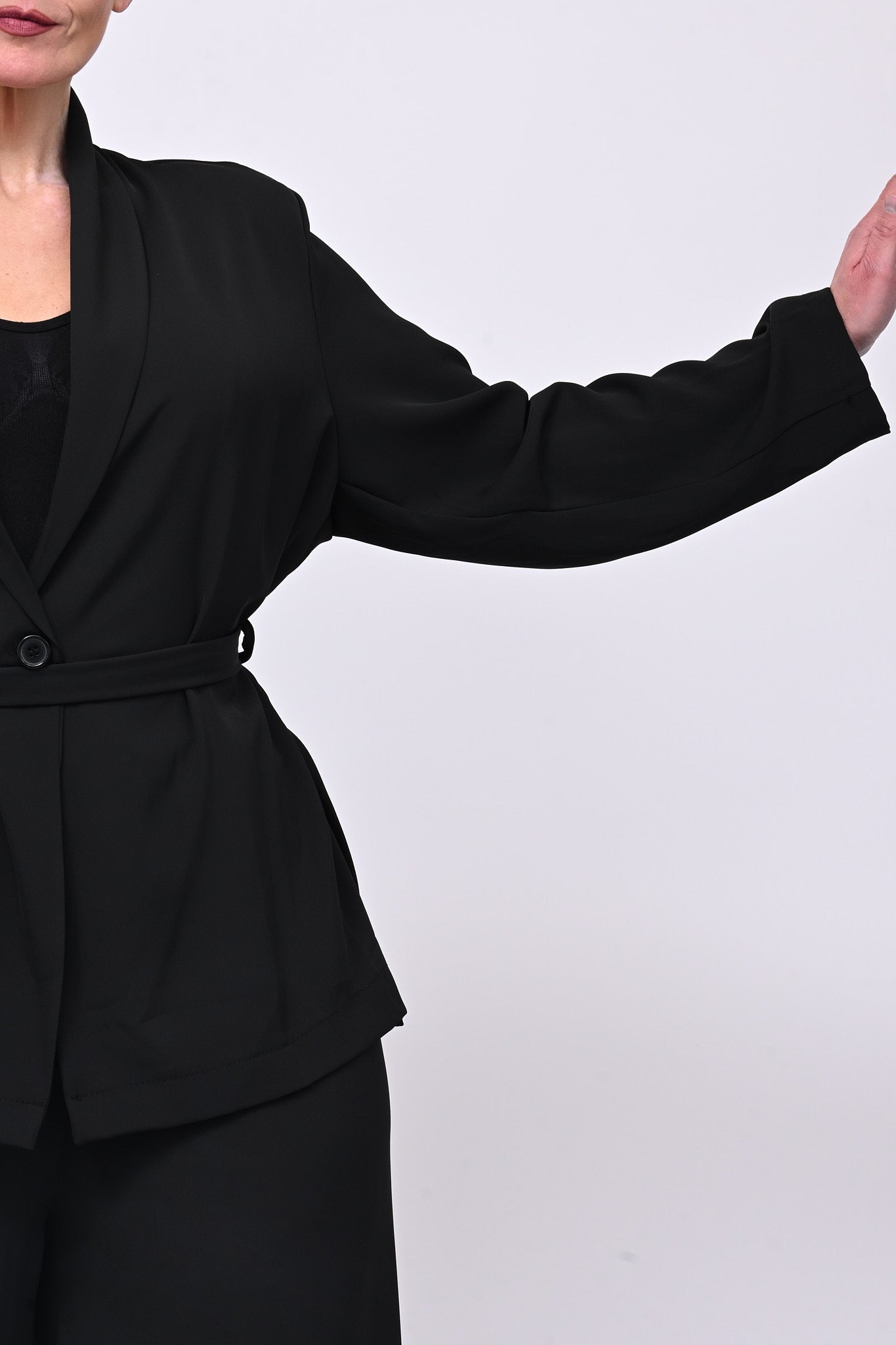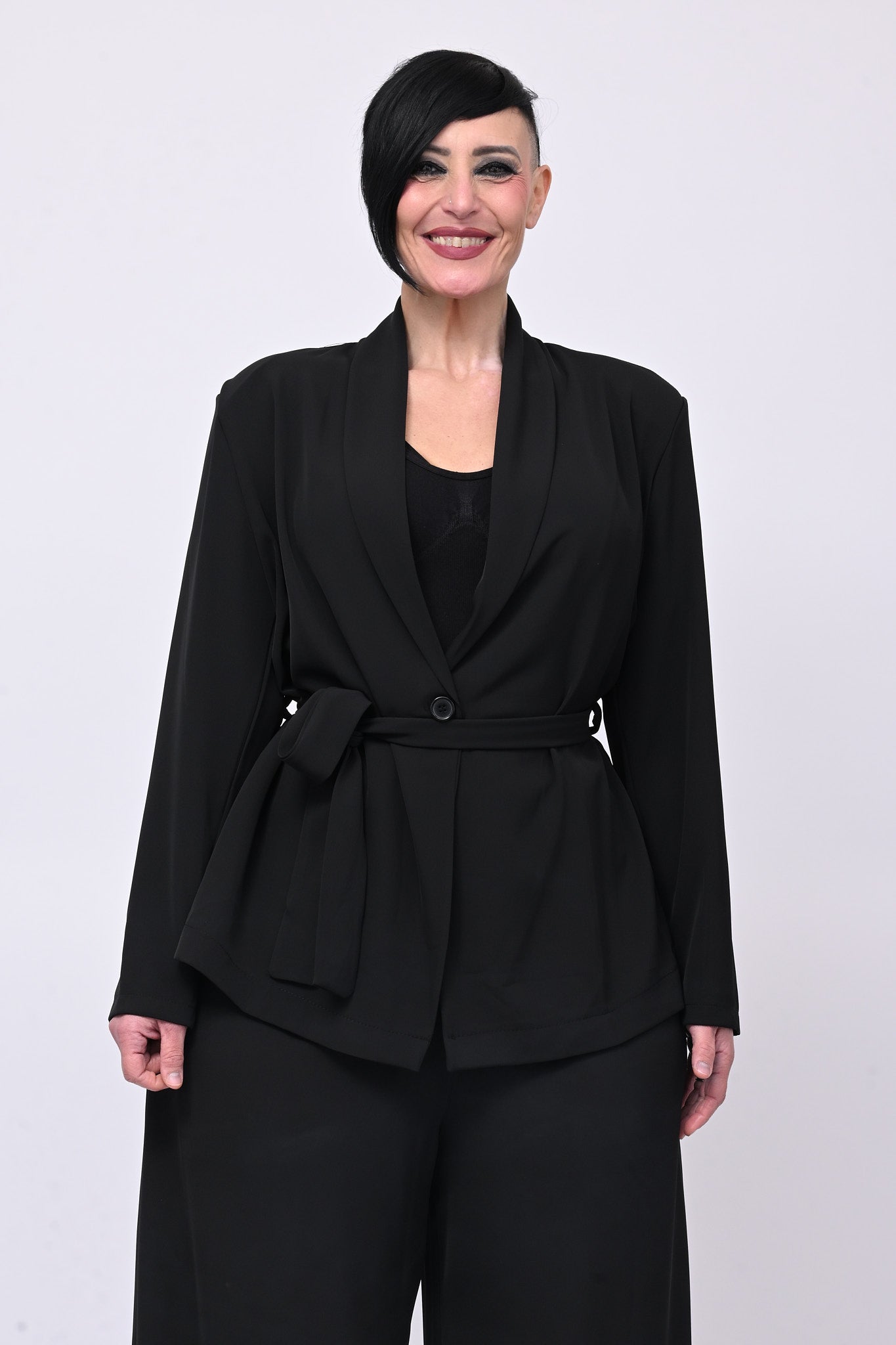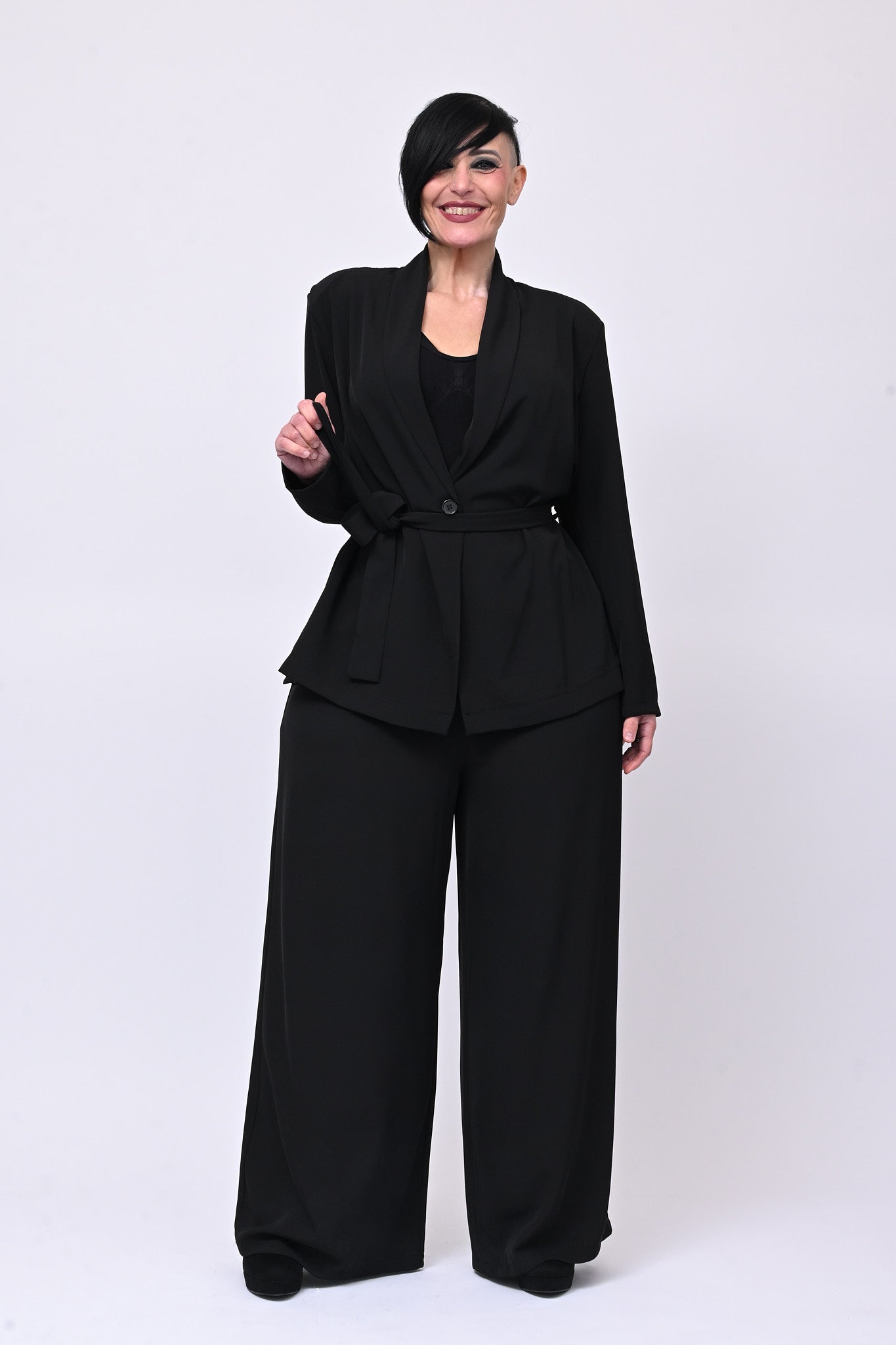 Tailleur in cadì, composto da: giacca monobottone, con rever, spalline e cinta in vita. Il pantalone è modello palazzo, con elastico in vita. La vestibilità del completo è morbida e scivolata e garantisce massima comodità ed eleganza contemporanea. Ideale per look easy chic raffinati e di tendenza.