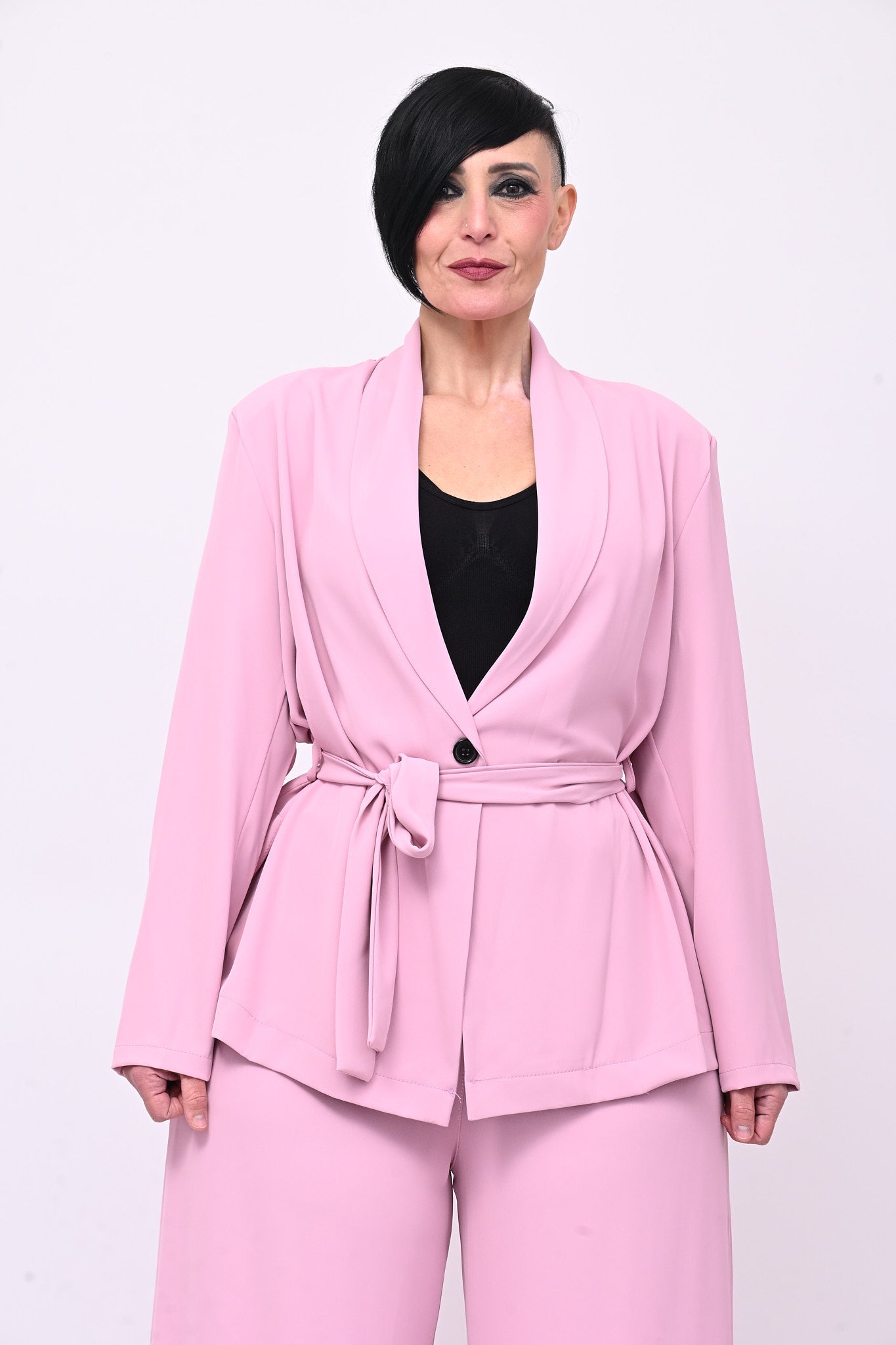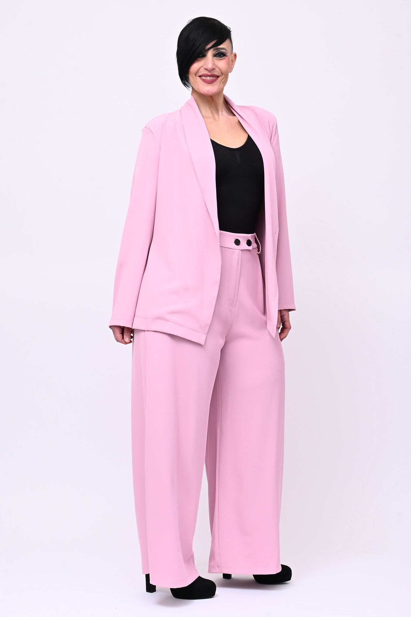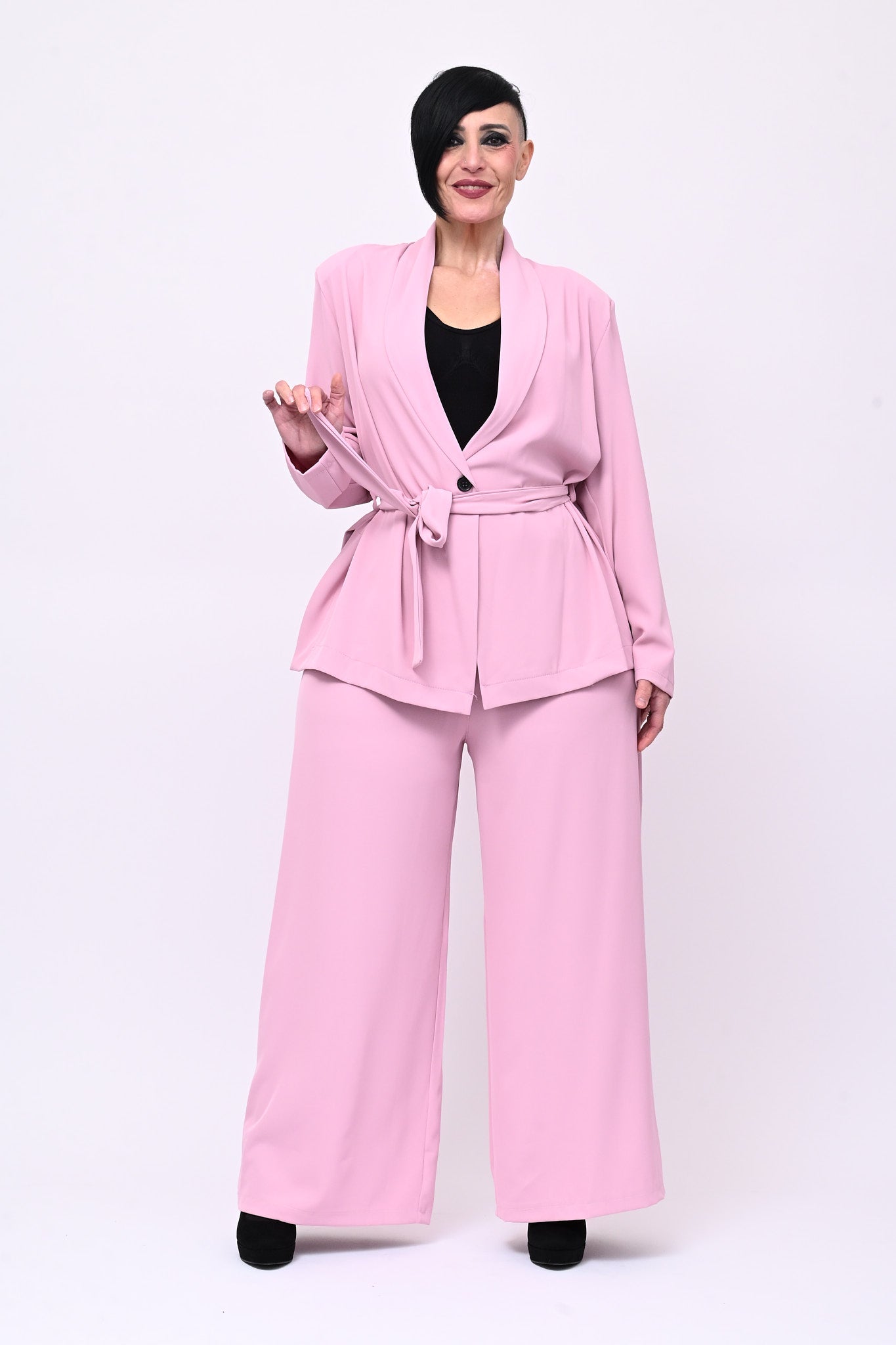 Tailleur in cadì, composto da: giacca monobottone, con rever, spalline e cinta in vita. Il pantalone è modello palazzo, con elastico in vita. La vestibilità del completo è morbida e scivolata e garantisce massima comodità ed eleganza contemporanea. Ideale per look easy chic raffinati e di tendenza.