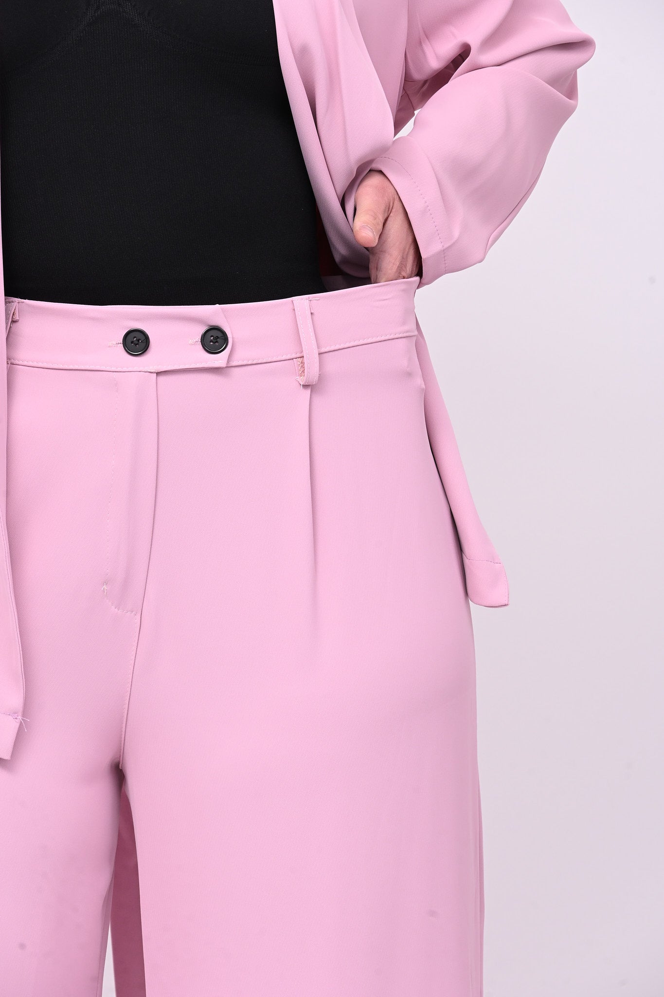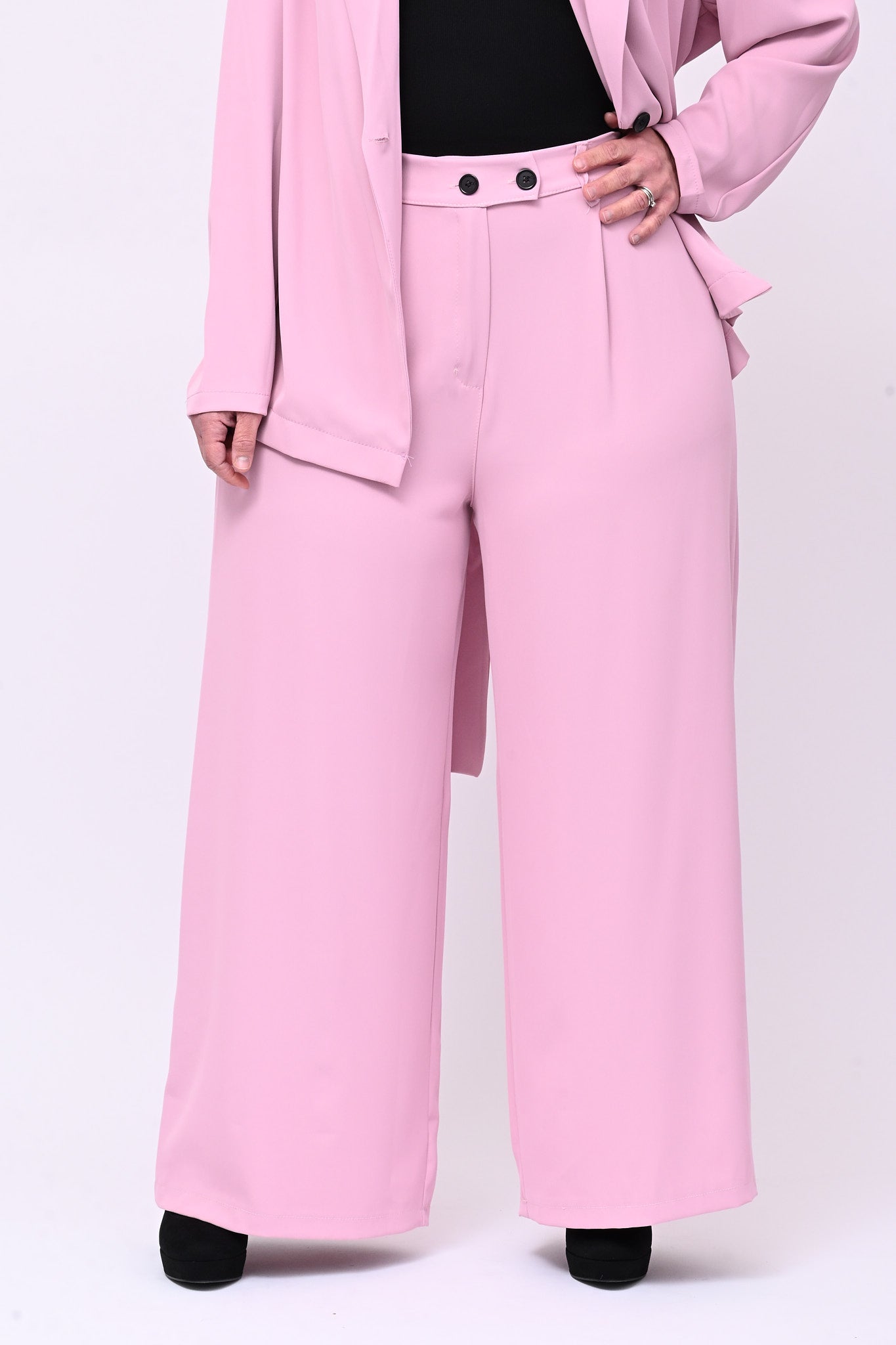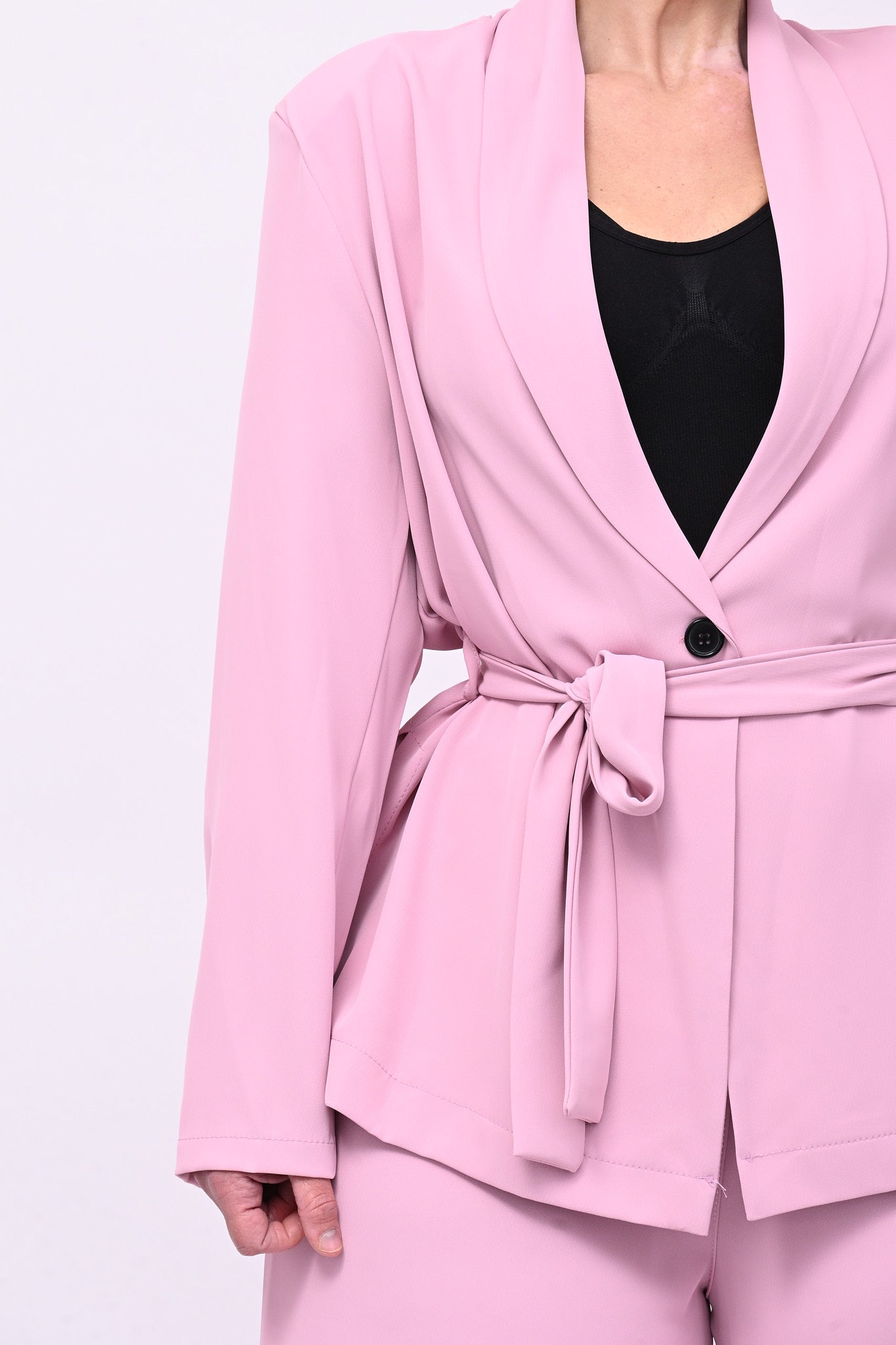 Tailleur in cadì, composto da: giacca monobottone, con rever, spalline e cinta in vita. Il pantalone è modello palazzo, con elastico in vita. La vestibilità del completo è morbida e scivolata e garantisce massima comodità ed eleganza contemporanea. Ideale per look easy chic raffinati e di tendenza.