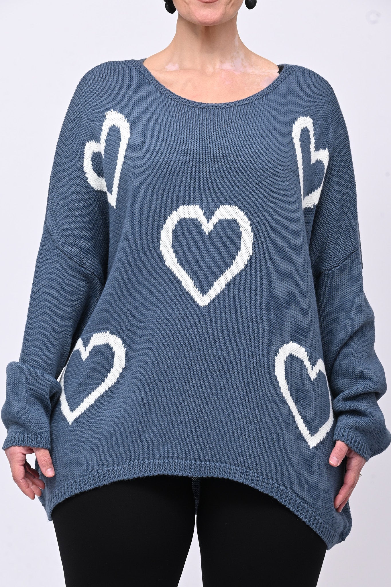 Maxi pull, girocollo e silhouette fluida con fondo arrotondato sul davanti e più lungo dietro. I grandi cuori stampati aggiungono un tocco di personalità e originalità. Pratico e versatile è ideale per creare look casual e easy chic.